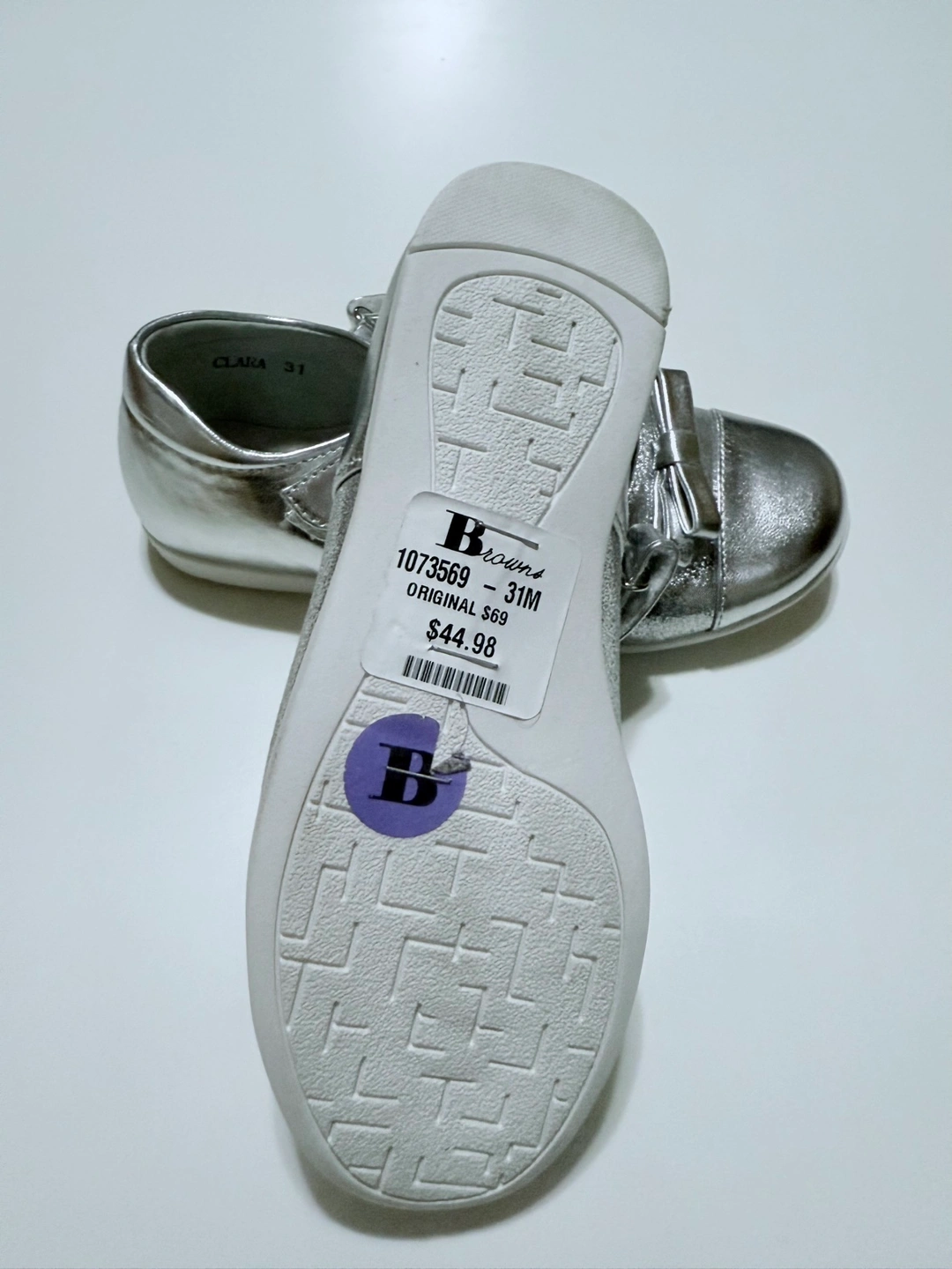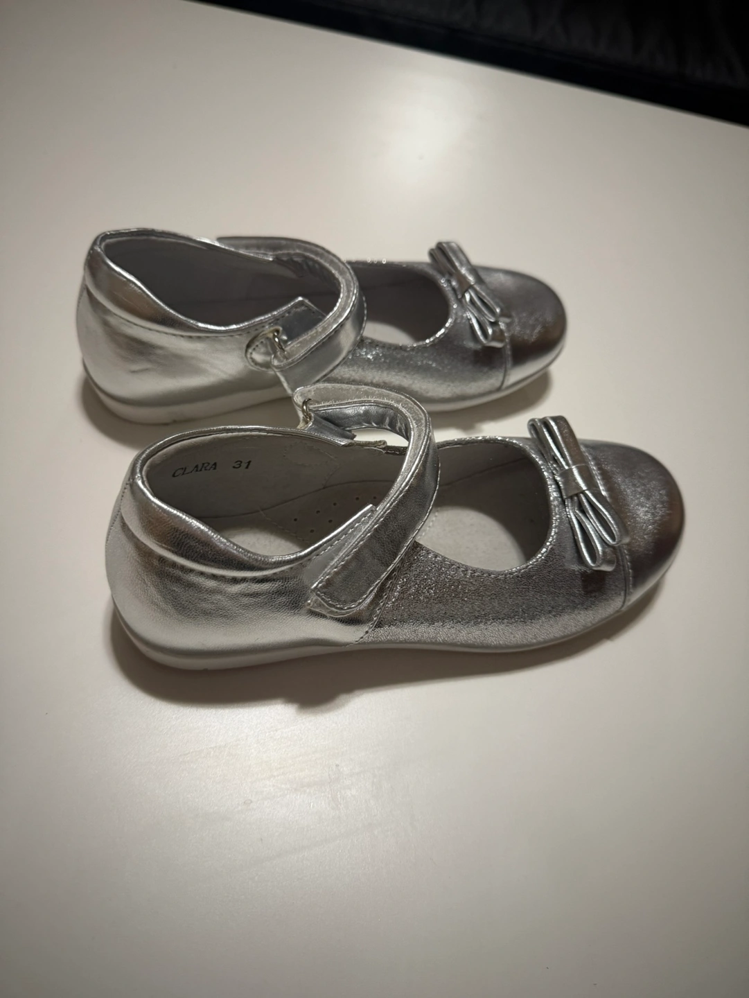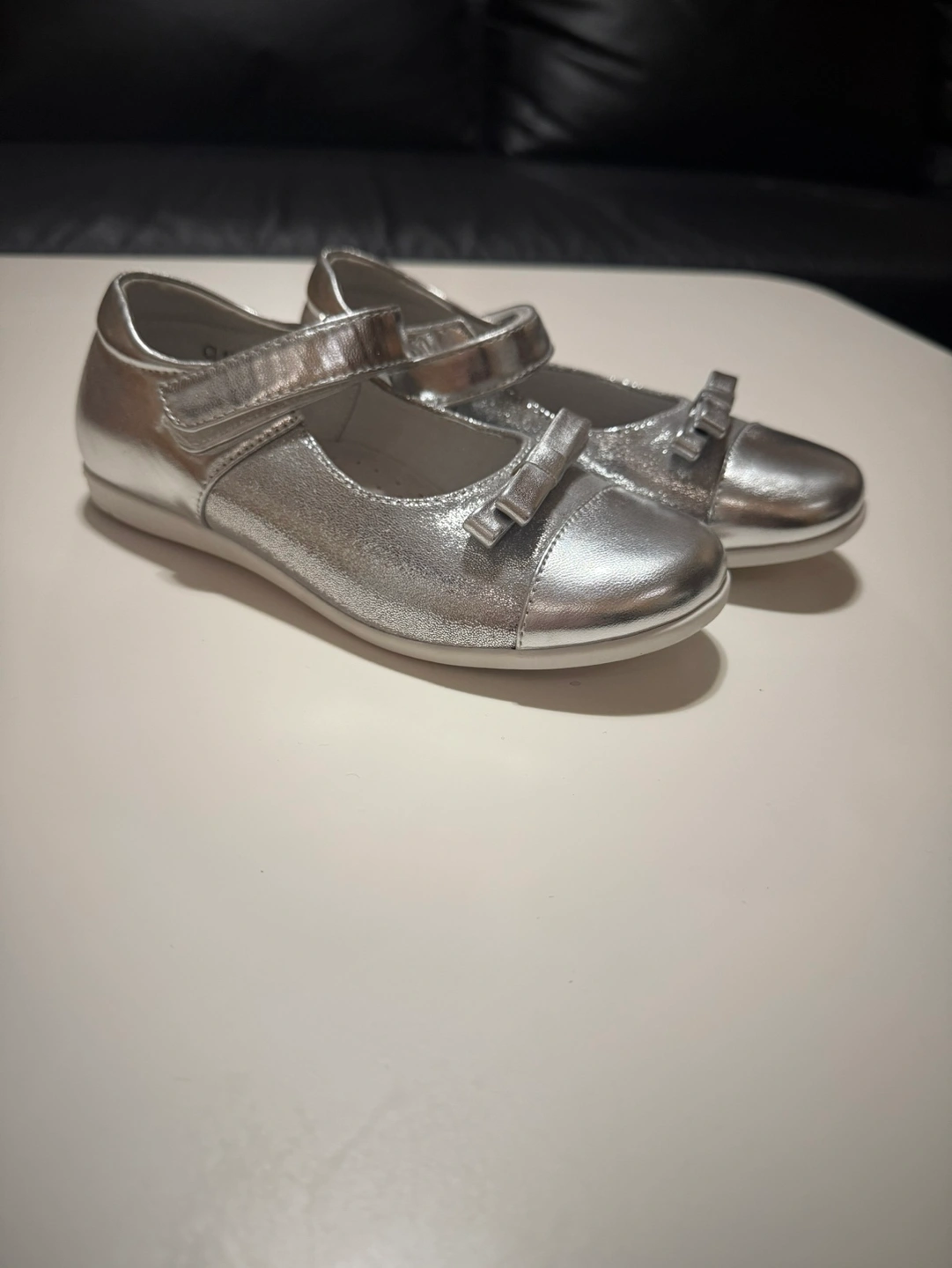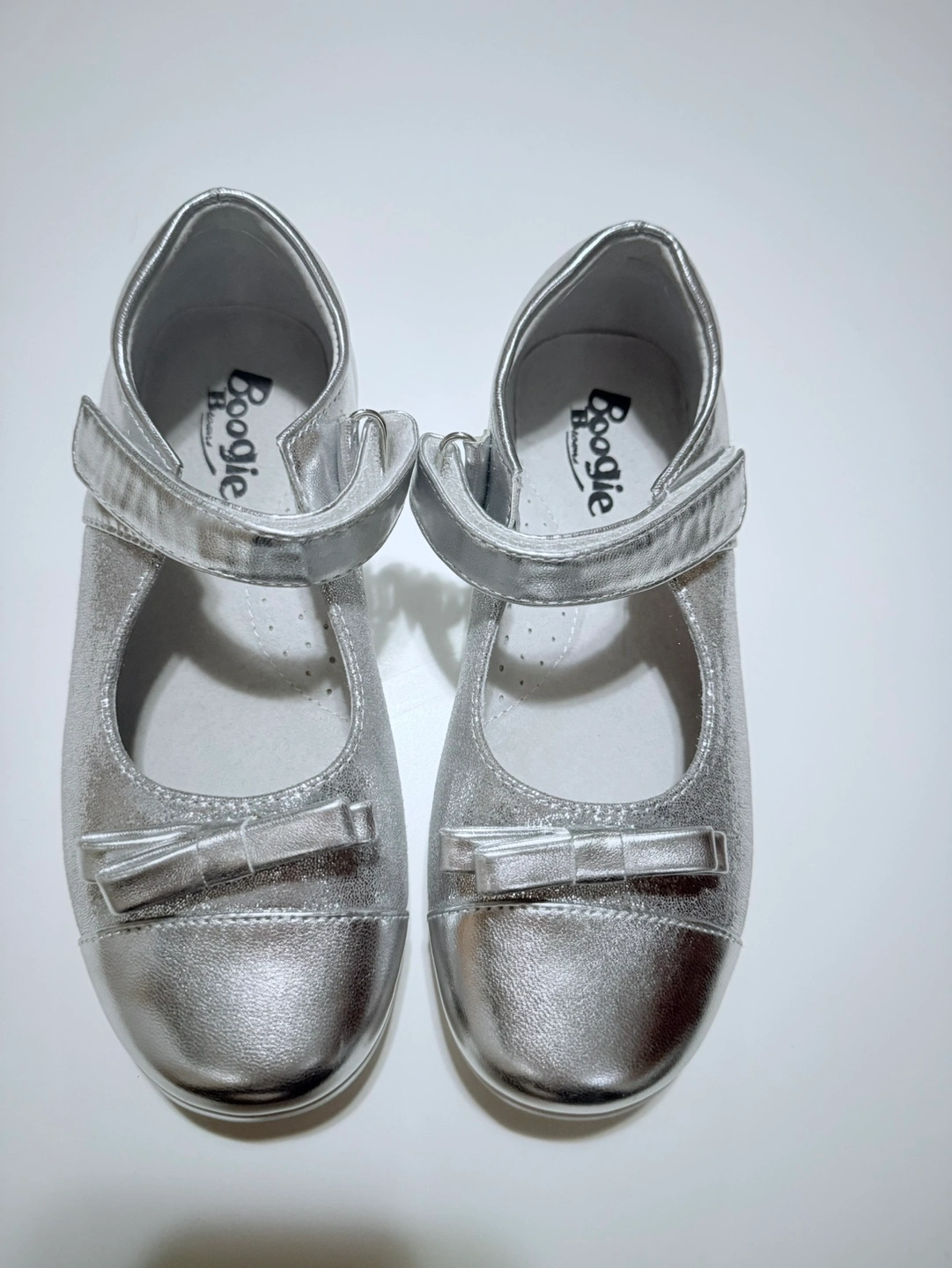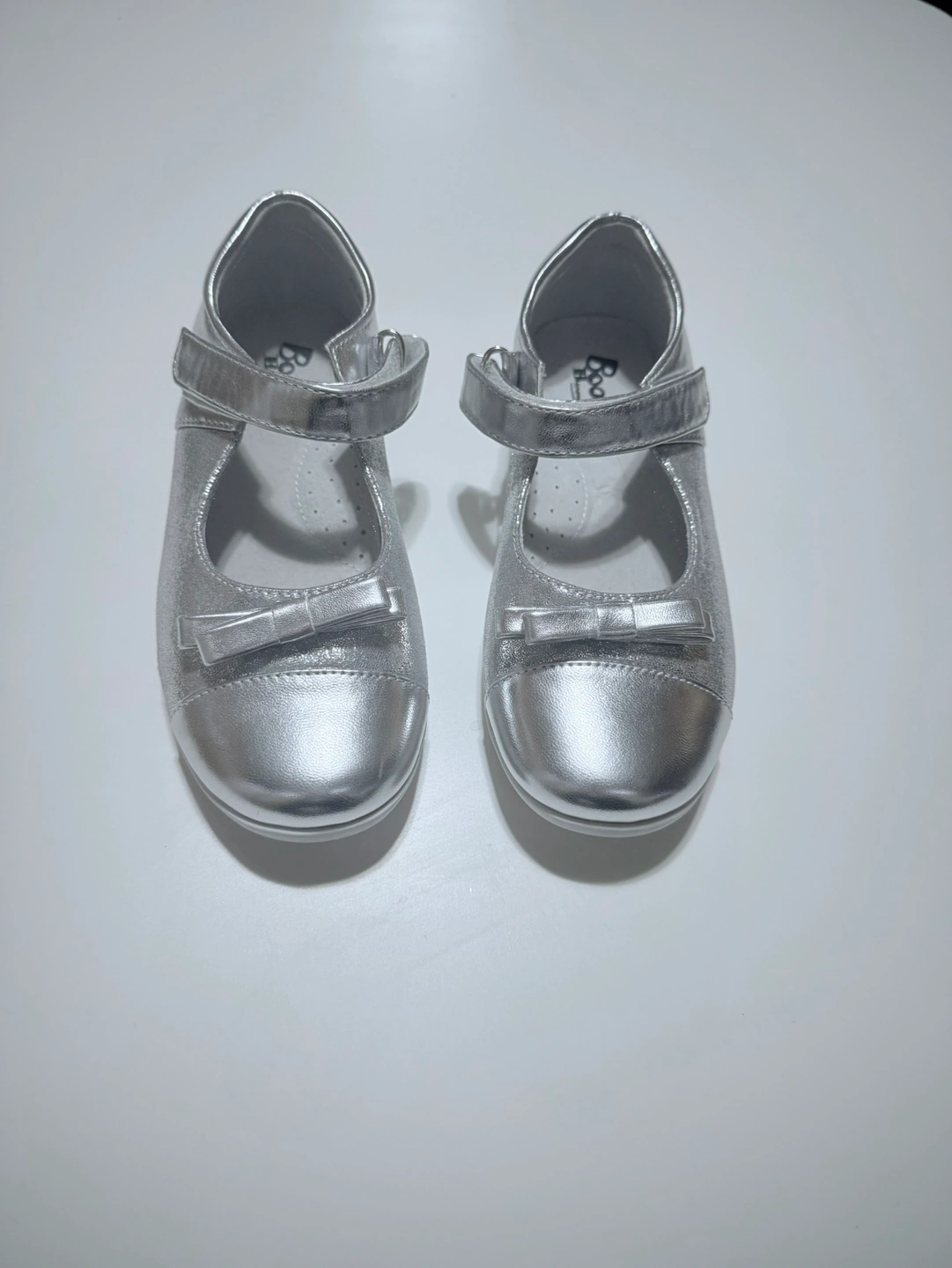 Adorable silver Mary Jane shoes. Suitable for special occasions. Features a small bow detail. Velcro closure.