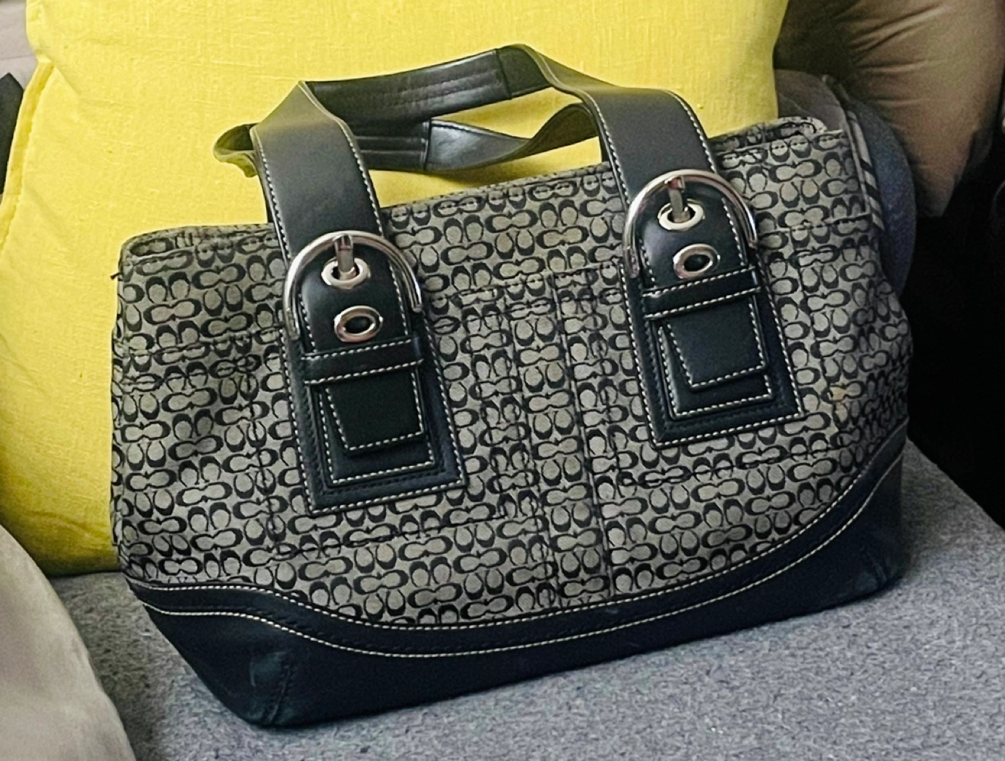 Grey and black signature C pattern. Two front pockets with buckles. Double top handles. Excellent for everyday use.