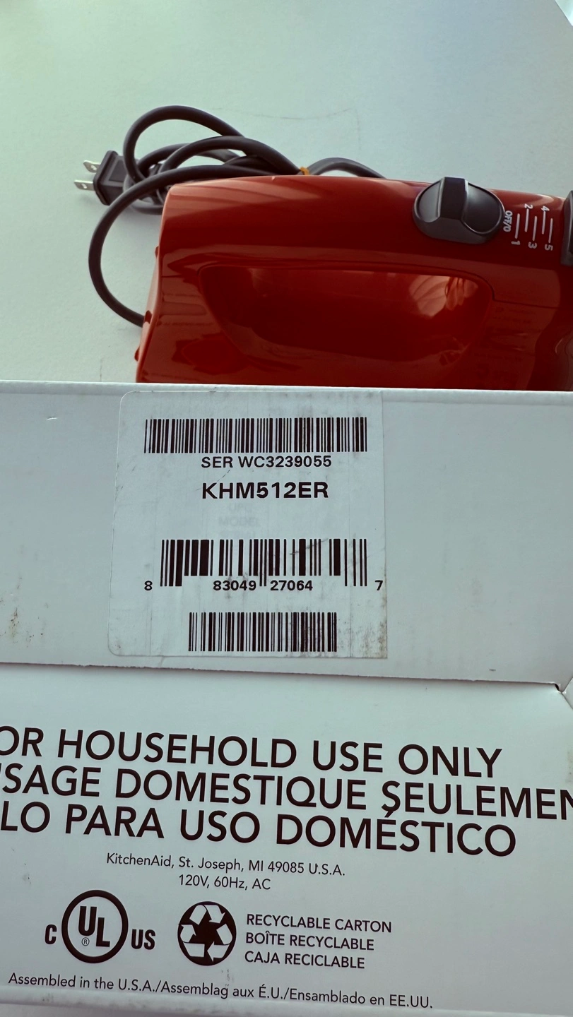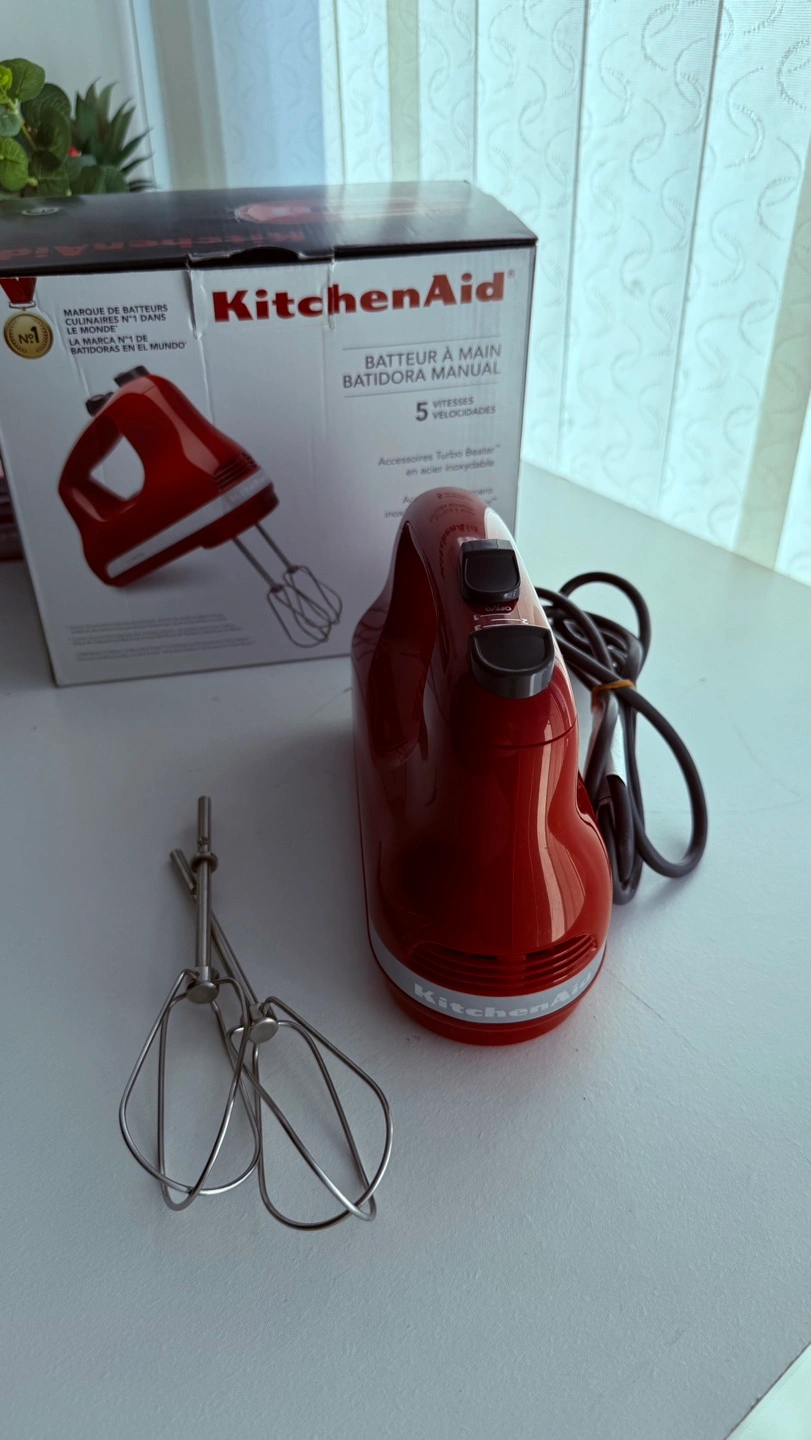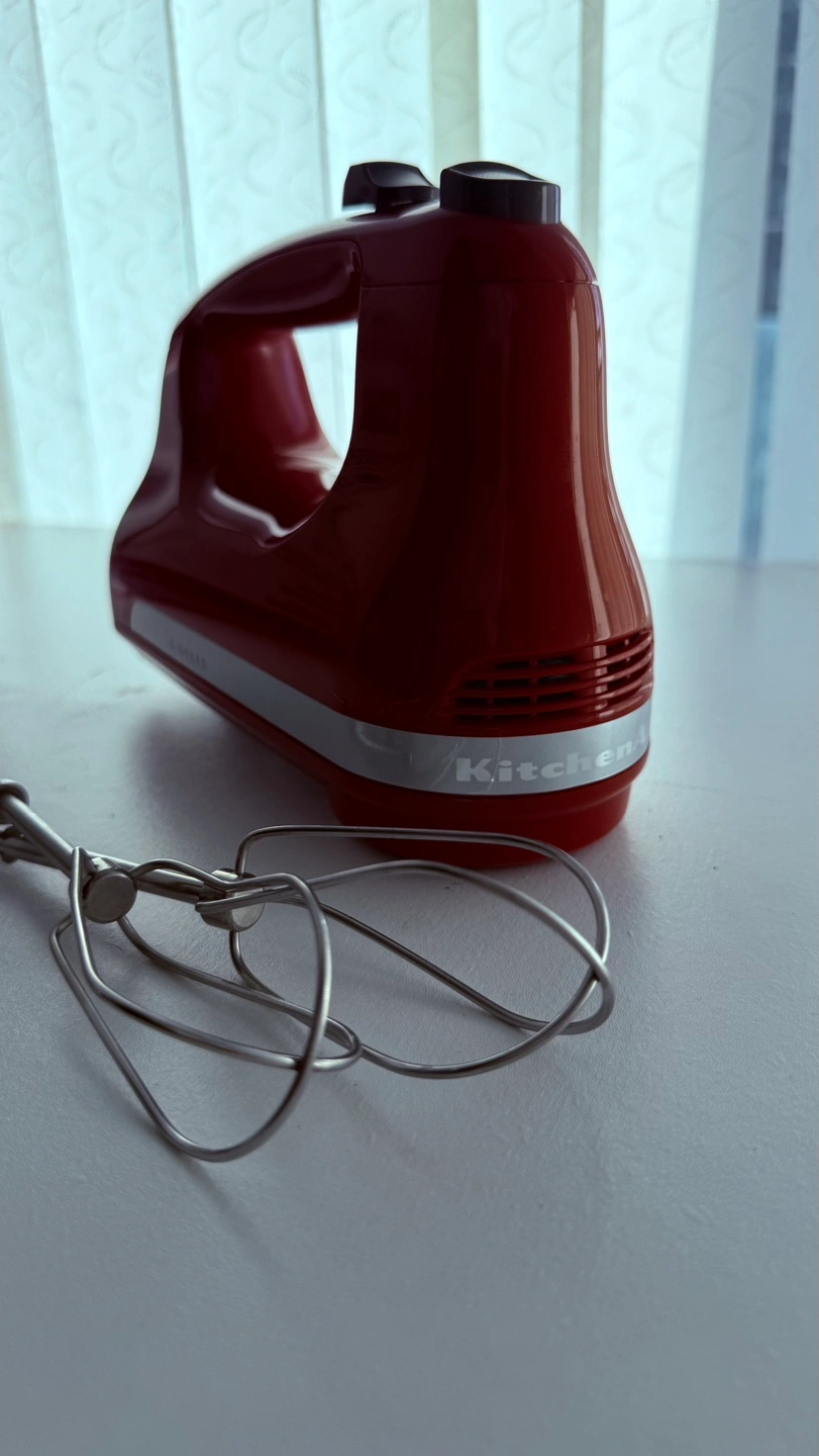 Red KitchenAid hand mixer. Five speeds. Includes beaters. In original box. Gently used.