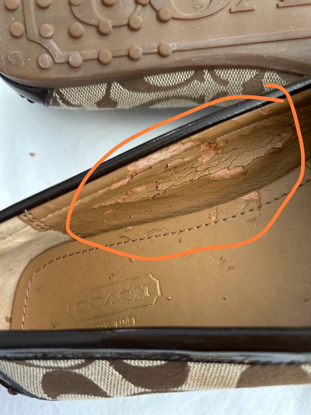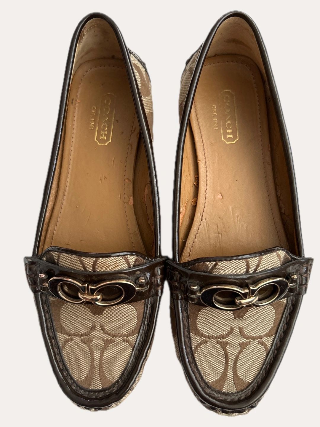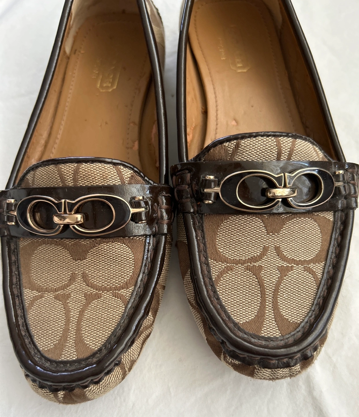 Coach woman’s loafers. Brown patent leather and beige signature Coach canvas. Gold-toned hardware. Please see attached photos very well. Lots of peeling material inside of the shoes on both. While outside of the shoes are actually in good shape. Smoke/Pet free home.