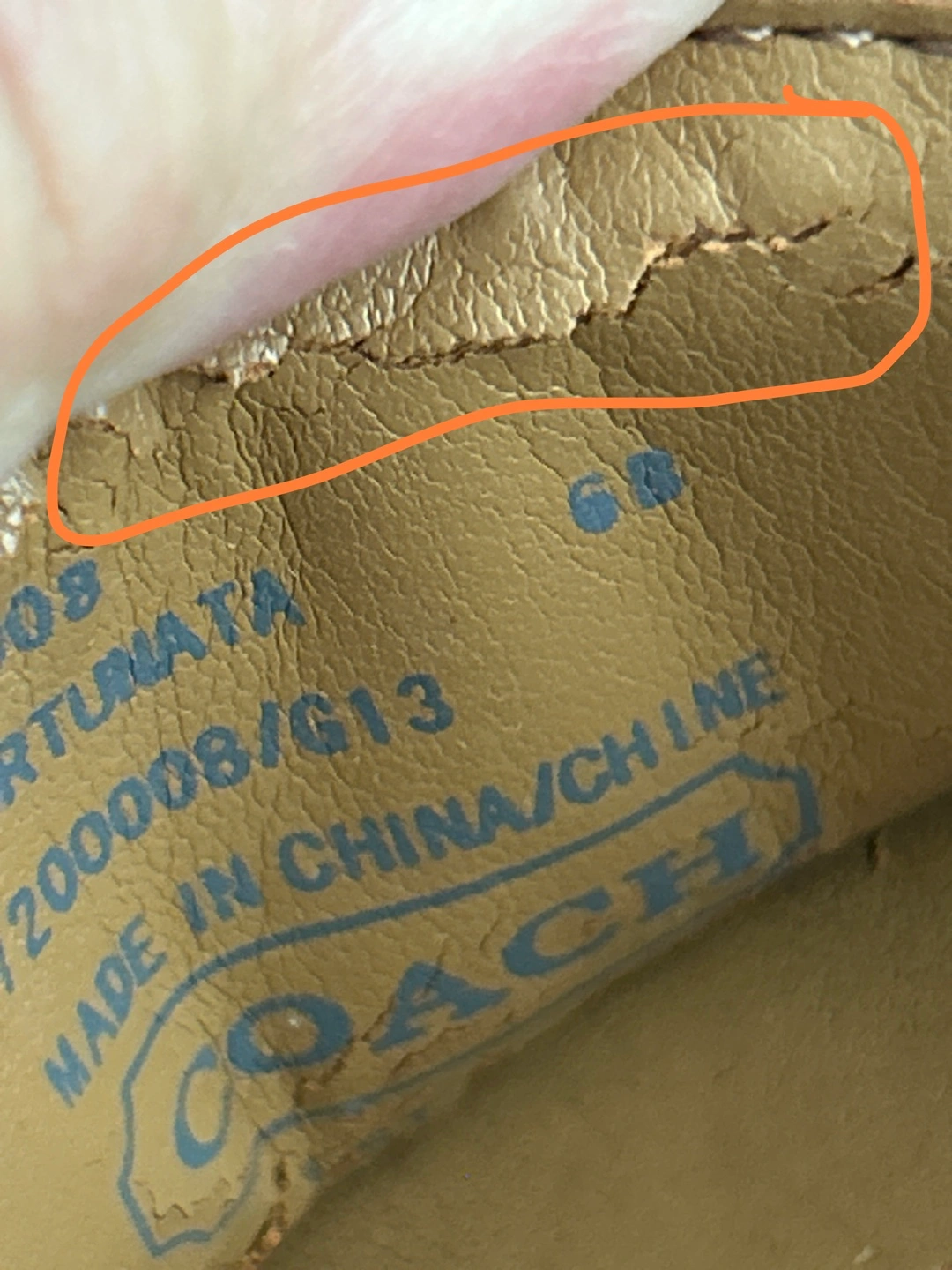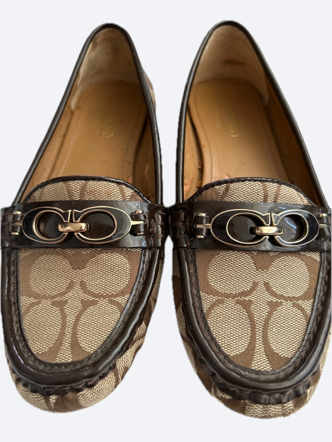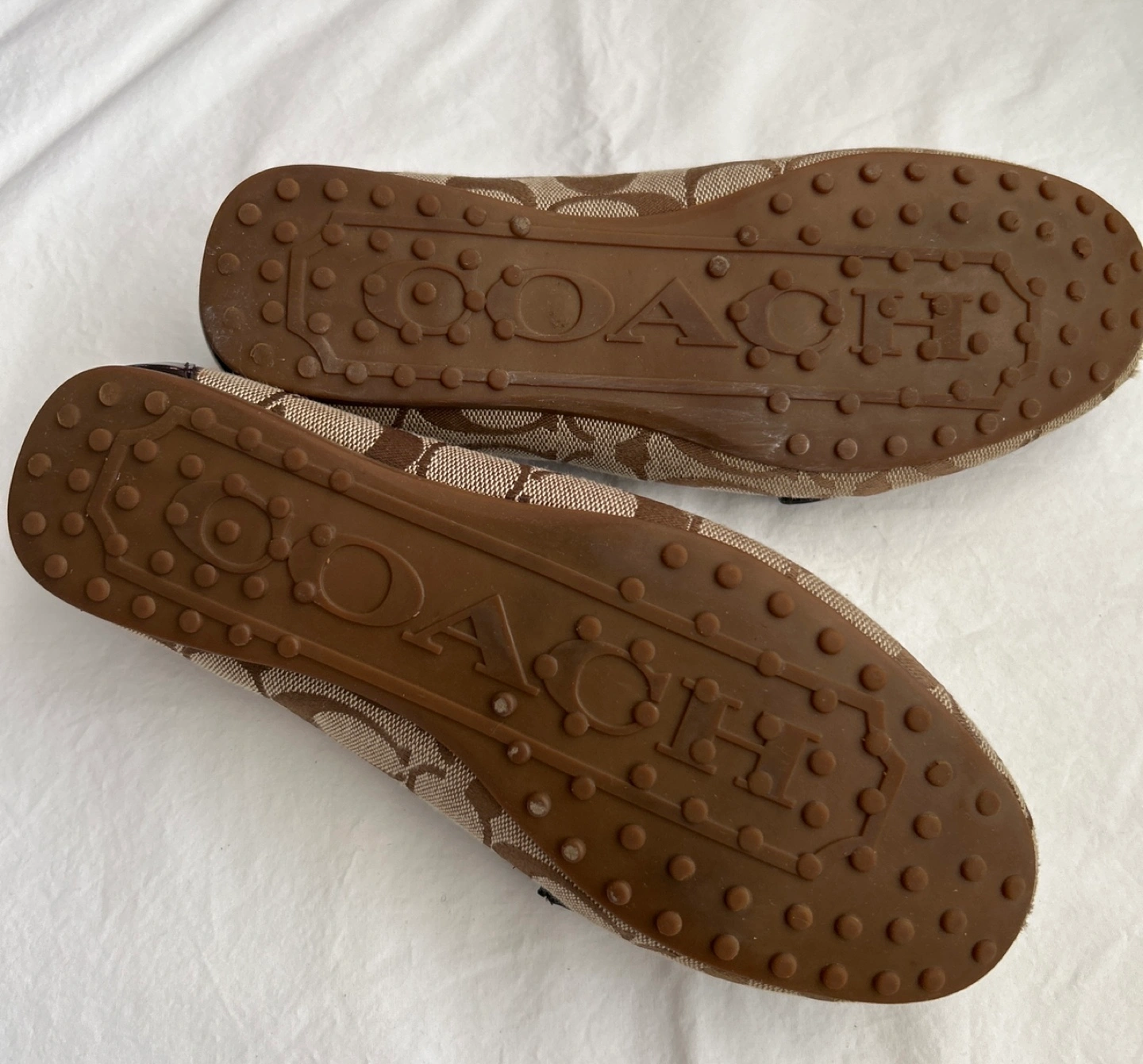 Coach woman’s loafers. Brown patent leather and beige signature Coach canvas. Gold-toned hardware. Please see attached photos very well. Lots of peeling material inside of the shoes on both. While outside of the shoes are actually in good shape. Smoke/Pet free home.