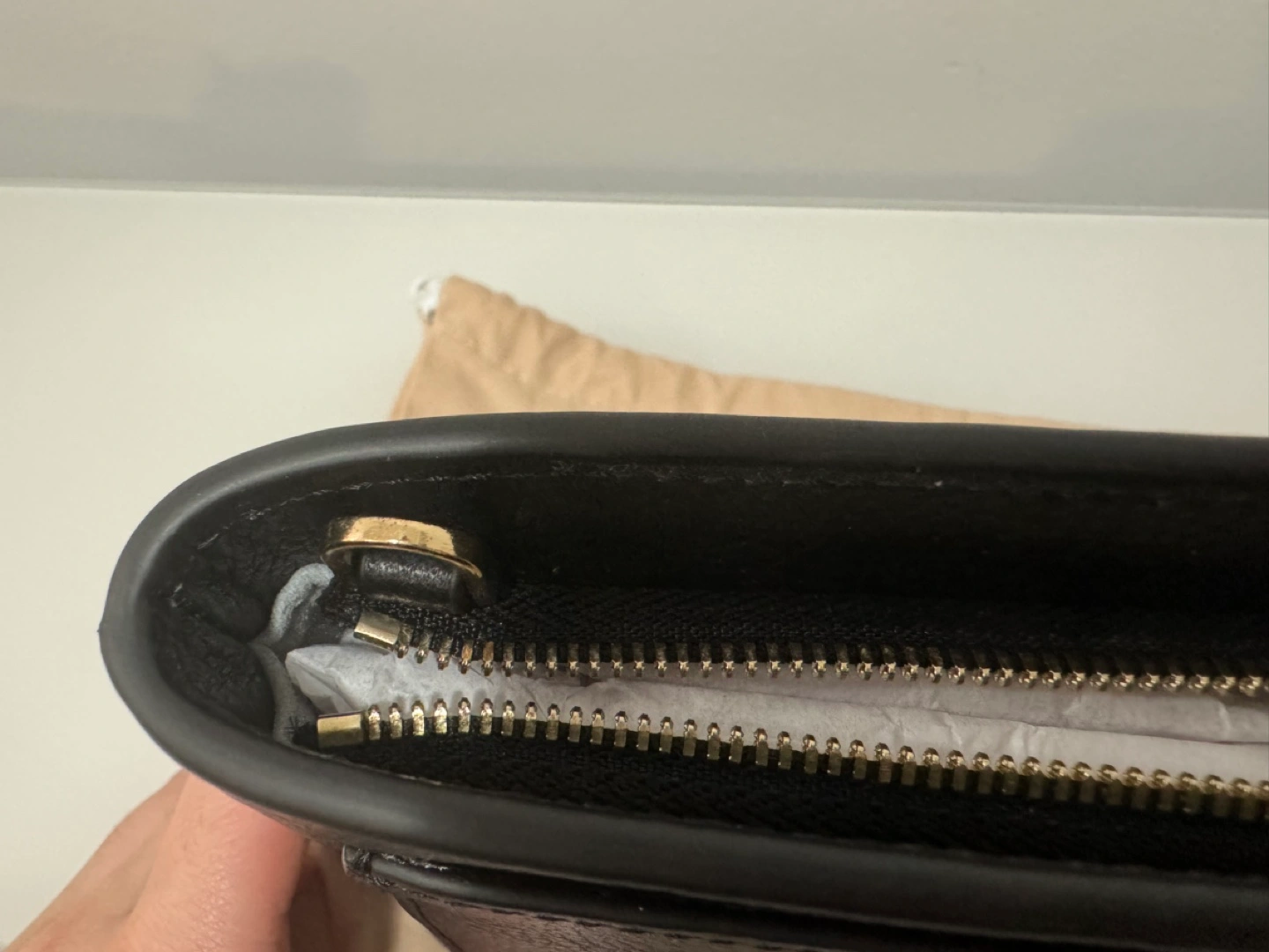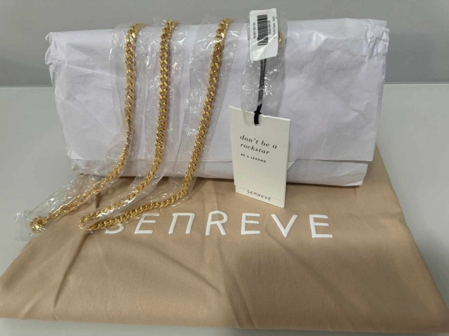 Came with unnoticeable flaws at the gold hardware hooks (specks in coating) where the chain is supposed to be attached. Chain packaged separately with no flaws.