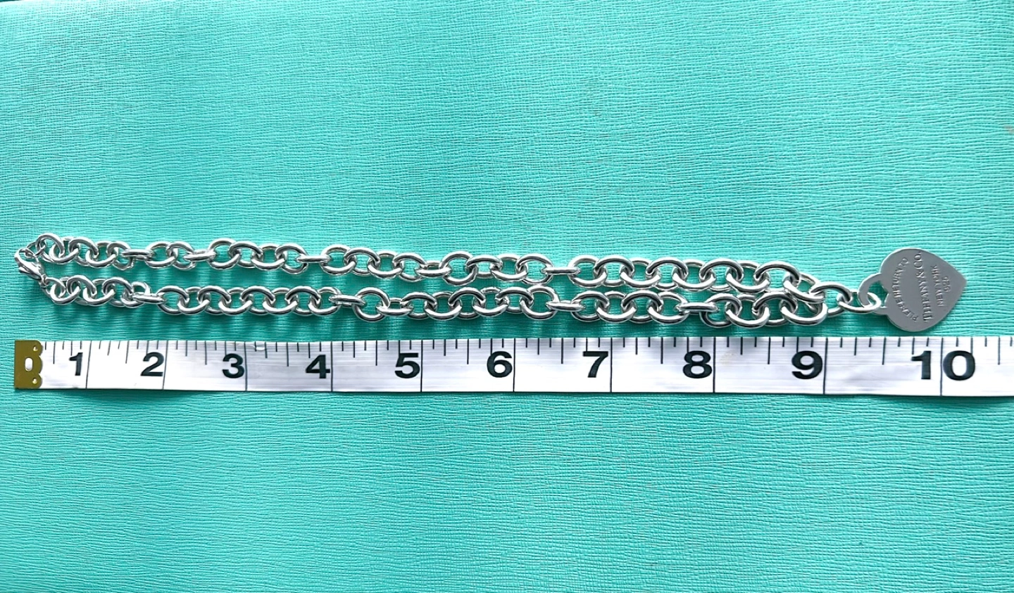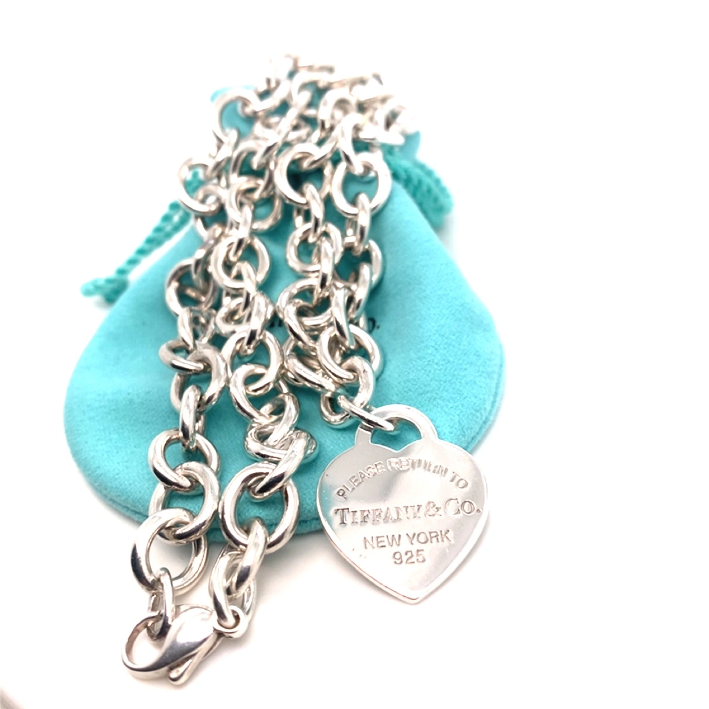 Please note the added 2 inches cost an extra $300 from the store. Beautiful sterling silver necklace. Features a classic heart tag pendant and a substantial link chain. Comes with a Tiffany blue pouch.