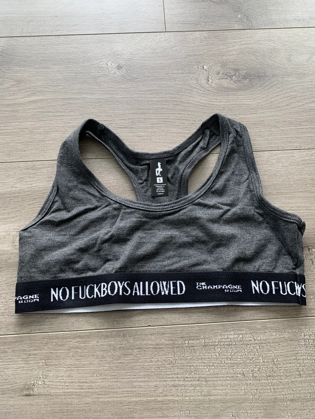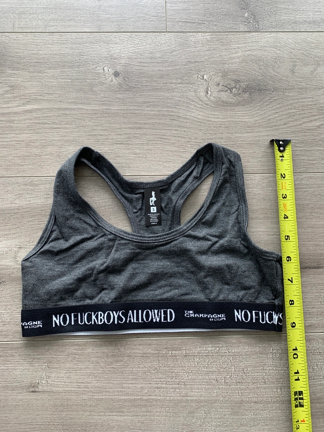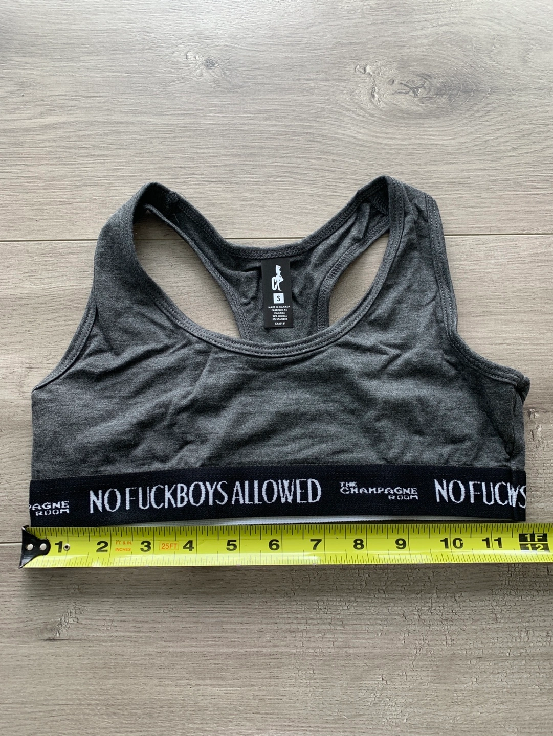 Grey sports bra. Size small. Racerback style. Made in Canada. 95% modal, 5% spandex. Features a band with the phrase "No Fuckboys Allowed". Size small. Fits extra small.