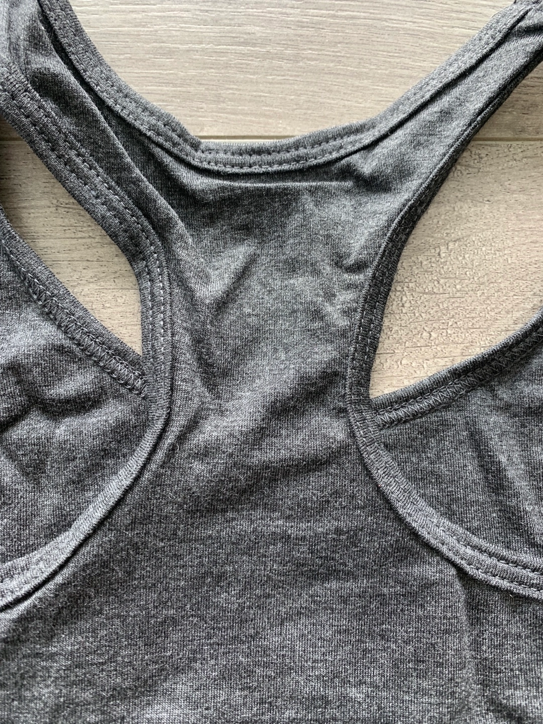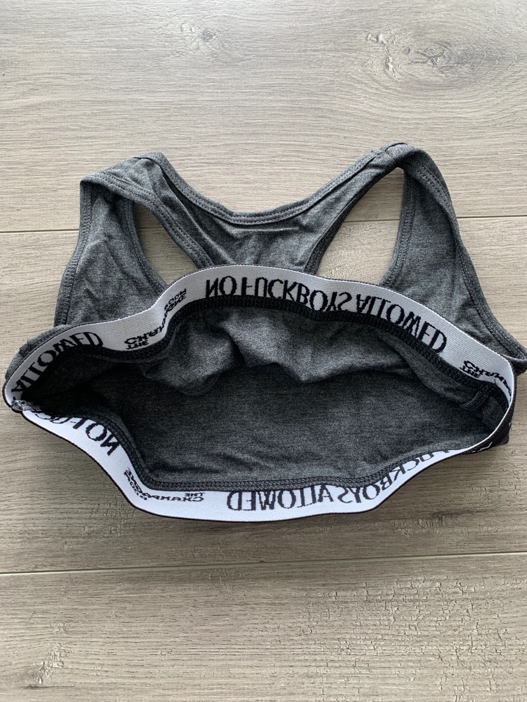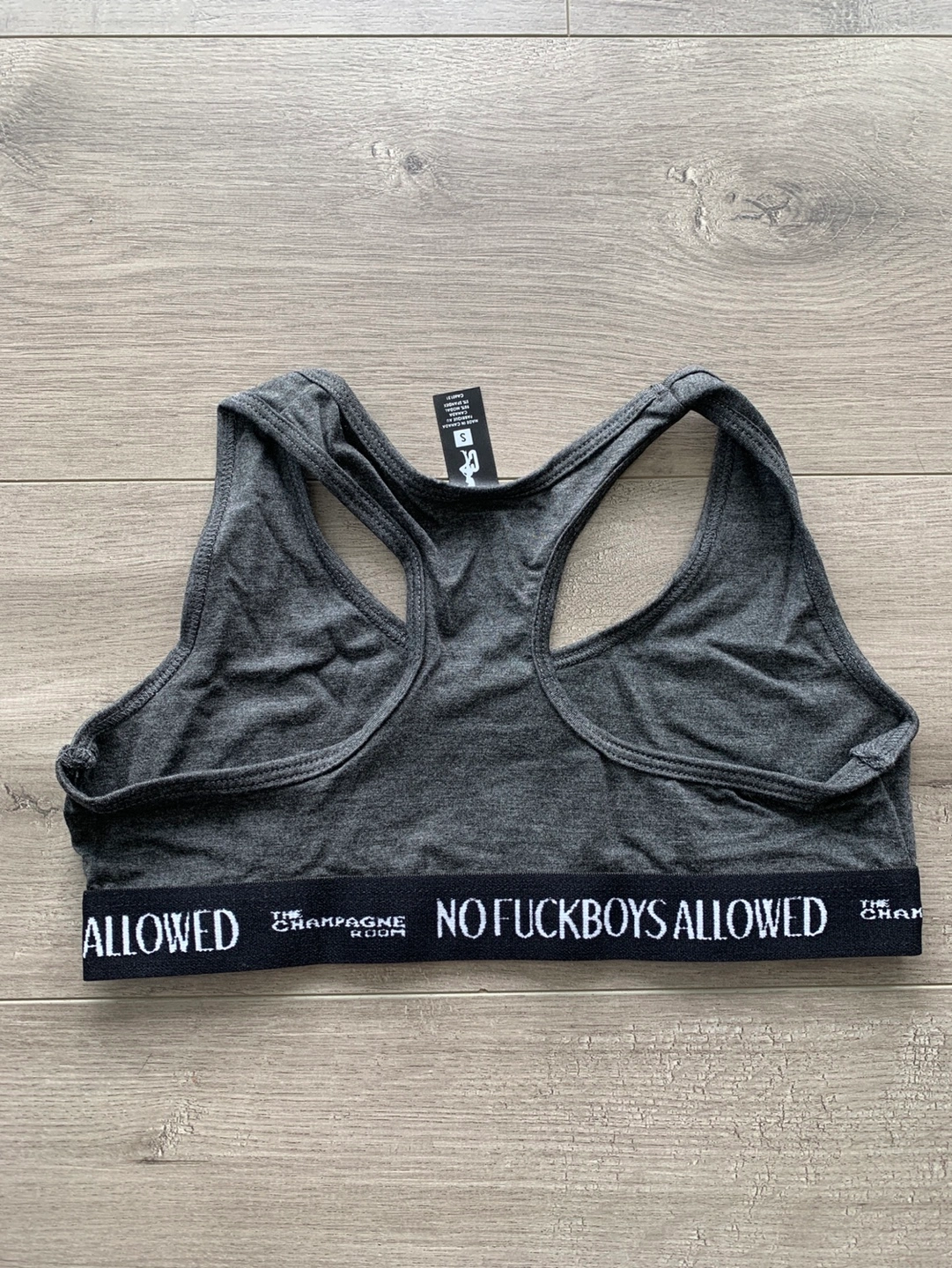 Grey sports bra. Size small. Racerback style. Made in Canada. 95% modal, 5% spandex. Features a band with the phrase "No Fuckboys Allowed". Size small. Fits extra small.