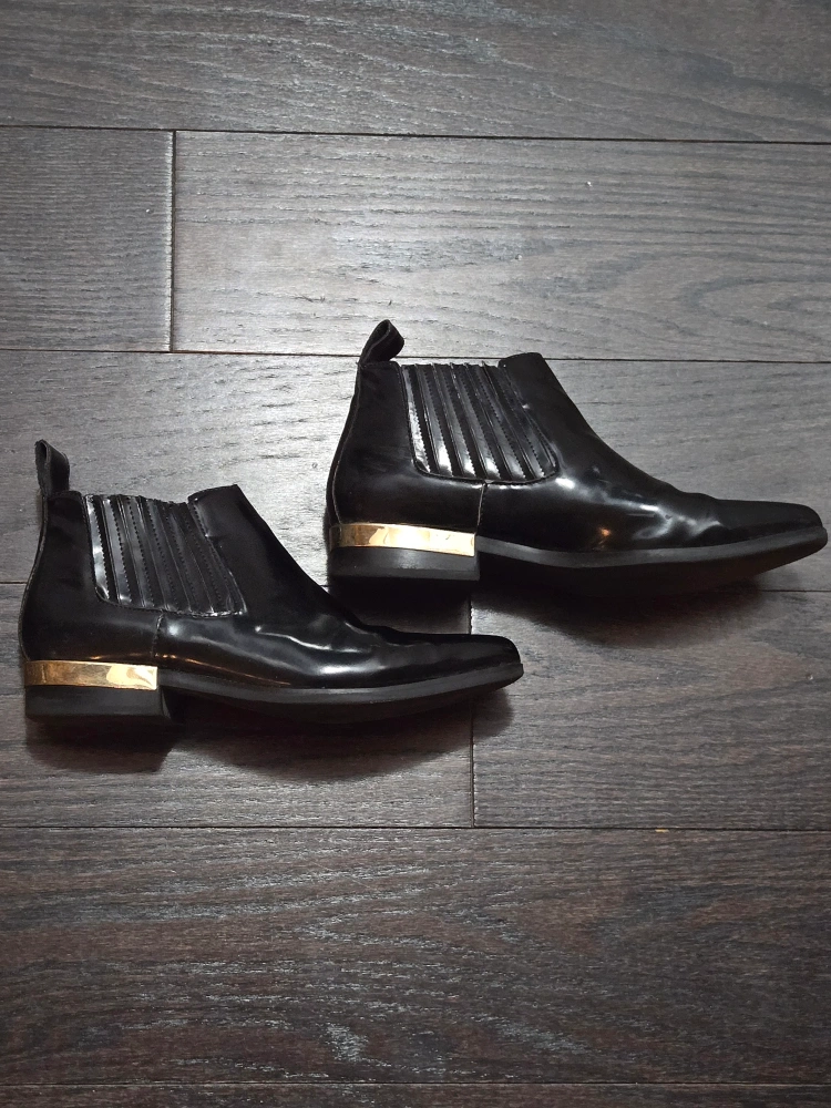 677Pair of black patent leather ankle boots. Gold-toned accents at the heel. Slight pointed toe.