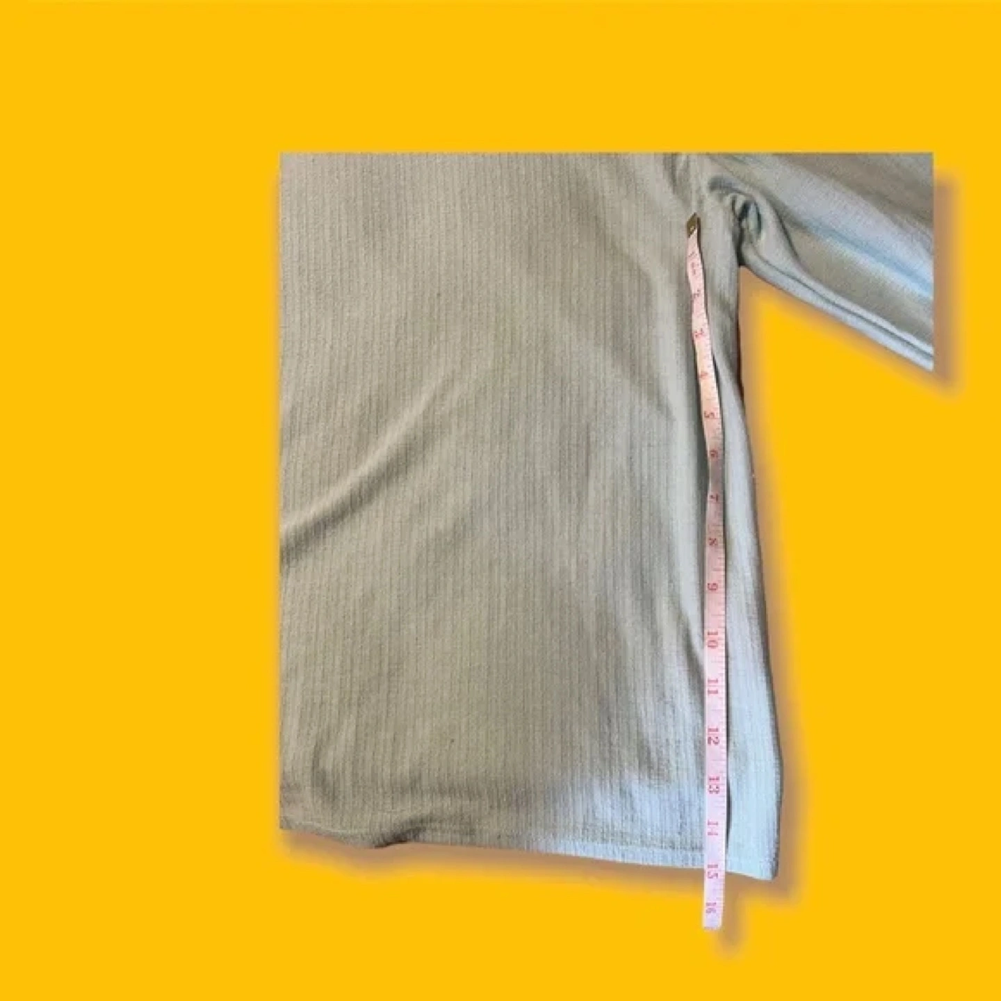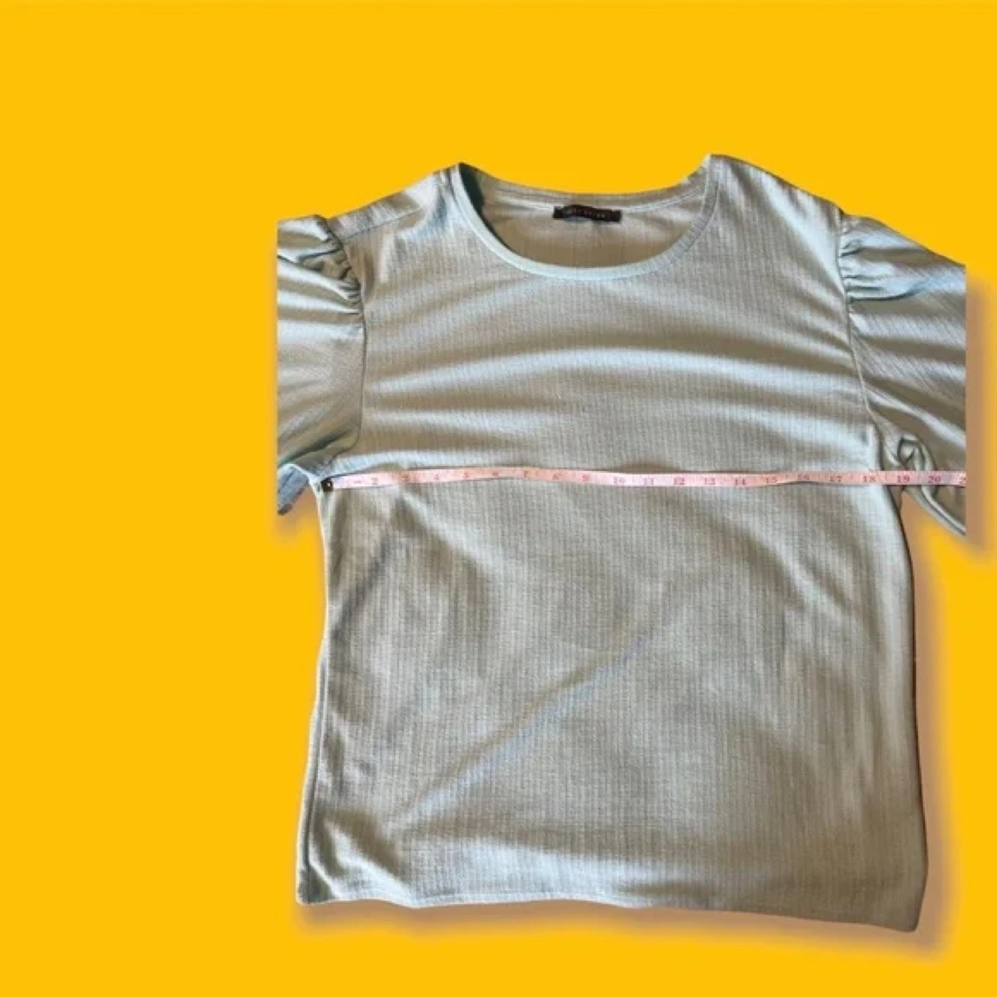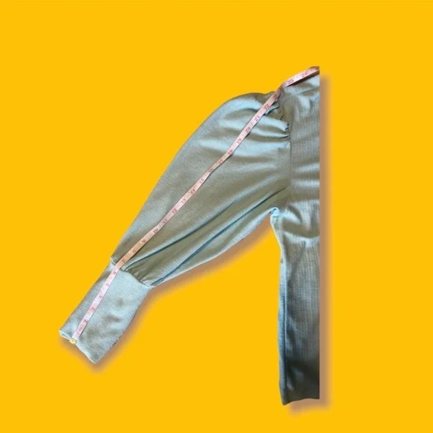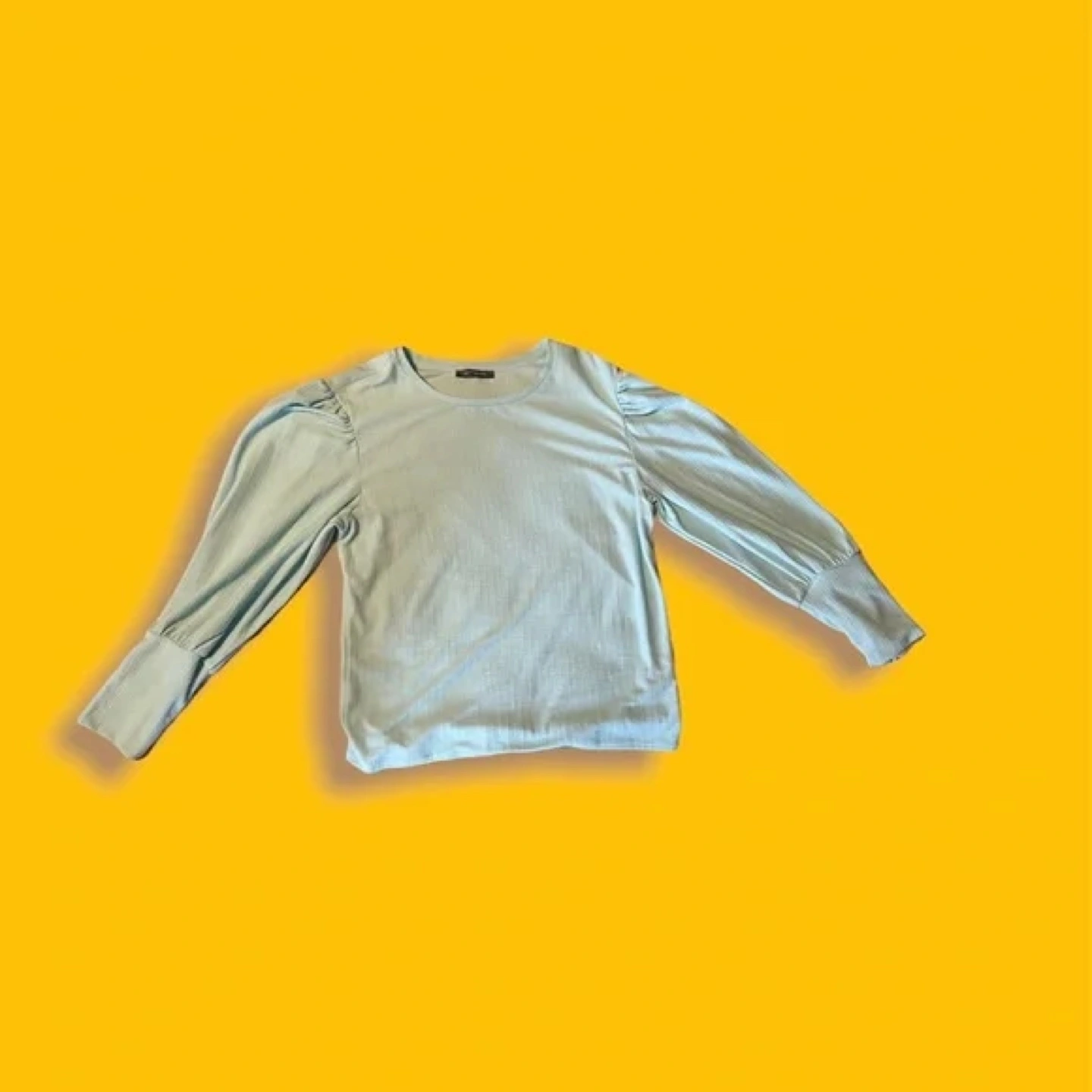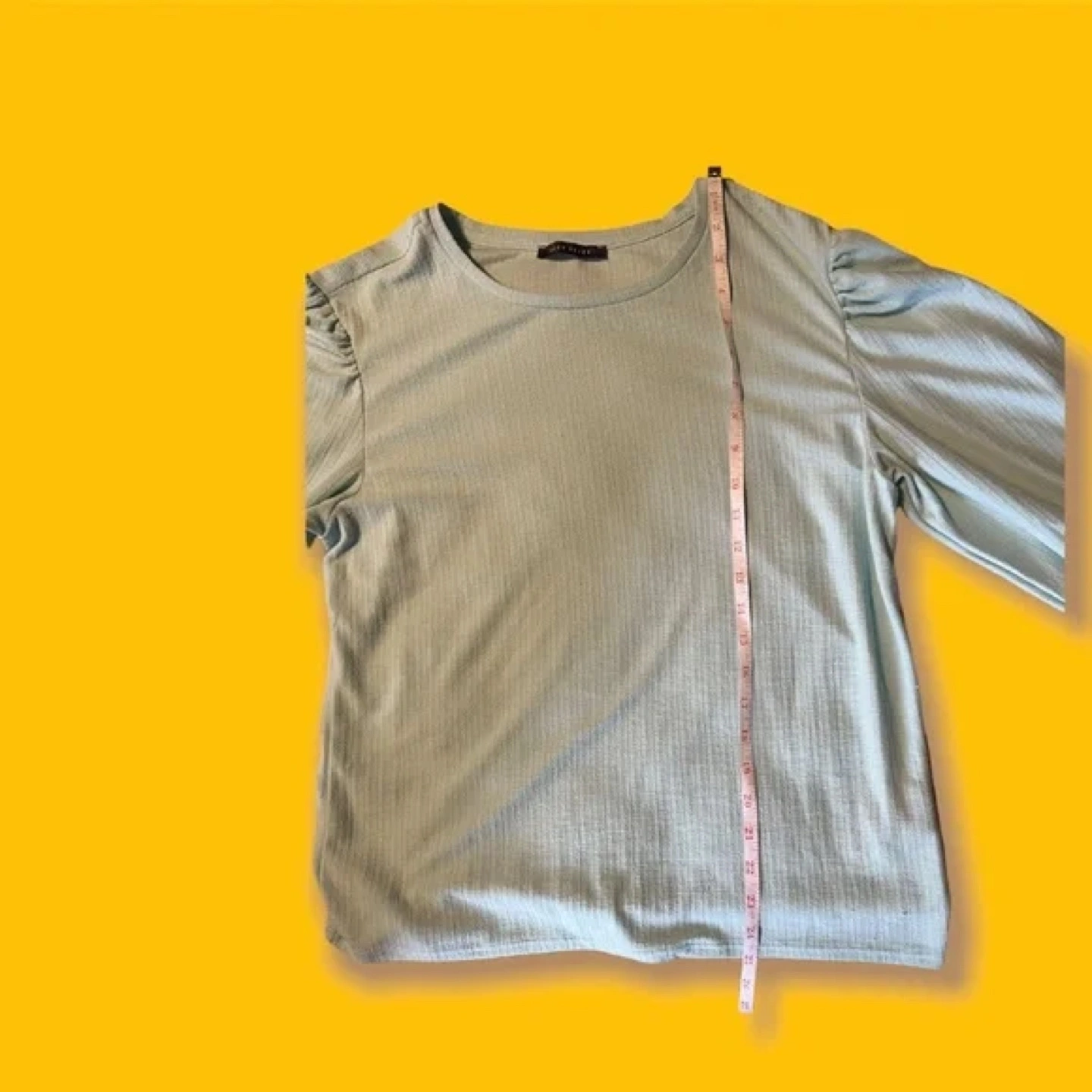 Women's light green long sleeve top. Ribbed fabric. Puff sleeves. Relaxed fit. Casual style.