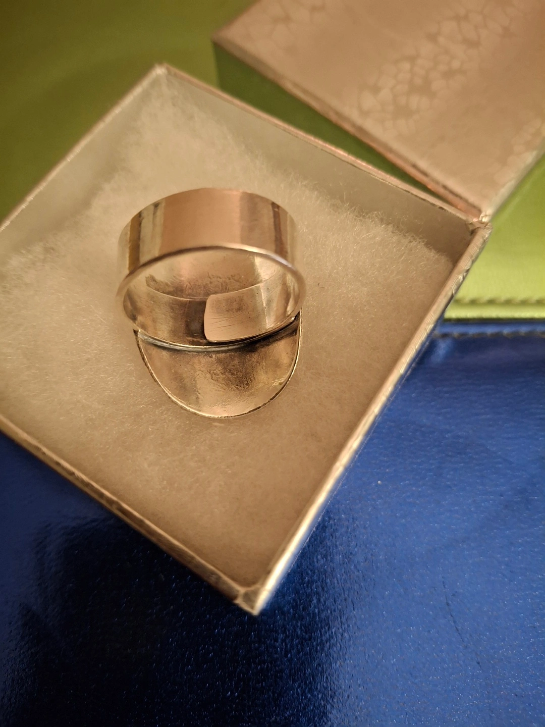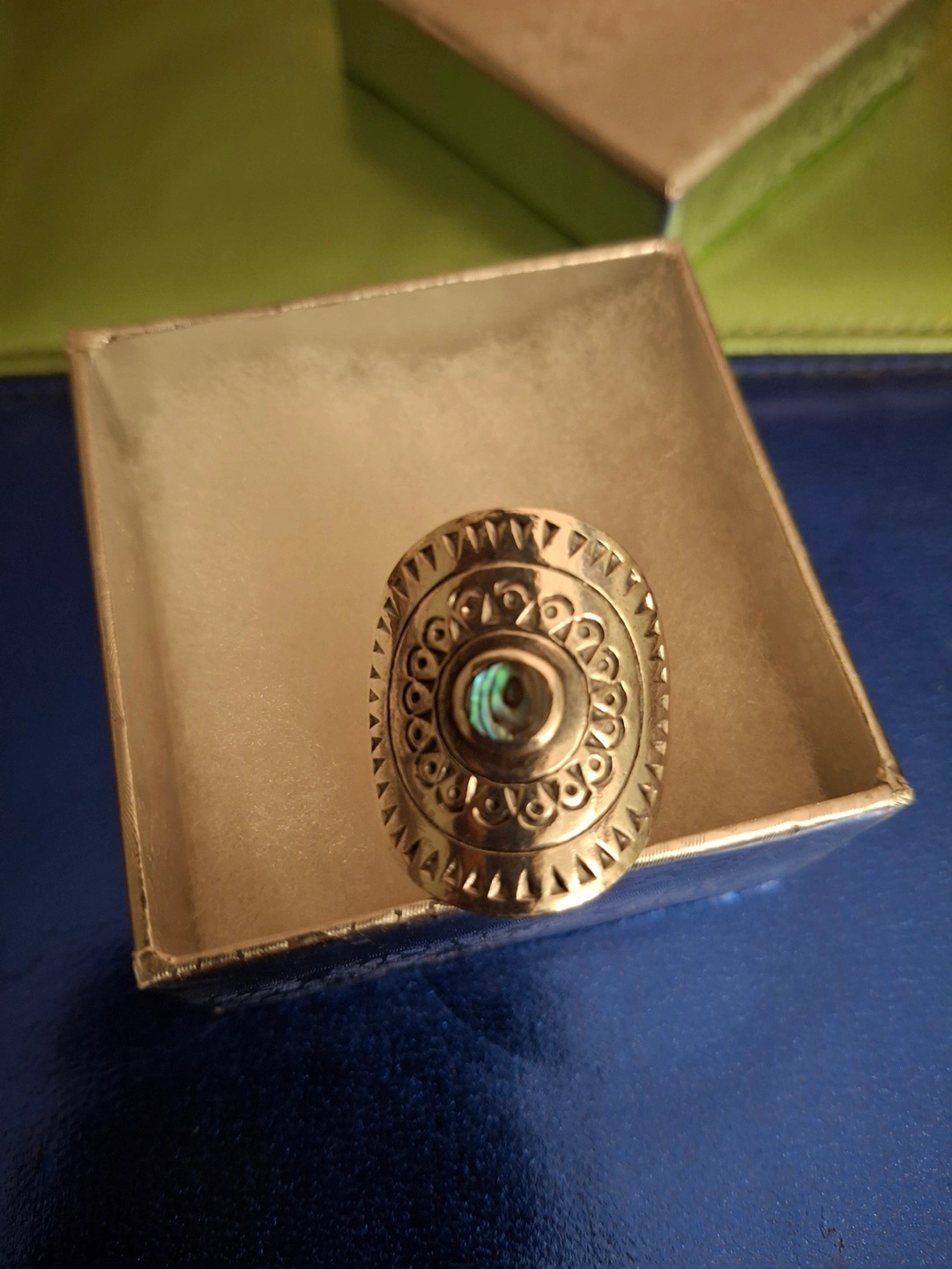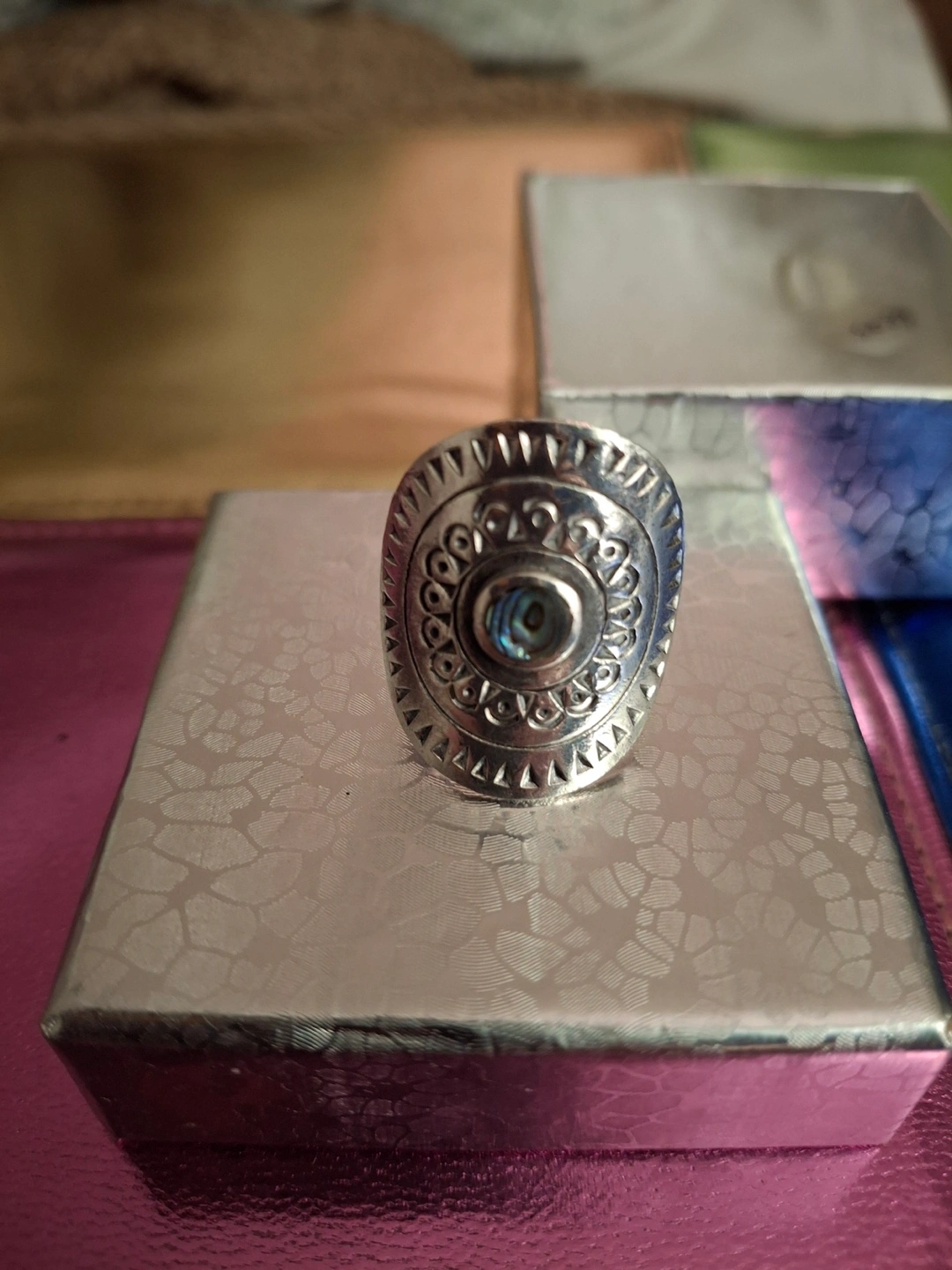 Silver statement ring, stamped 925. Features an oval faceplate with etched detailing. Centre features a blue abalone stone. Thick adjustable band for custom fit (currently size 9). Never worn, still has tag. Available for pickup in Markland Wood.