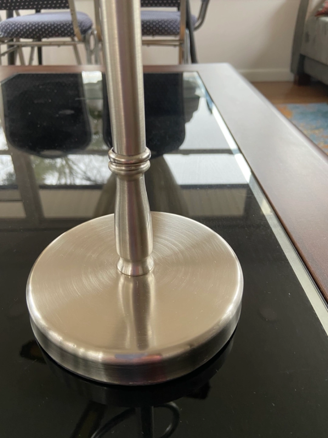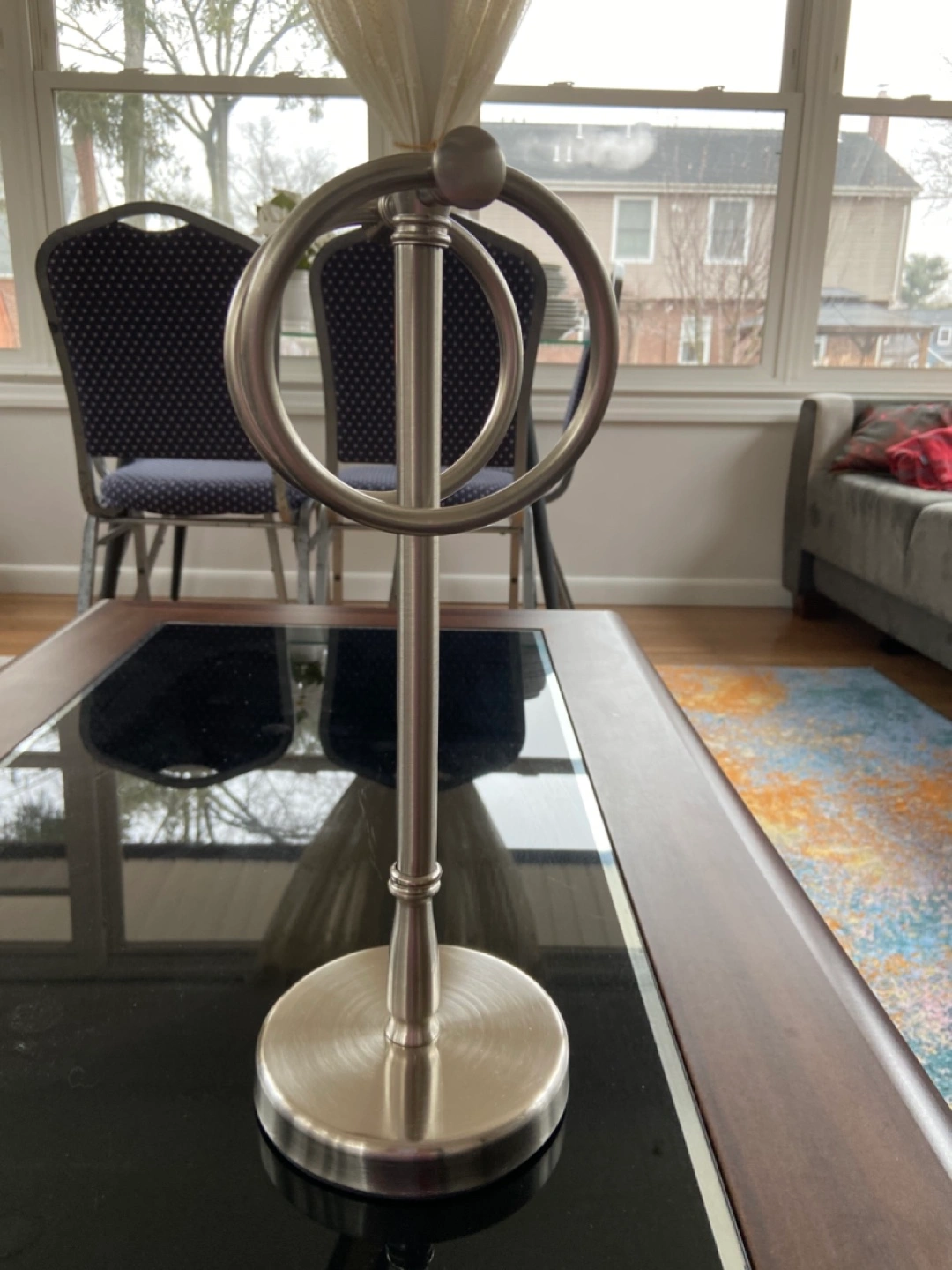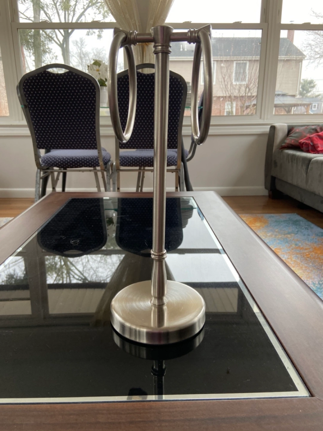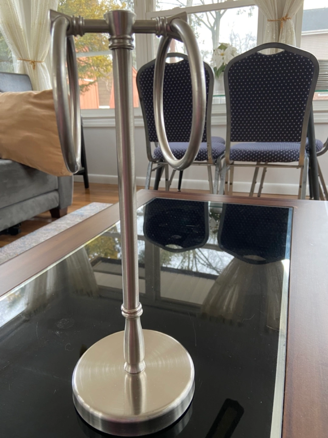 Double ring towel holder. Brushed nickel finish. Free-standing design. Perfect for bathrooms or other areas.