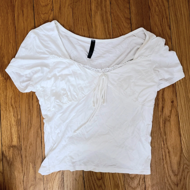 Short sleeve cropped t-shirt. White cotton blend. Sweetheart neckline with lace trim detail and tie. Very stretchy.