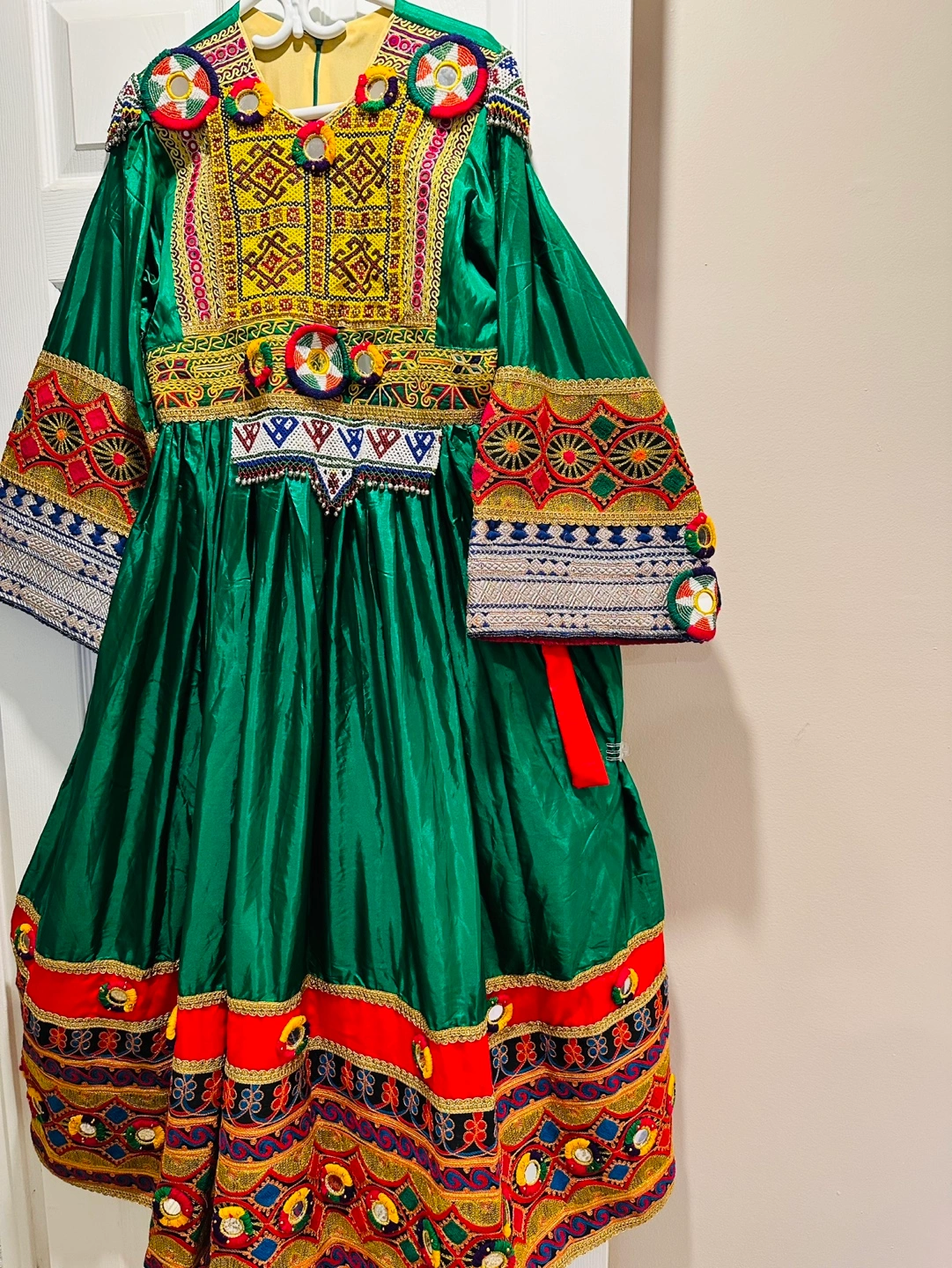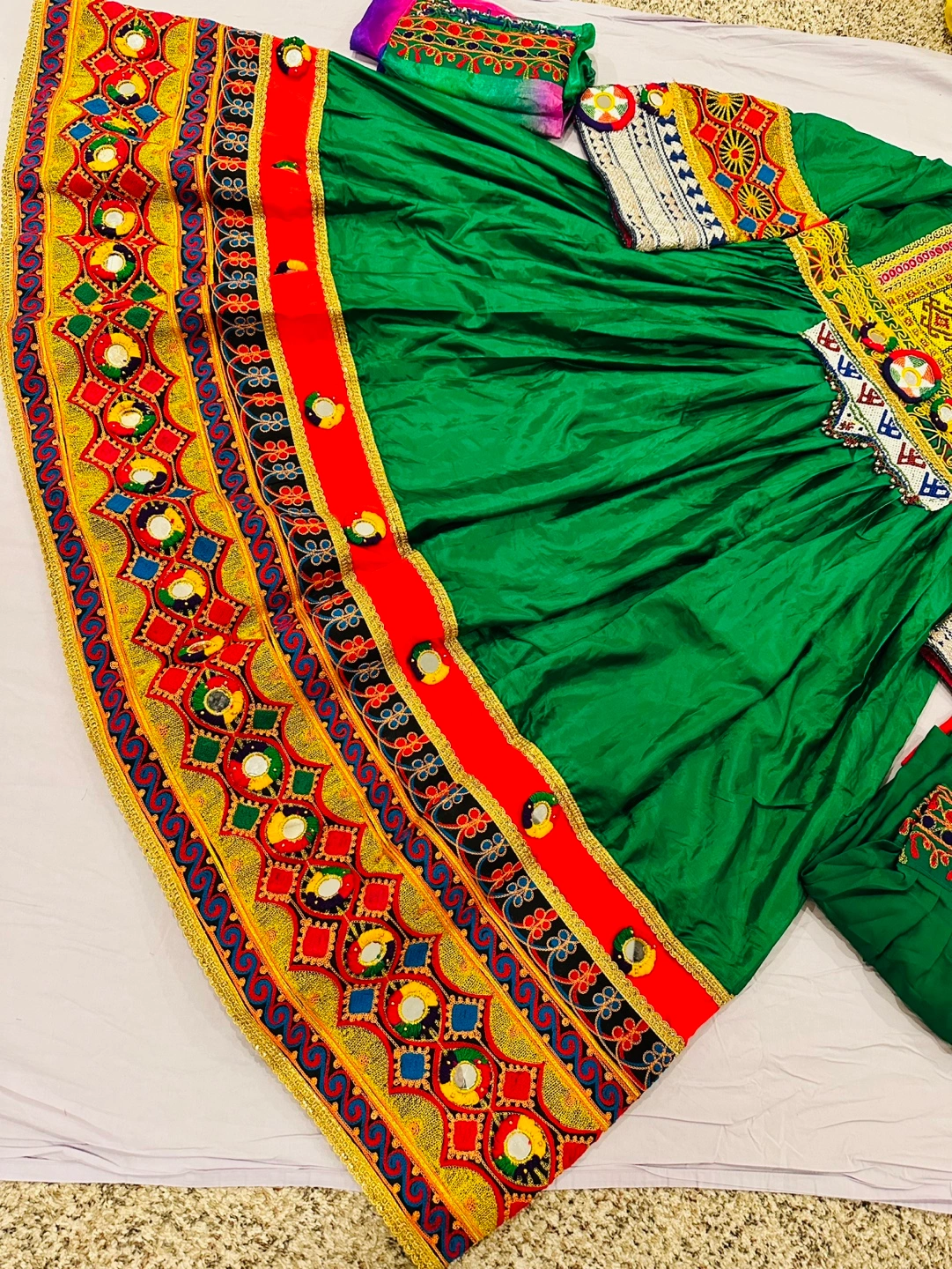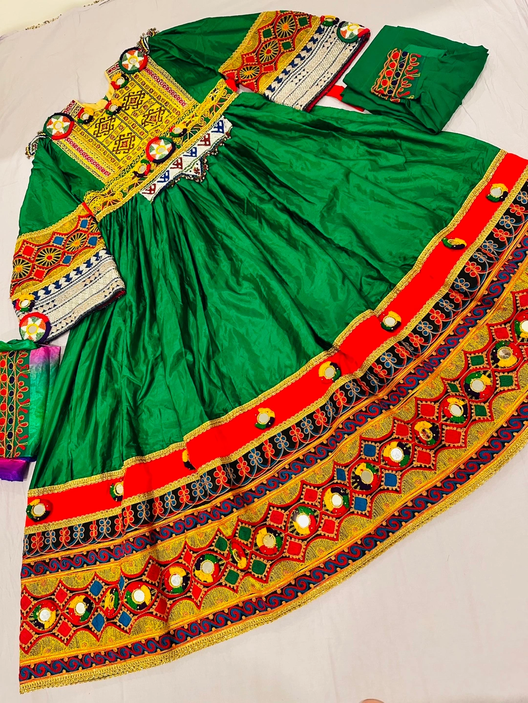 Gorgeous green afghani dress. Features intricate hand embroidery, vibrant colours, and mirror work. Includes matching dupatta. Stunning traditional design.
