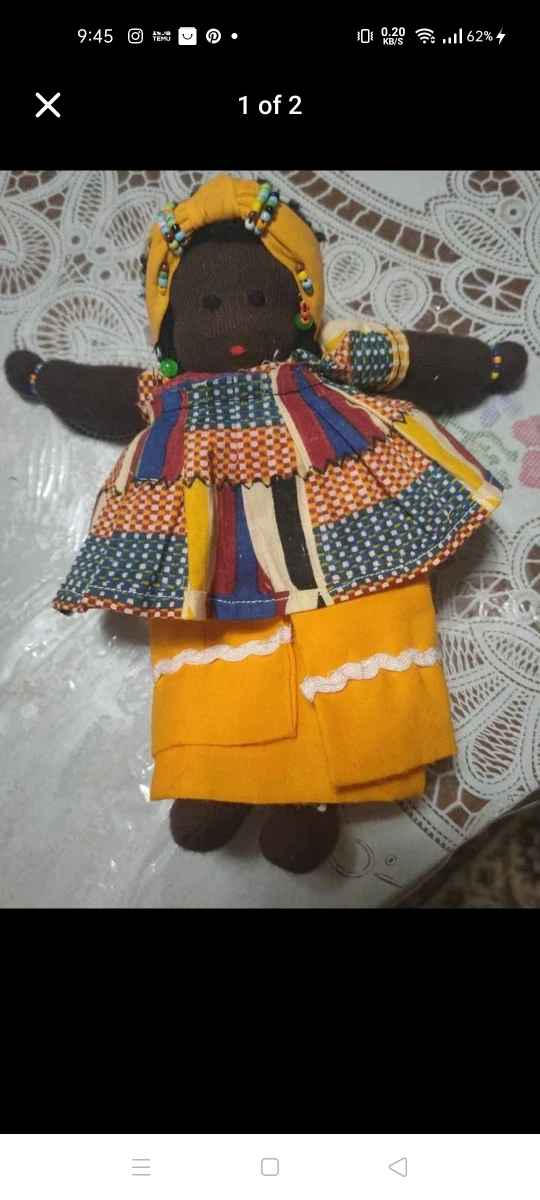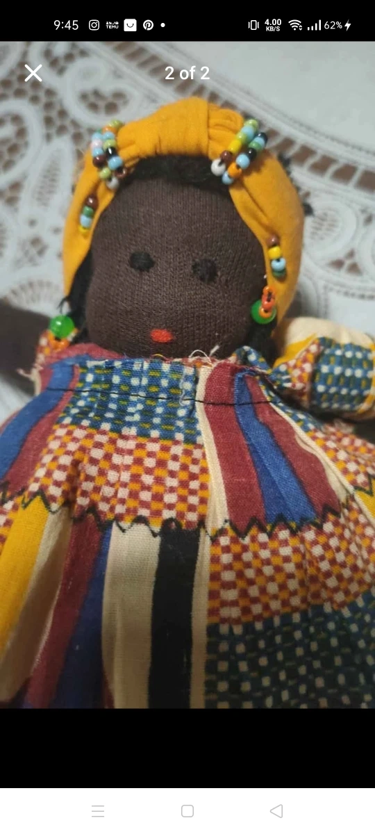 Unique handmade doll. Features colourful fabric clothing. Beaded headwrap. Excellent collectible or decorative item.