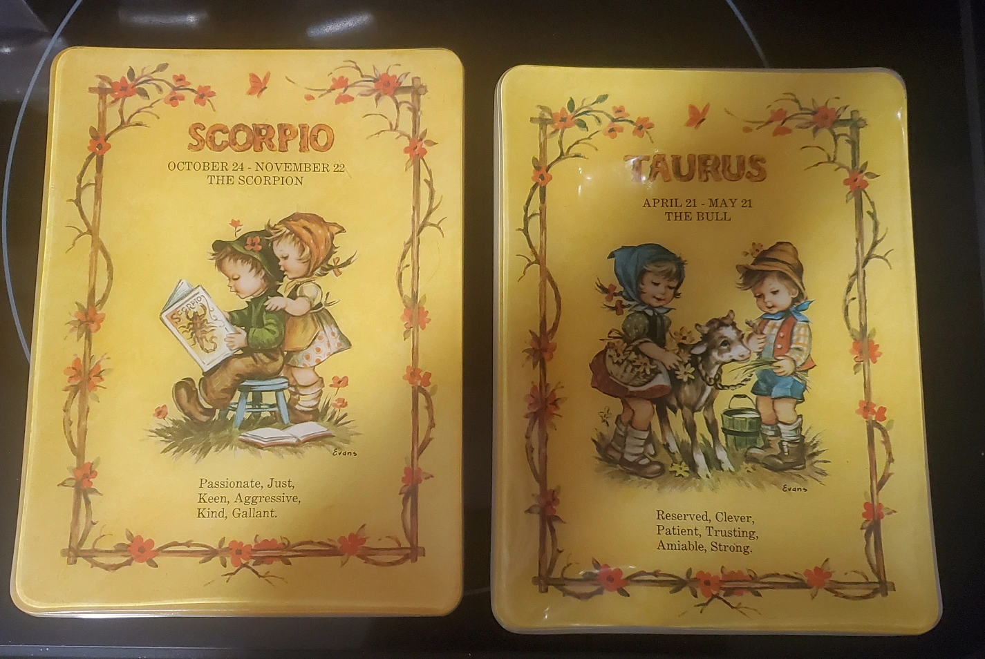 Pair of vintage plaques . Each features a different zodiac sign: Scorpio and Taurus. Cute children's illustrations and descriptions of each sign's personality traits. Yellow background with floral accents.