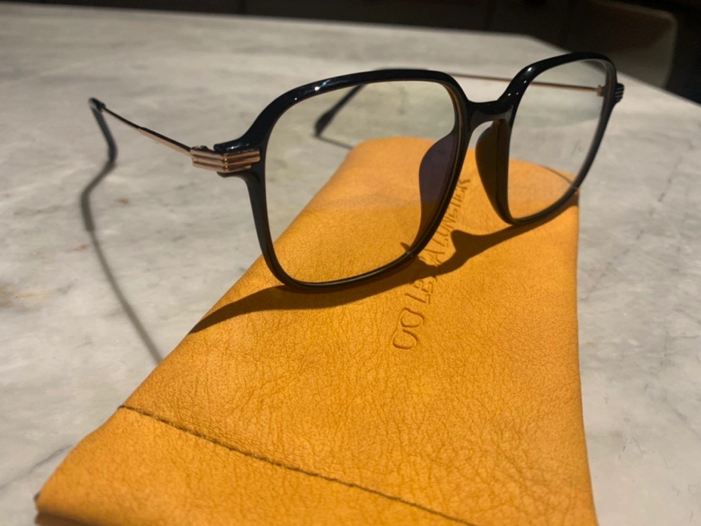 Selling a super lightweight pair of blue light blocking glasses with a stylish black and gold frame. The lenses can be easily replaced with prescription or custom lenses.