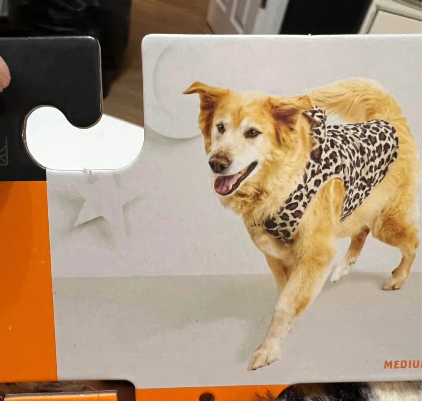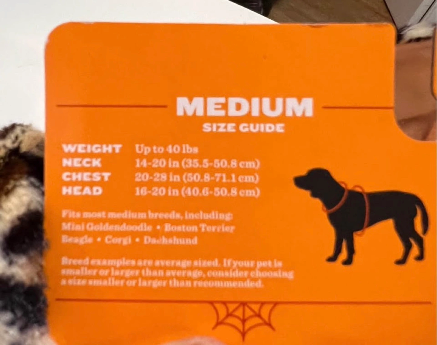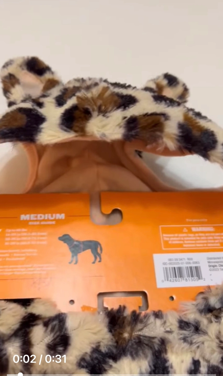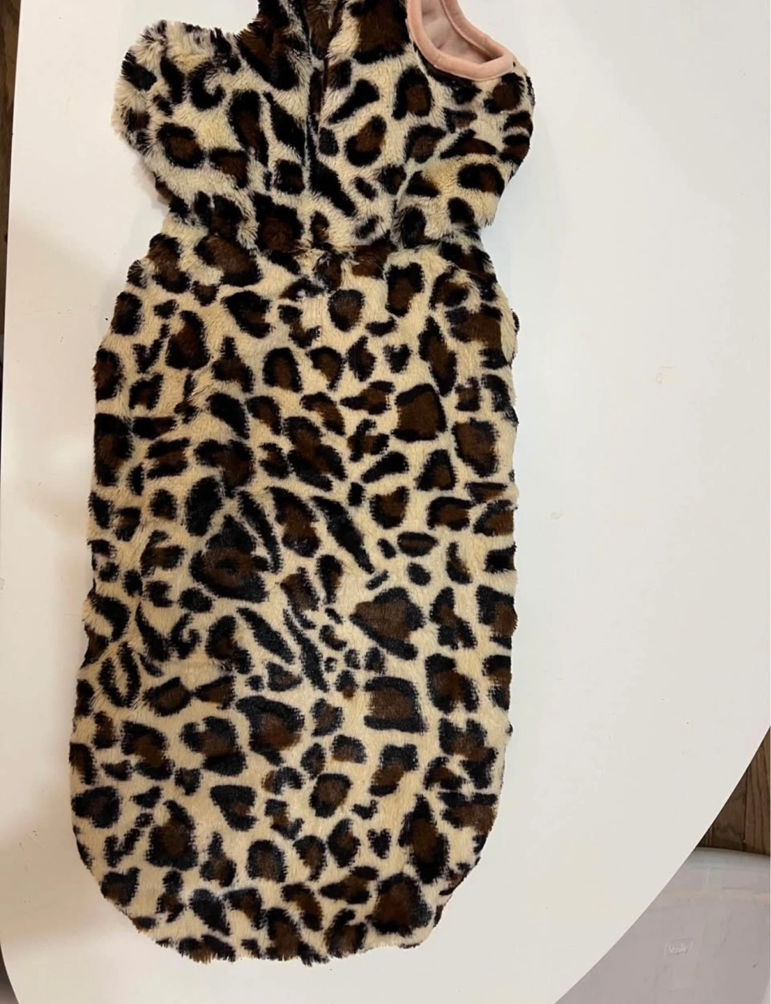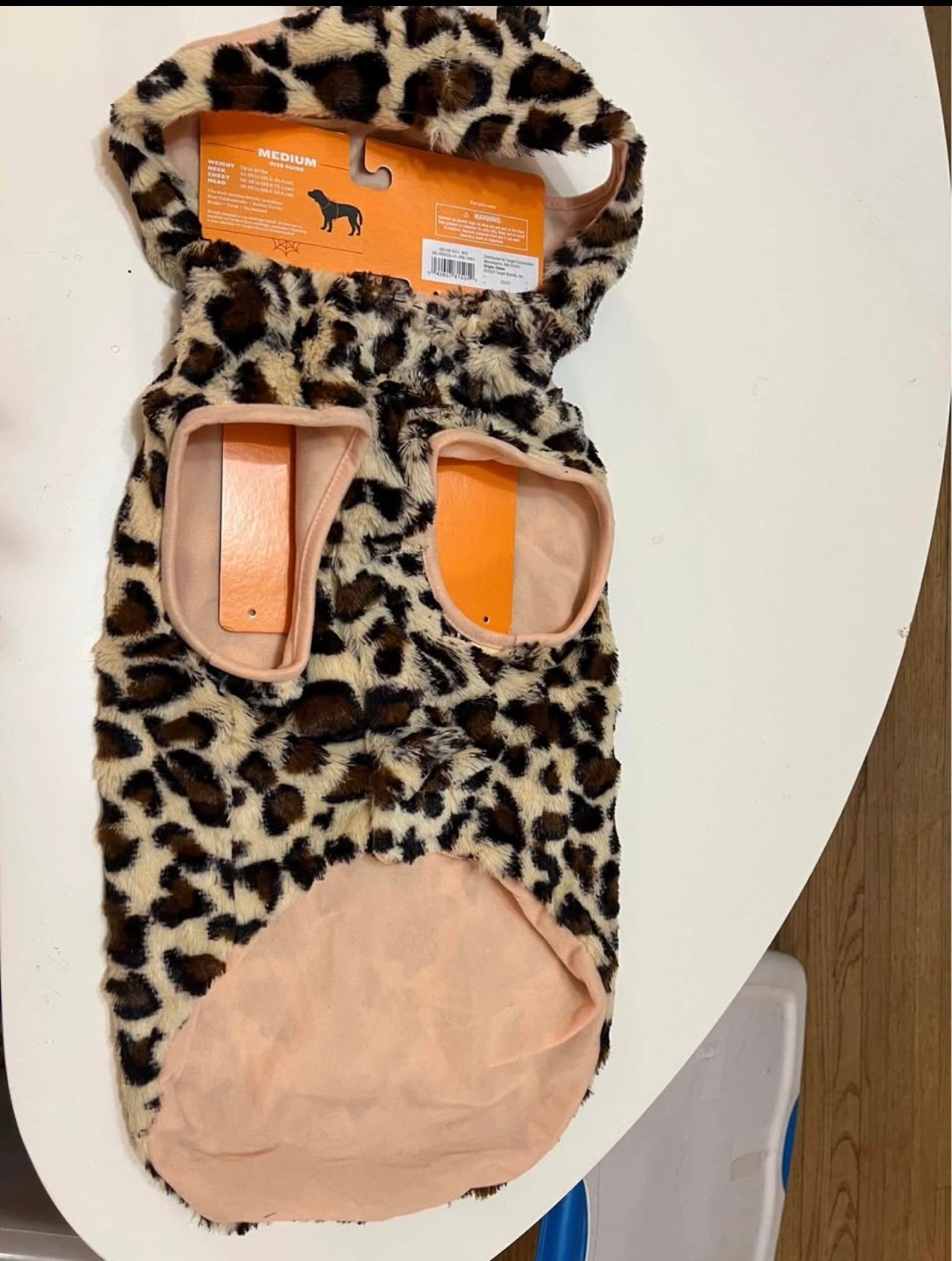Adorable leopard print dog hoodie. Medium size. Soft, plush material. Perfect for keeping your furry friend warm and stylish. Features a hood and harness openings.