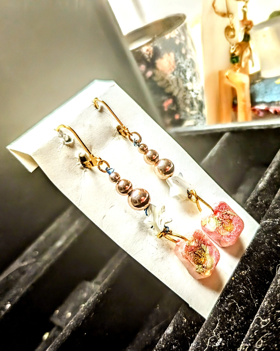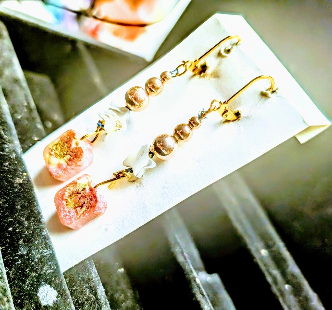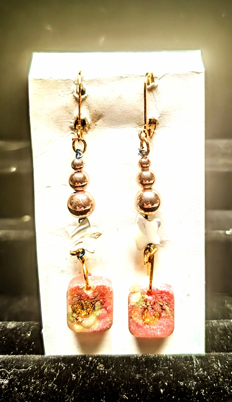 Pretty dangle earrings. Features rose gold beads and luminescent seashell, shar-shaped beads. Pink resin bead at the bottom, accented with green & gold crescent-moons. Unique handmade design. Perfect for adding a touch of elegance to any outfit.