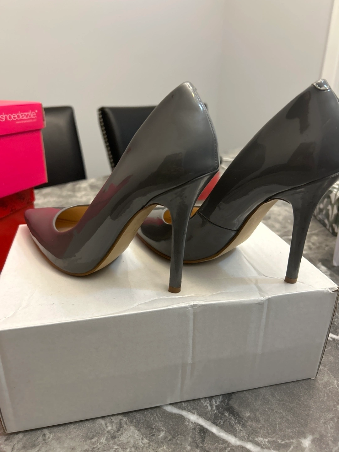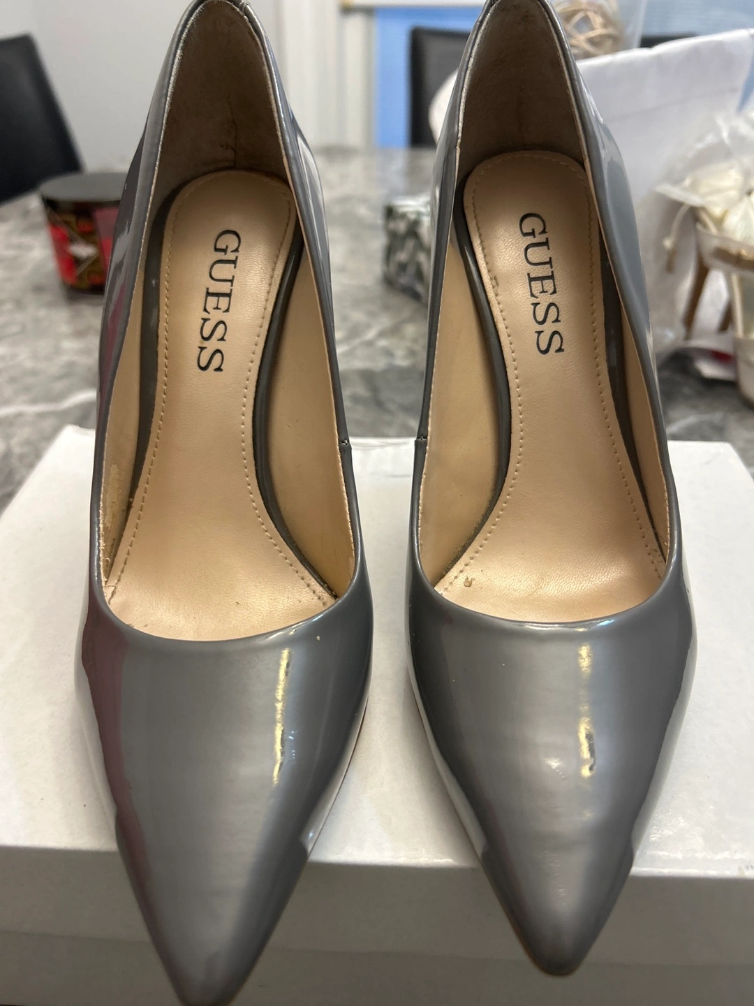 Beautiful grey patent leather Guess heels. Pointed toe and stiletto heel. Stylish and elegant footwear.