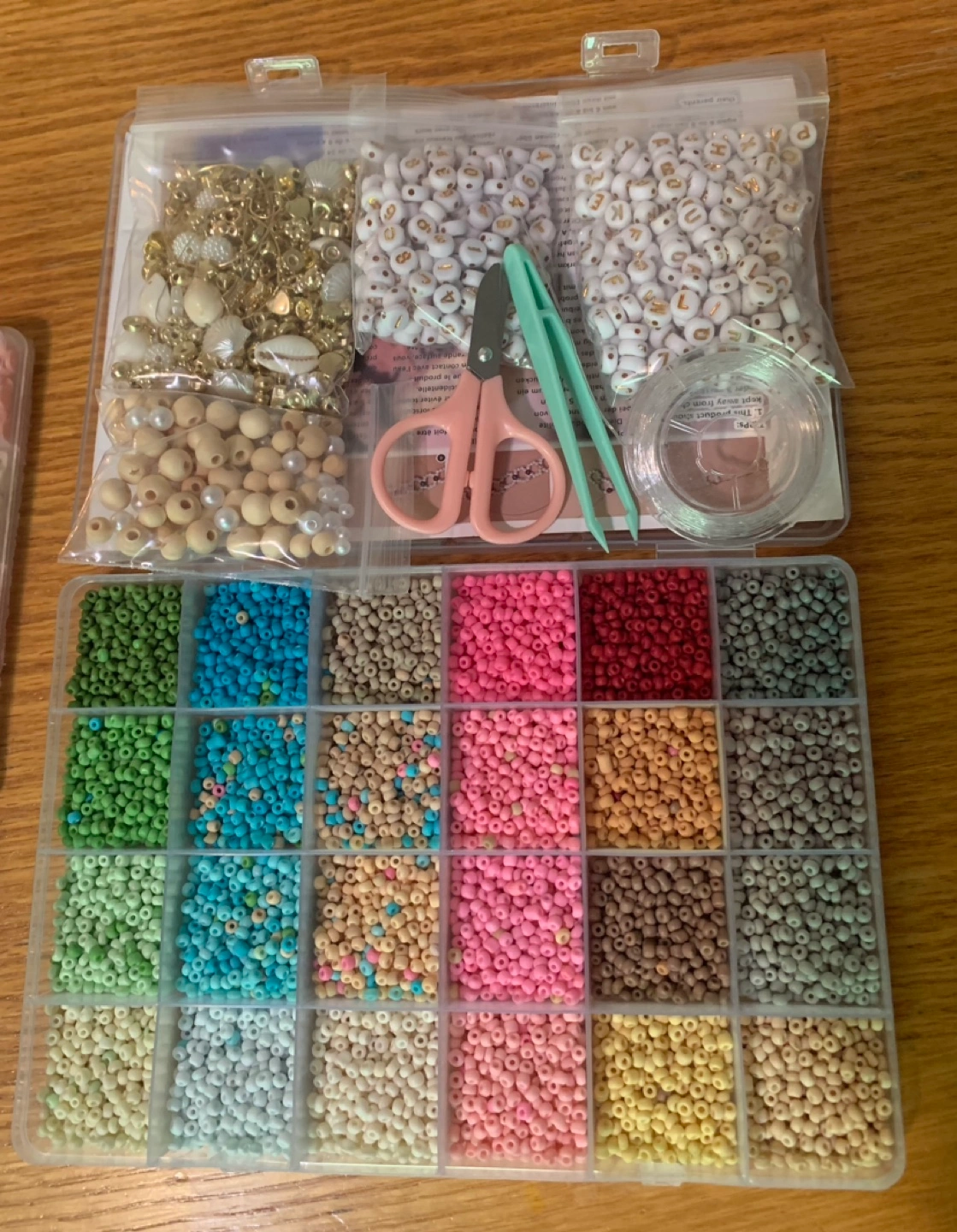Large assortment of colourful beads, includes letter beads, shells, and pearls. Clear elastic cord and small scissors included. Perfect for crafting bracelets and necklaces.