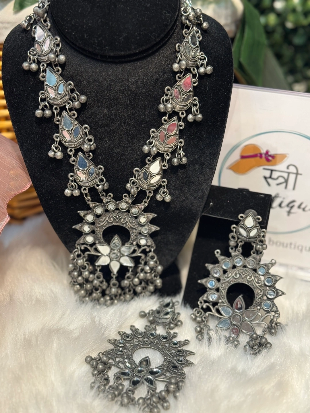Stunning oxidized silver necklace and earrings set. Features teardrop and floral accents with mirrored detailing. Beautiful statement jewelry perfect for special occasions.