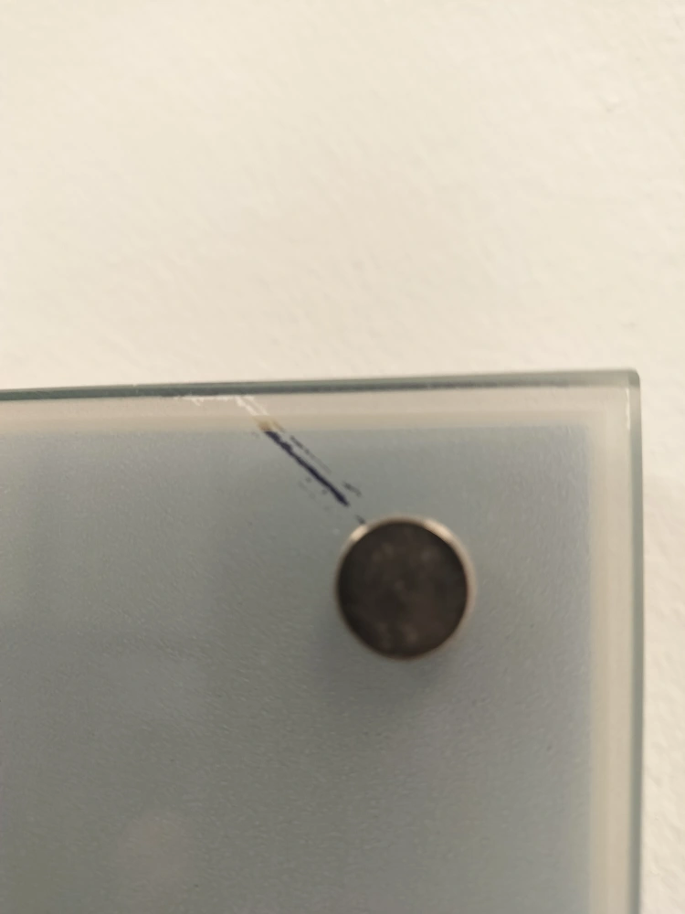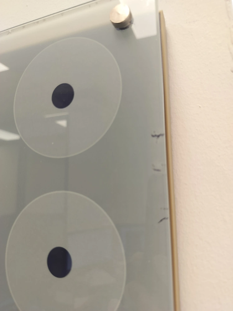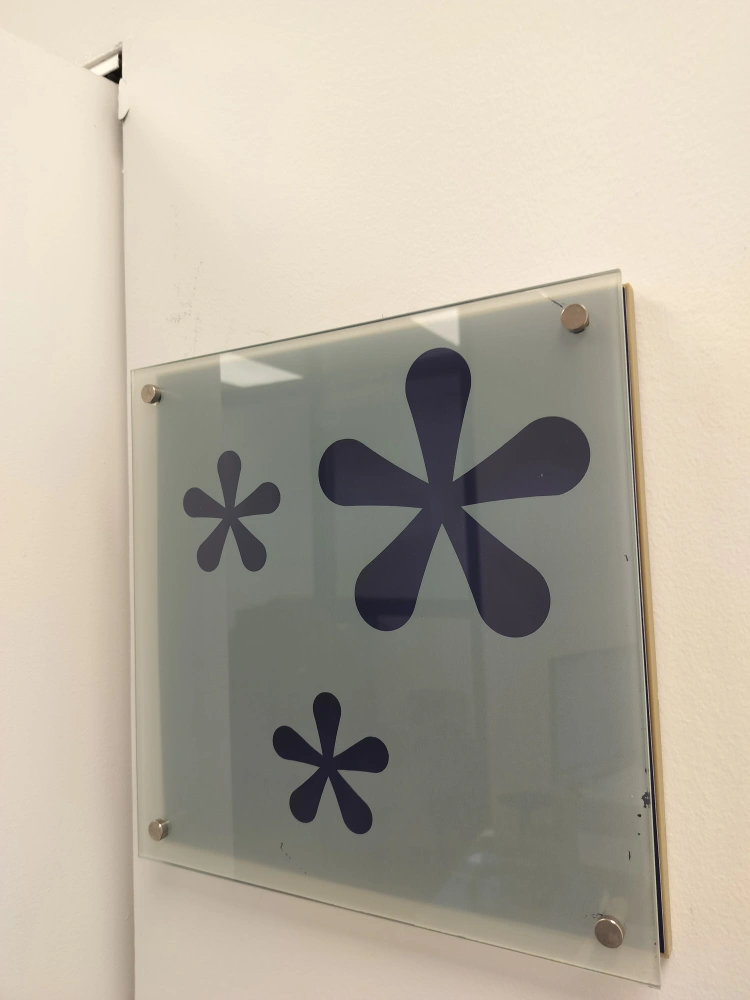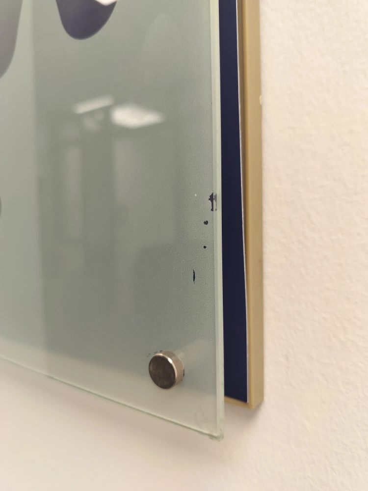 Two frosted glass panels. Each features a unique minimalist design in dark blue. Mounted with metallic hardware. Minor scuffs and scratches present.