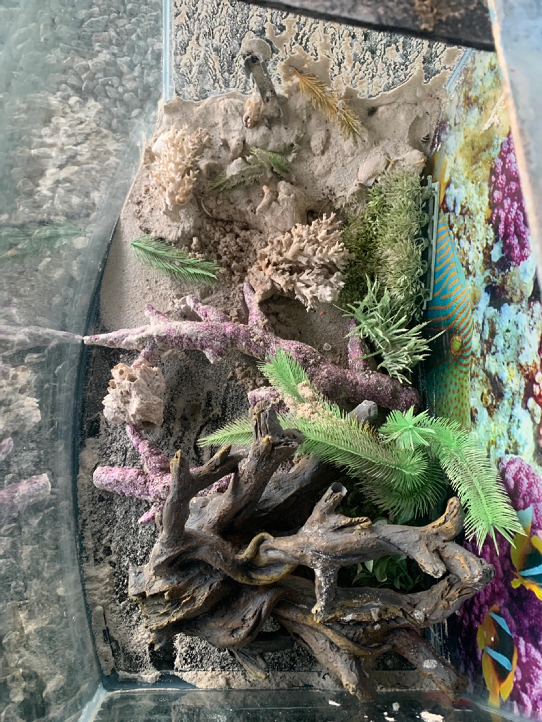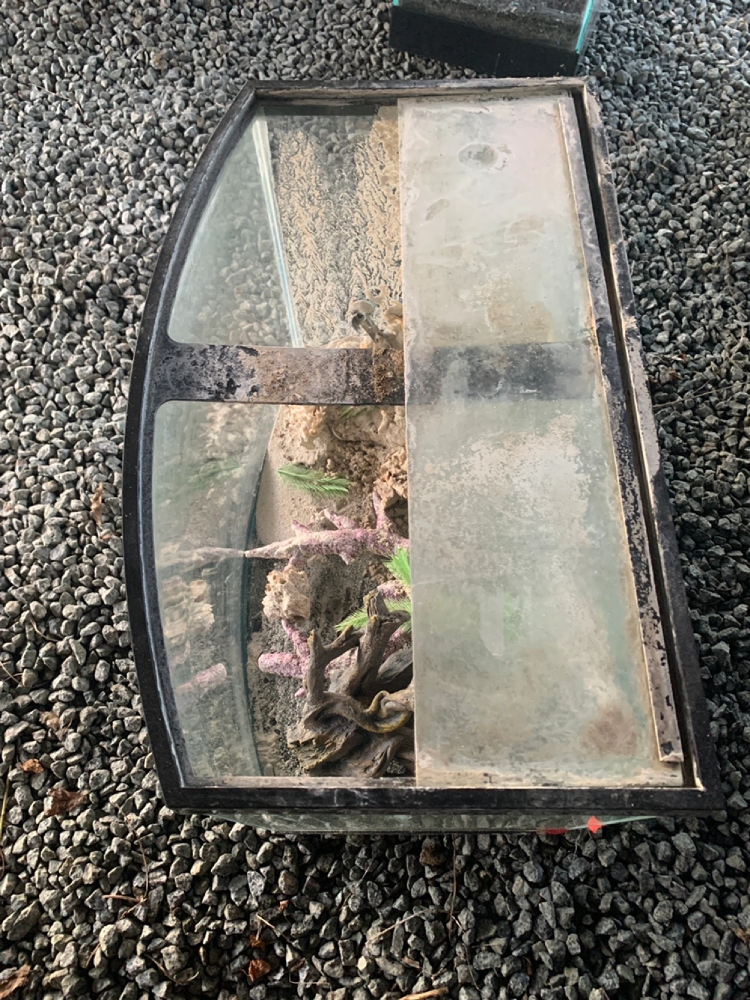 24 inch width 15 in depth at center 19 inch in height .This is a bow front curved glass aquarium with a background depicting a coral reef. It includes decorative elements like artificial plants, driftwood, corals and