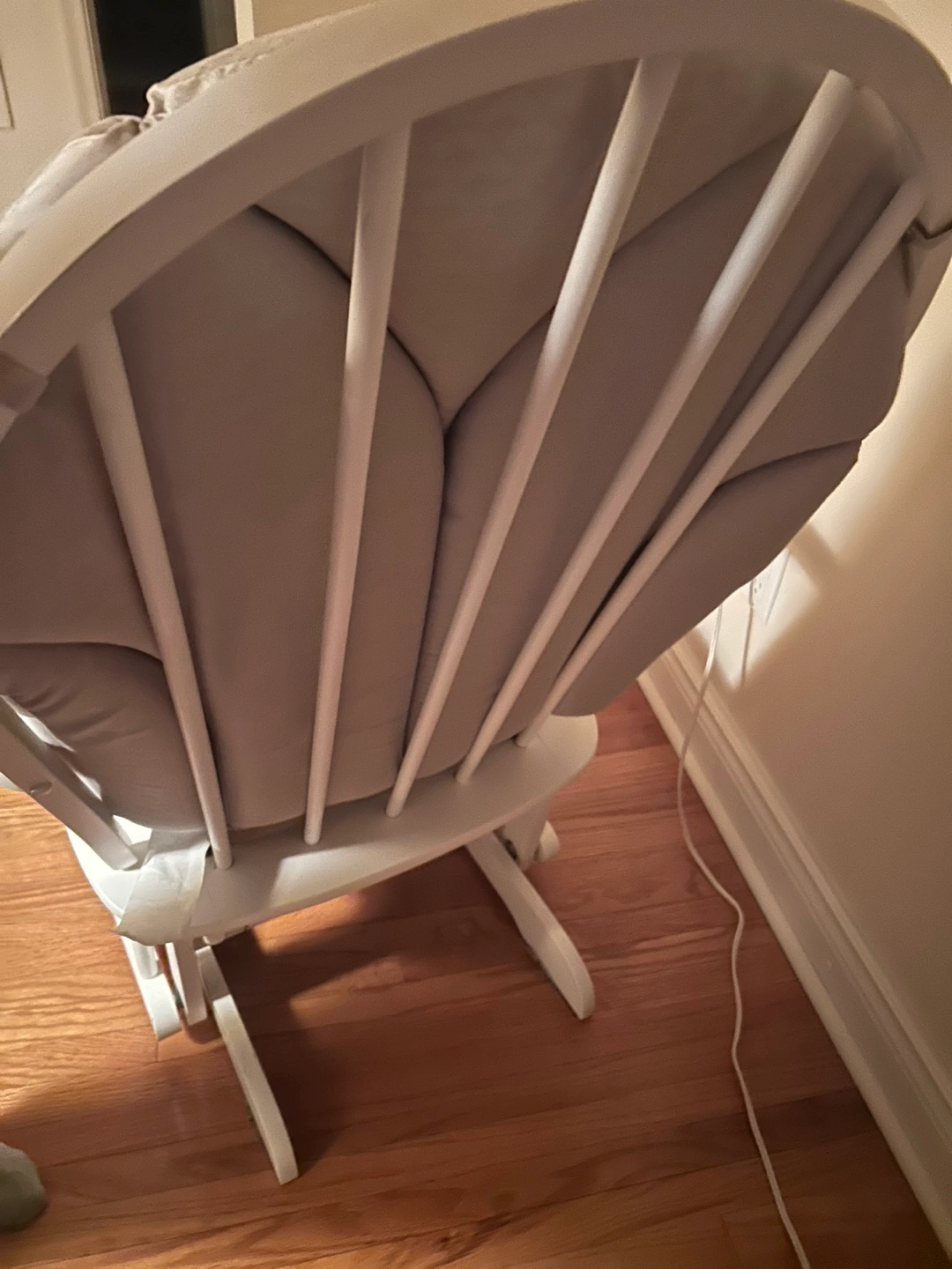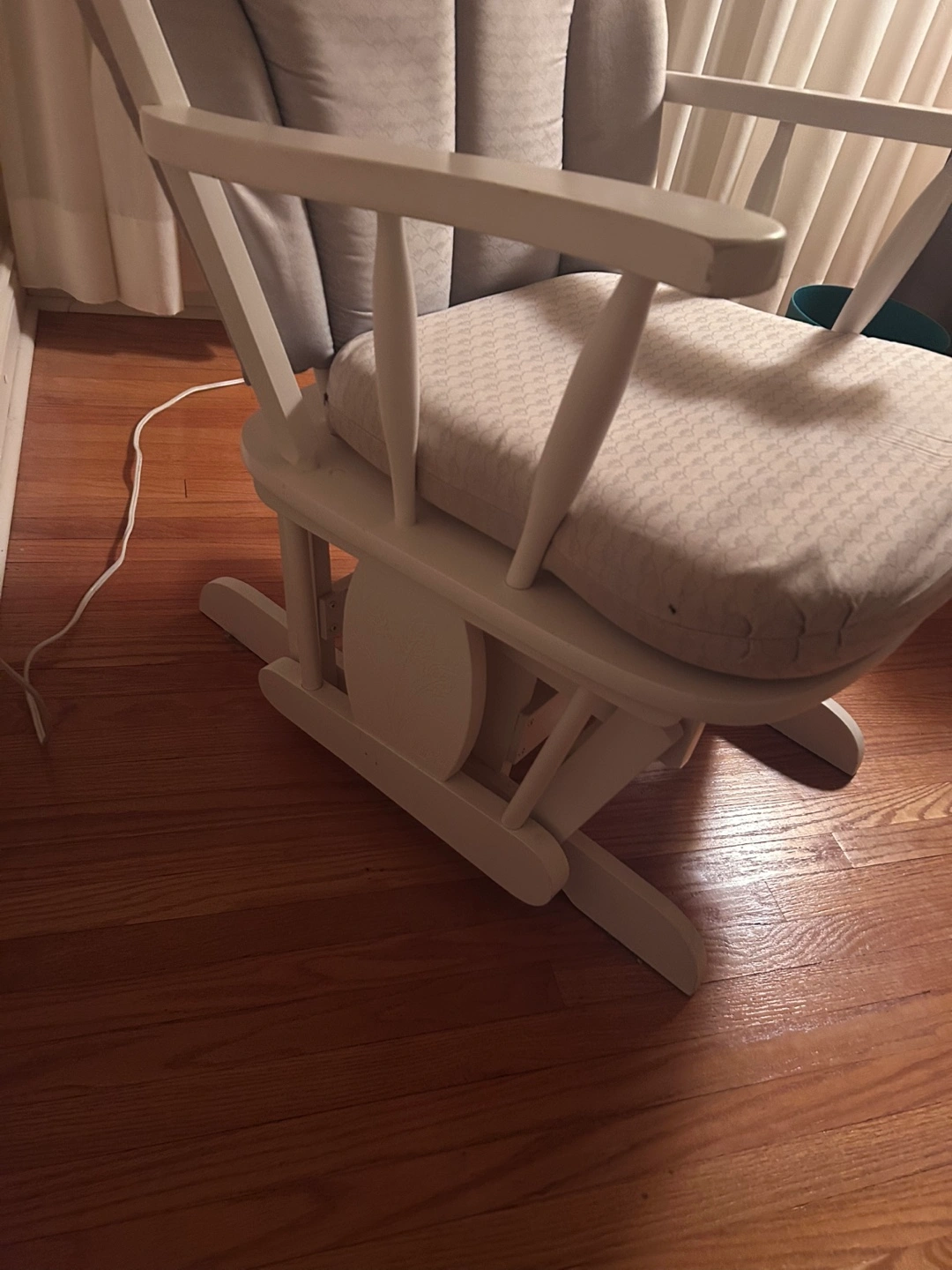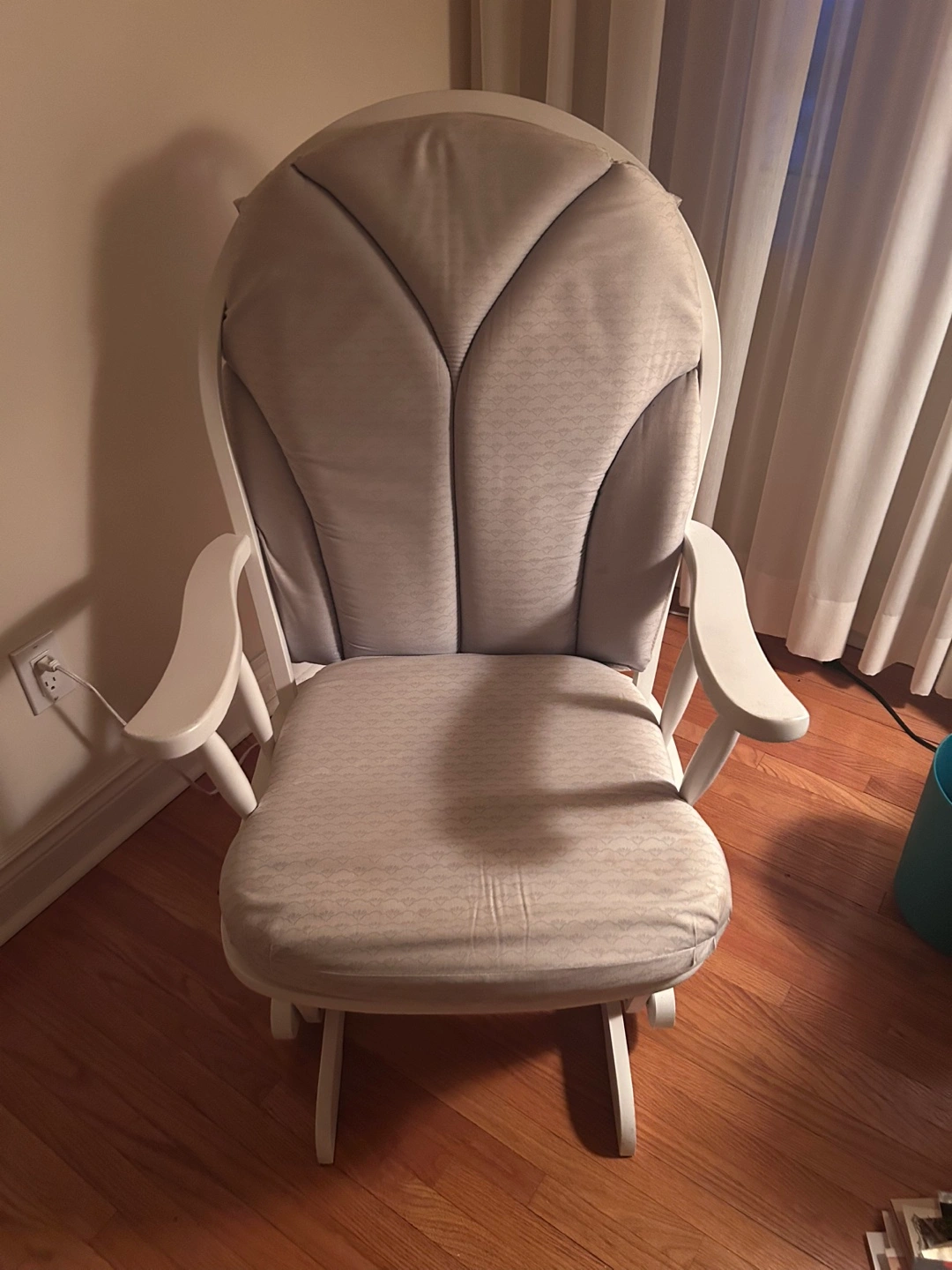 Sturdy, solid, well built, wood rocking glider chair. Made in Canada. The chair itself is in perfect condition. Buyer may want to recover the cushions so I’ve priced it accordingly. They are not torn, just faded.