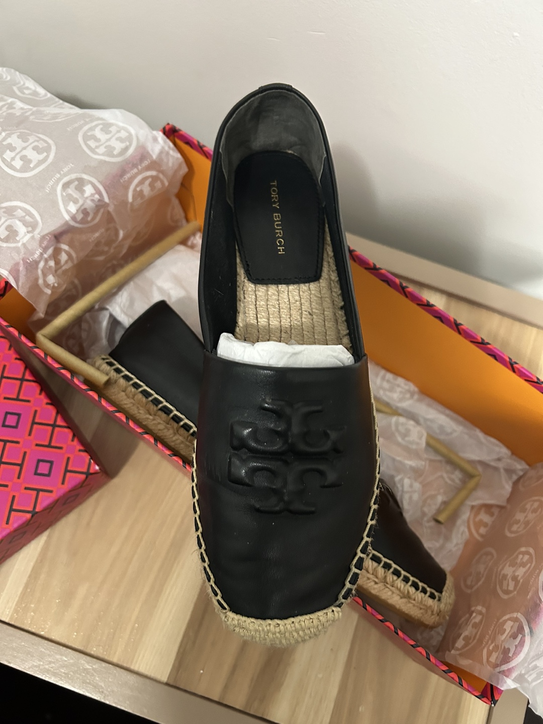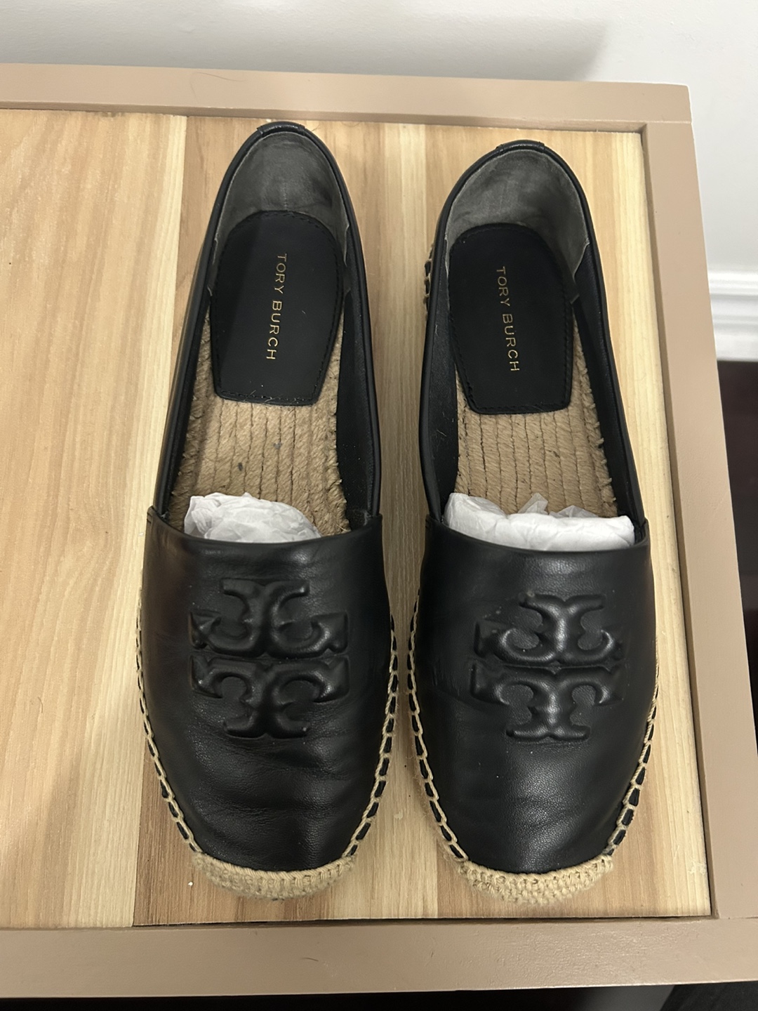 Women's Tory Burch espadrilles. Black leather upper. Comes in original box. Never worn.