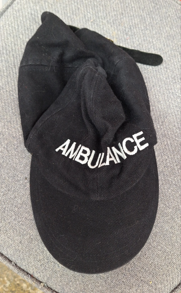 Black baseball cap with white embroidered "AMBULANCE" text. Slightly worn but great condition..