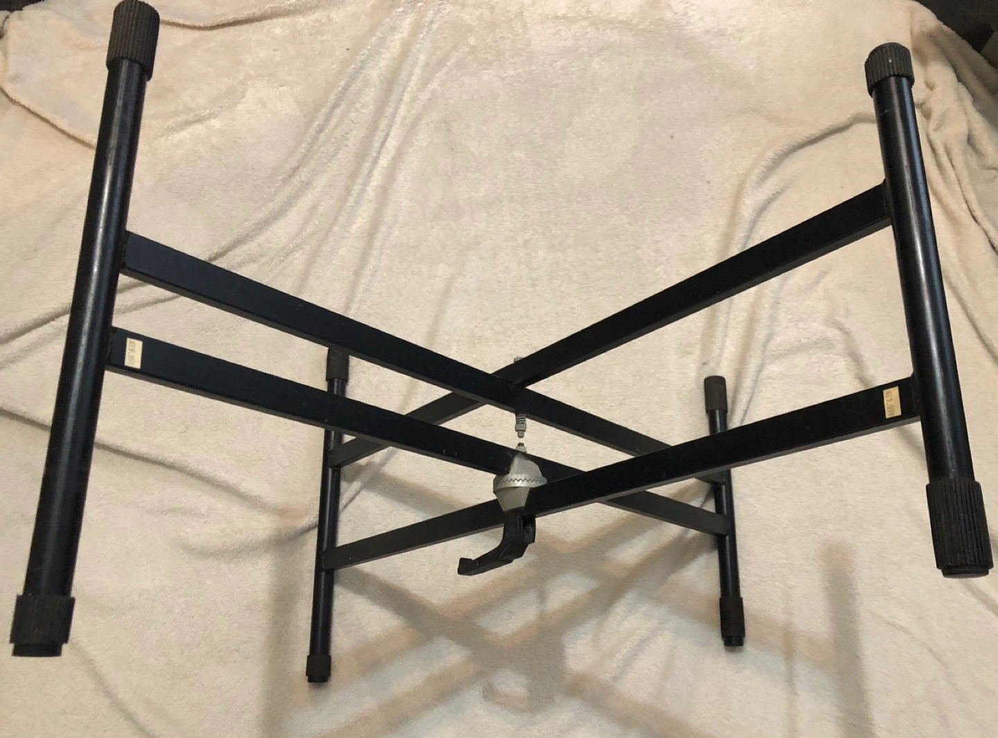 Black metal keyboard stand. X-frame design. Adjustable height. Portable and foldable.