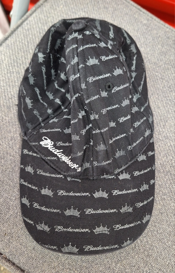 Black baseball cap. Features a repeating Budweiser logo and crown pattern. Adjustable.