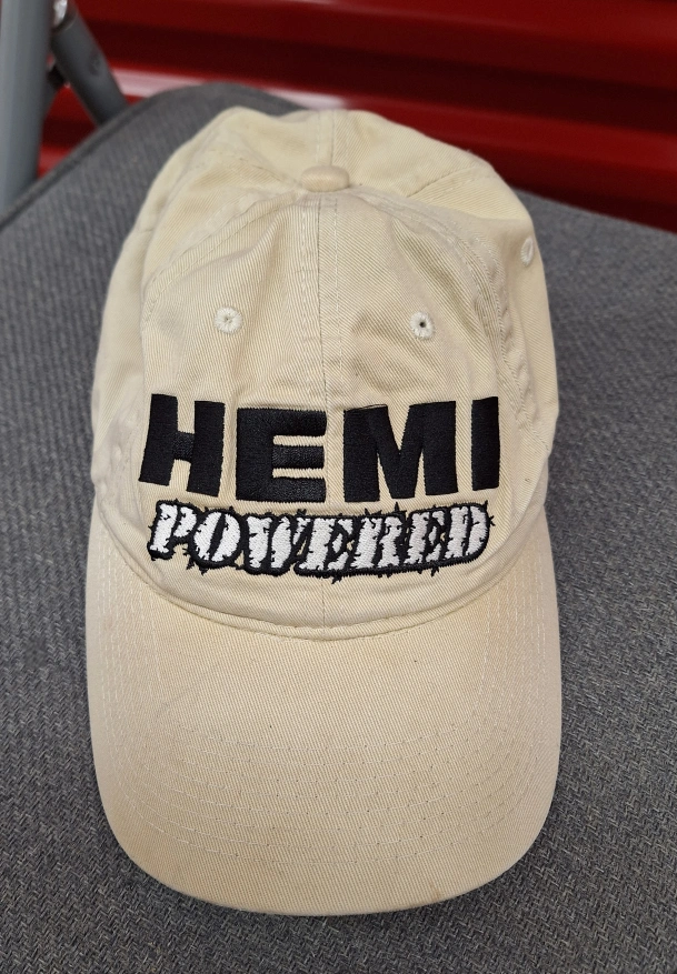 Tan coloured baseball cap with embroidered HEMI POWERED text. Adjustable closure.