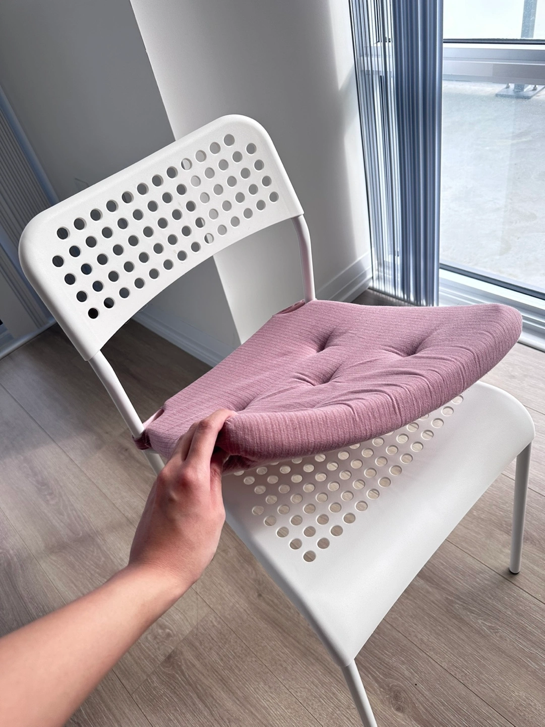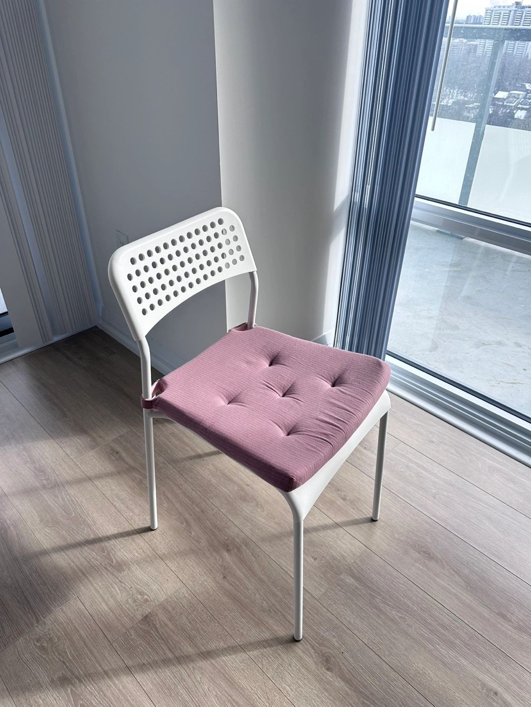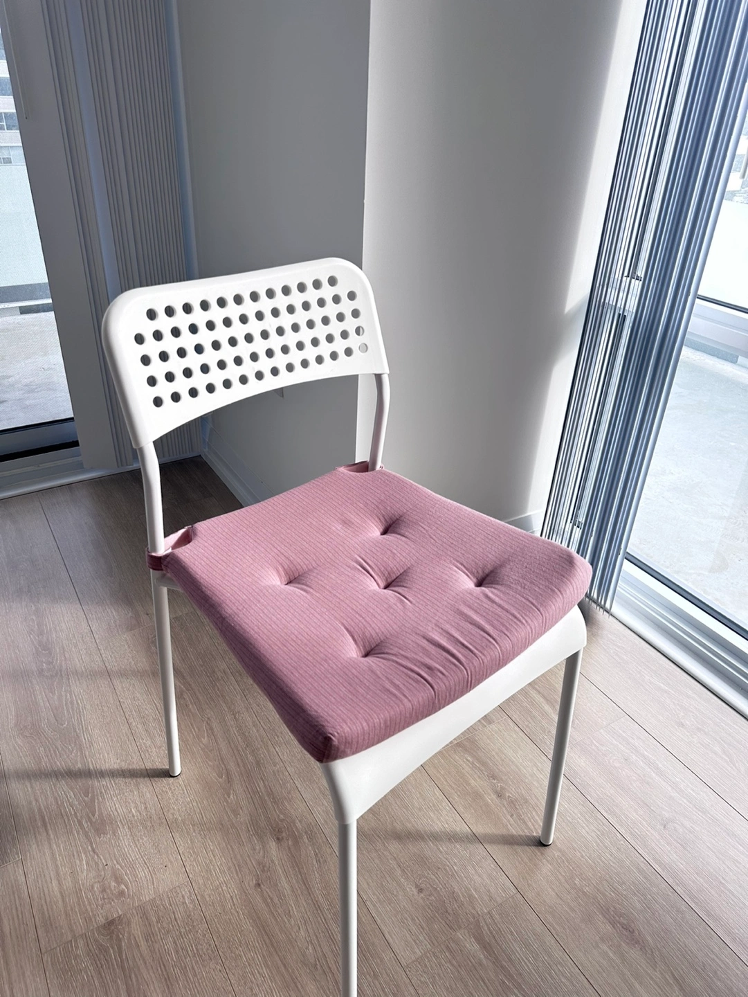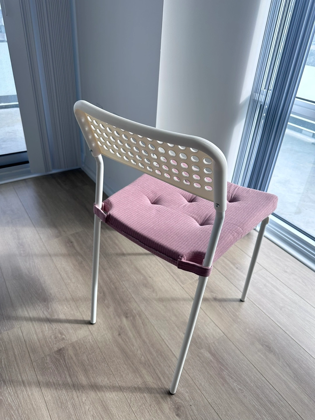 White plastic chair. Includes a pink mauve cushion also from ikea (removable). Lightweight and easy to move. Great for kitchen, dining room, desk chair.