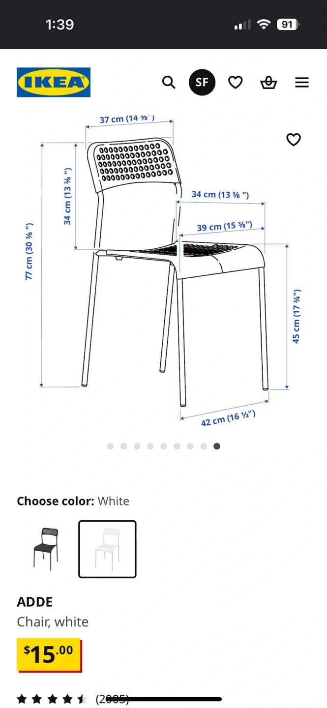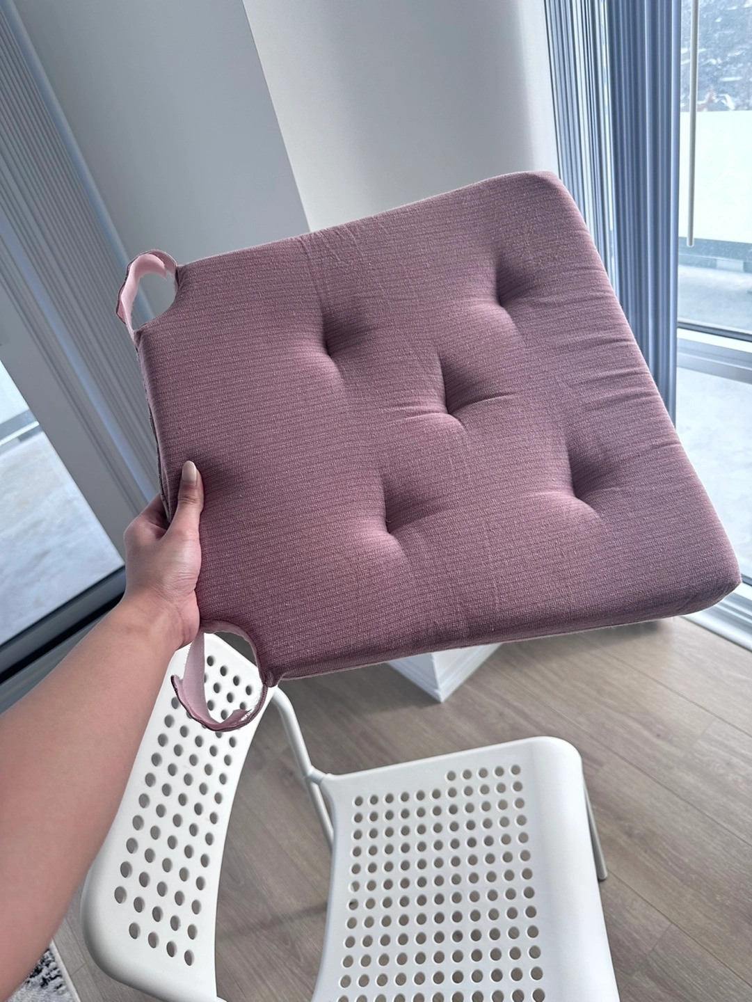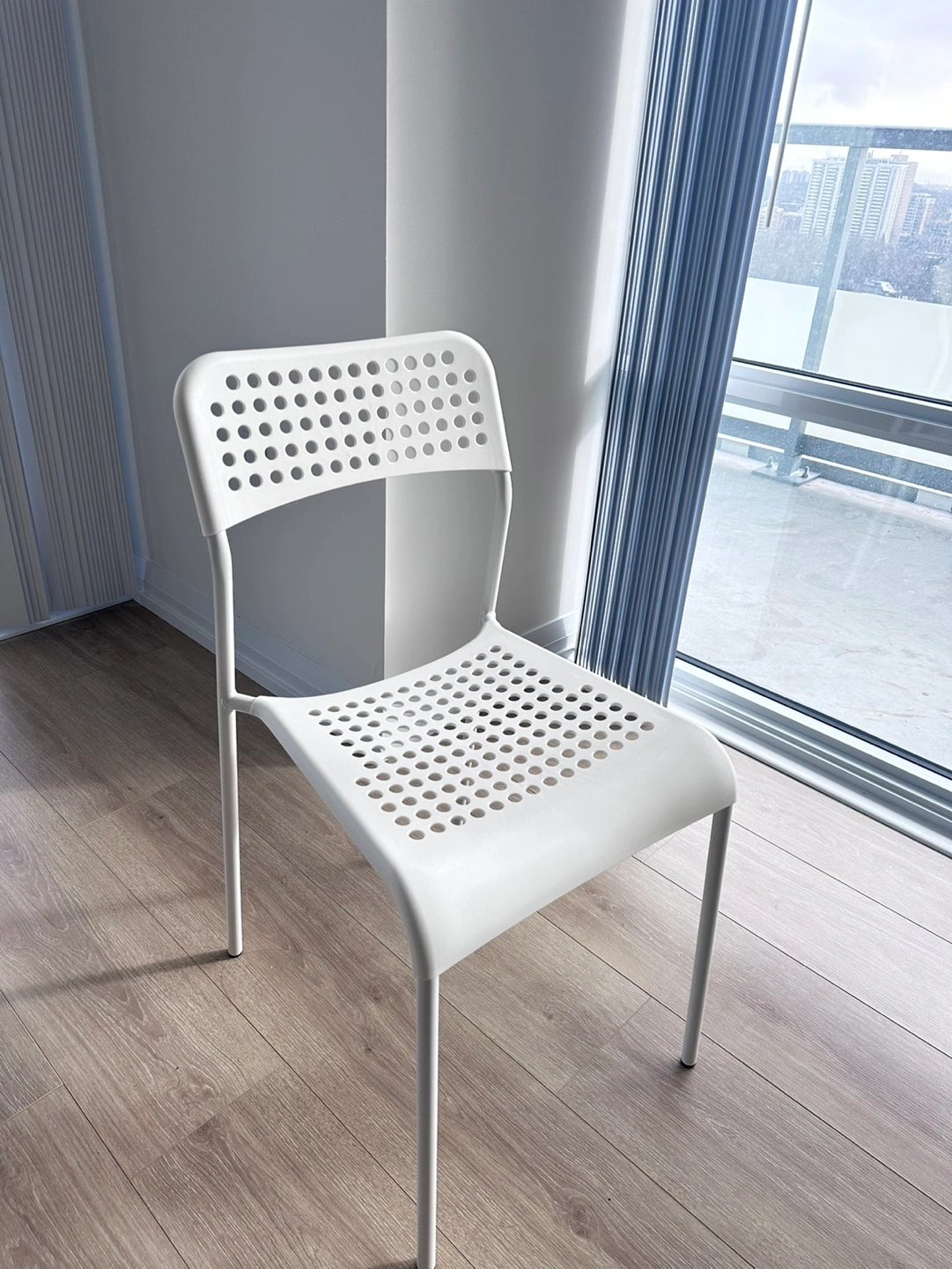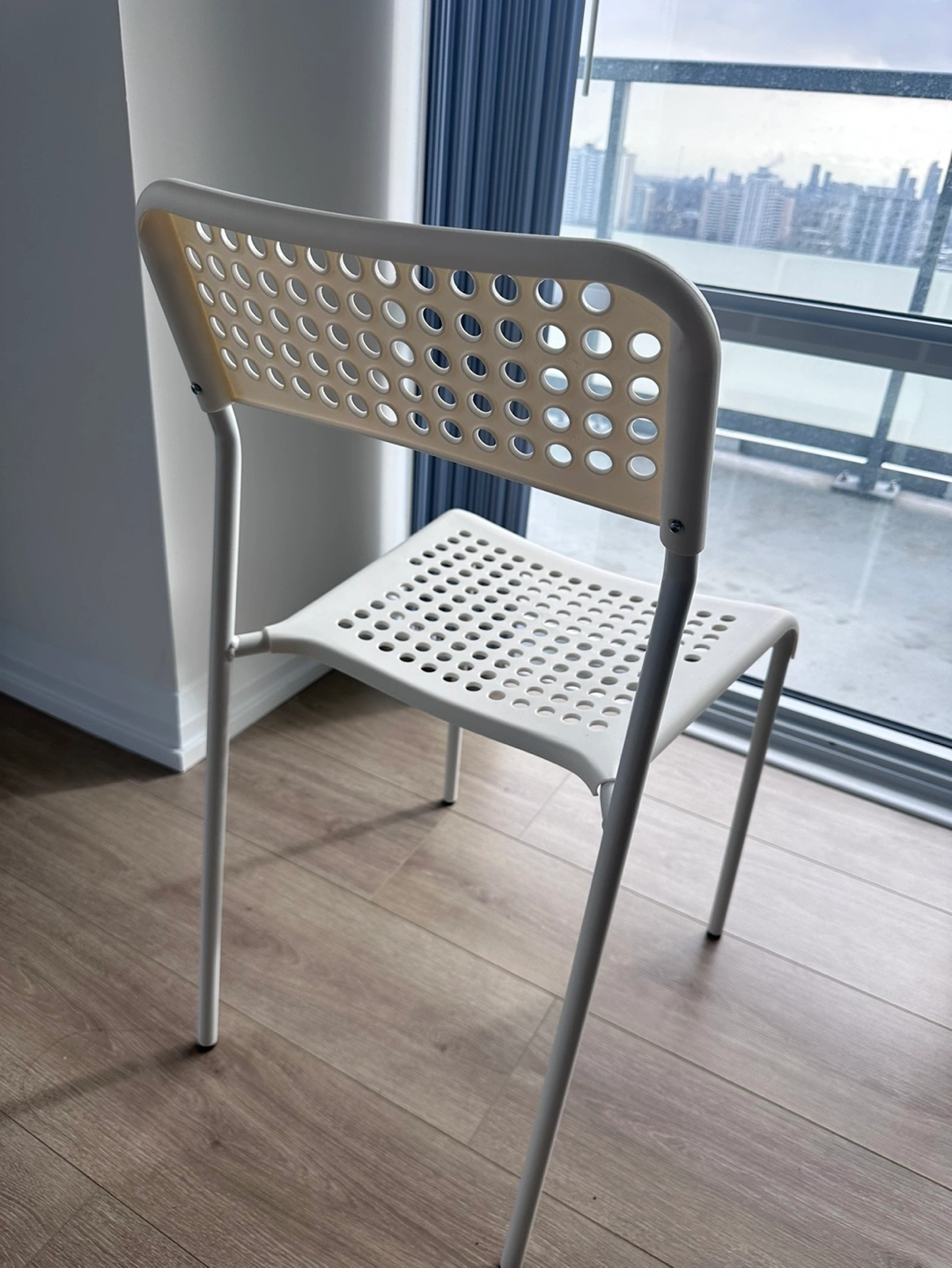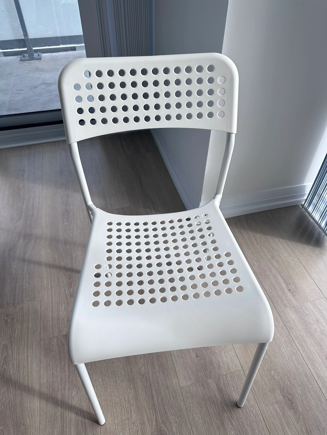 White plastic chair. Includes a pink mauve cushion also from ikea (removable). Lightweight and easy to move. Great for kitchen, dining room, desk chair.
