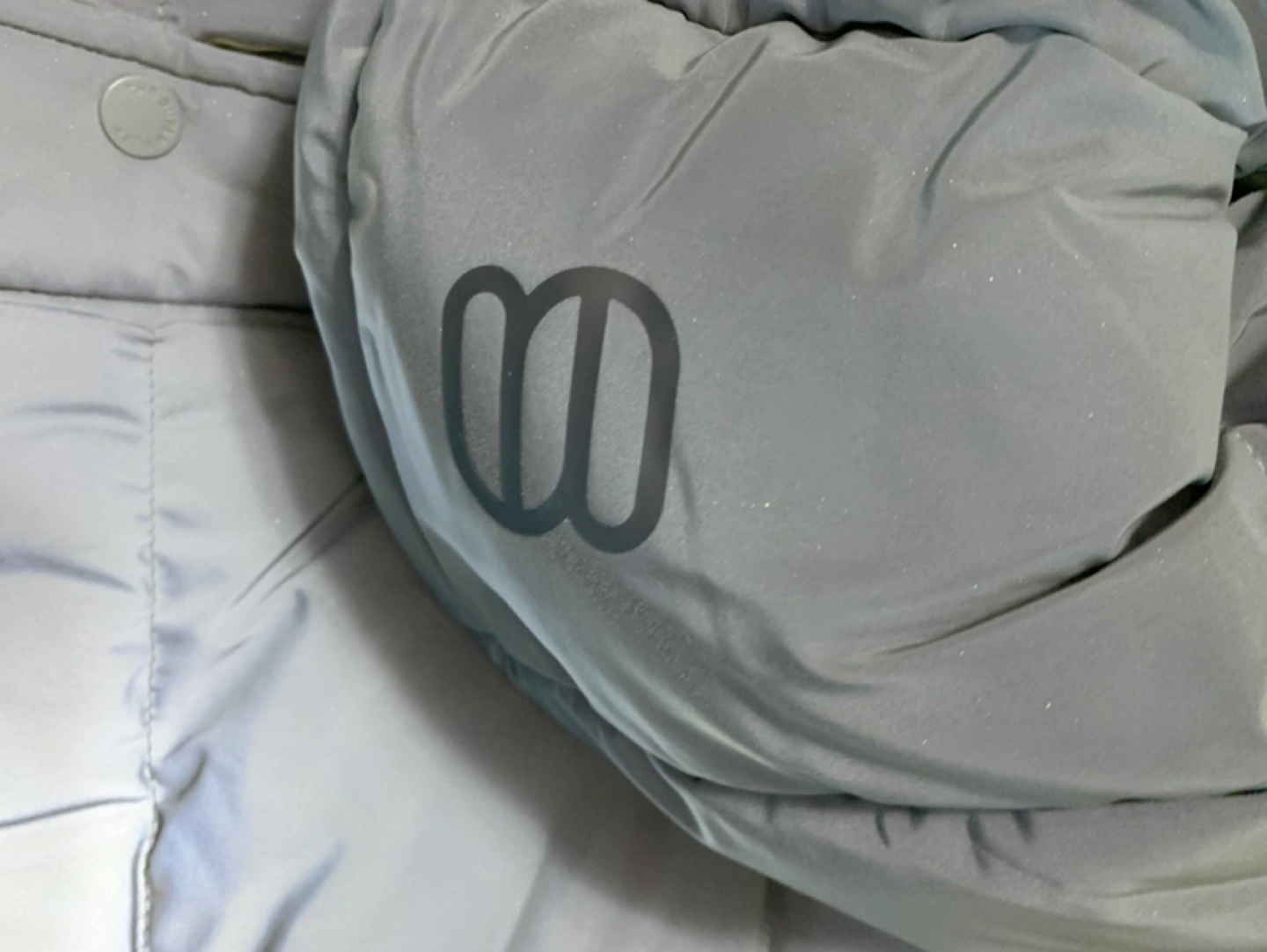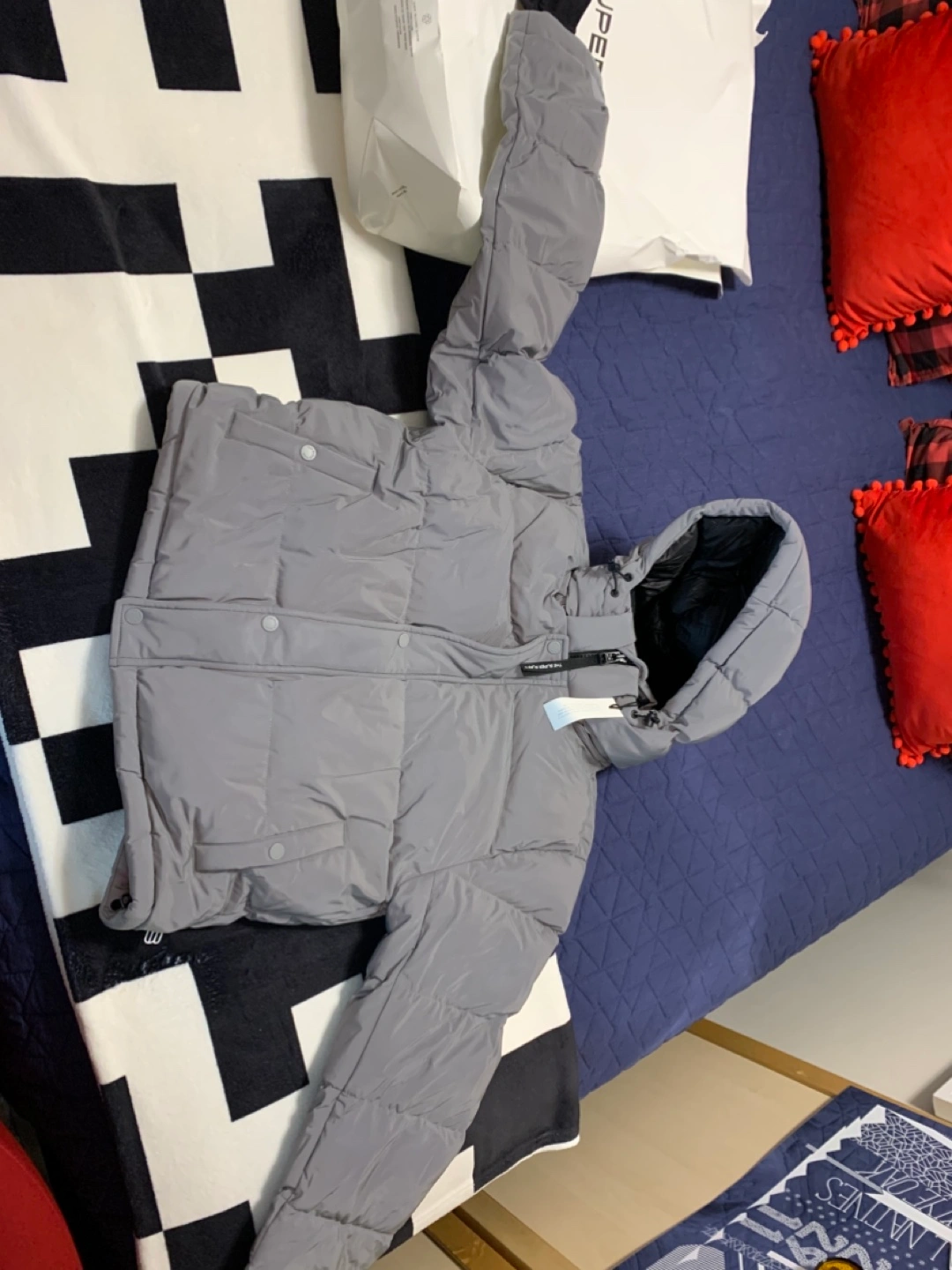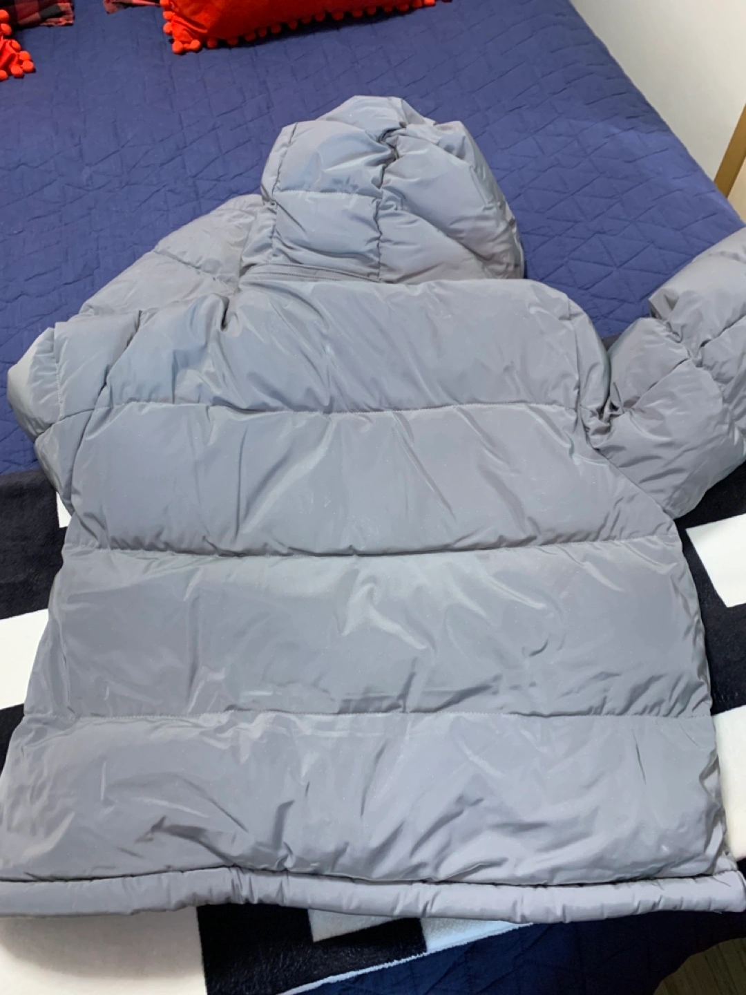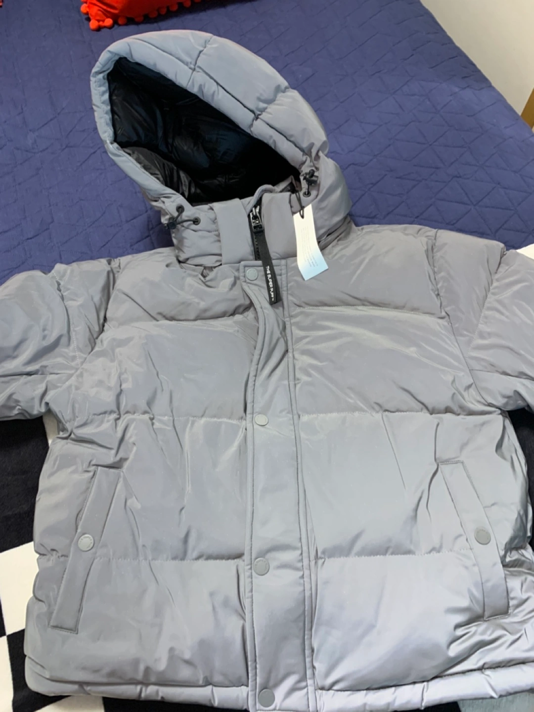 Grey silver puffer jacket. Features a hood and zipper closure. Reflective material. Excellent condition.