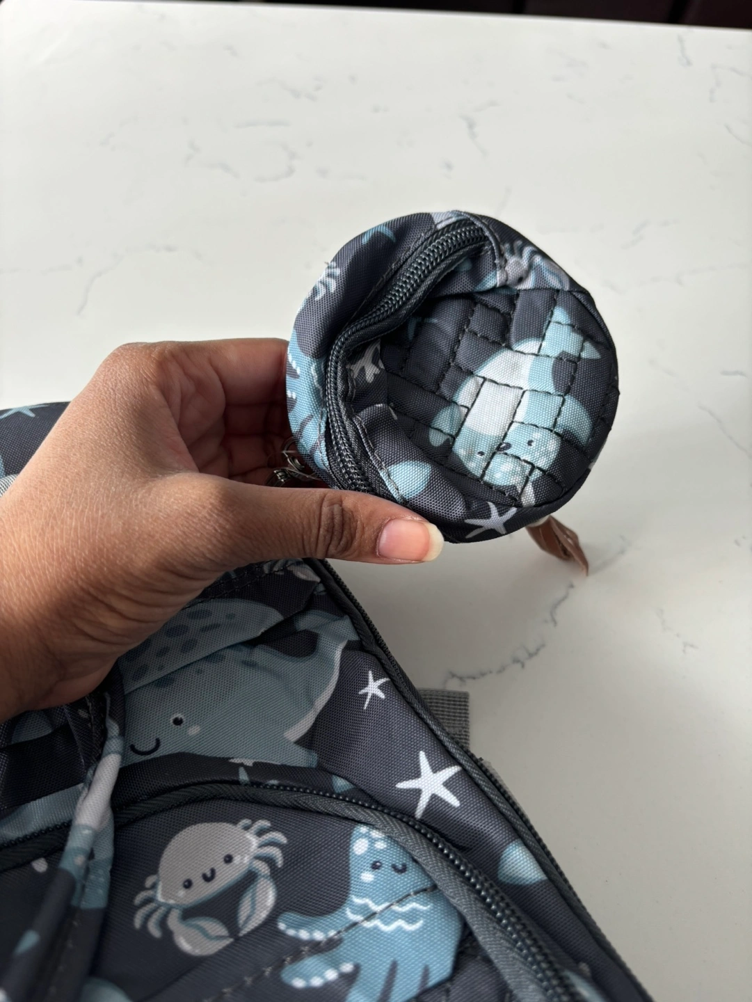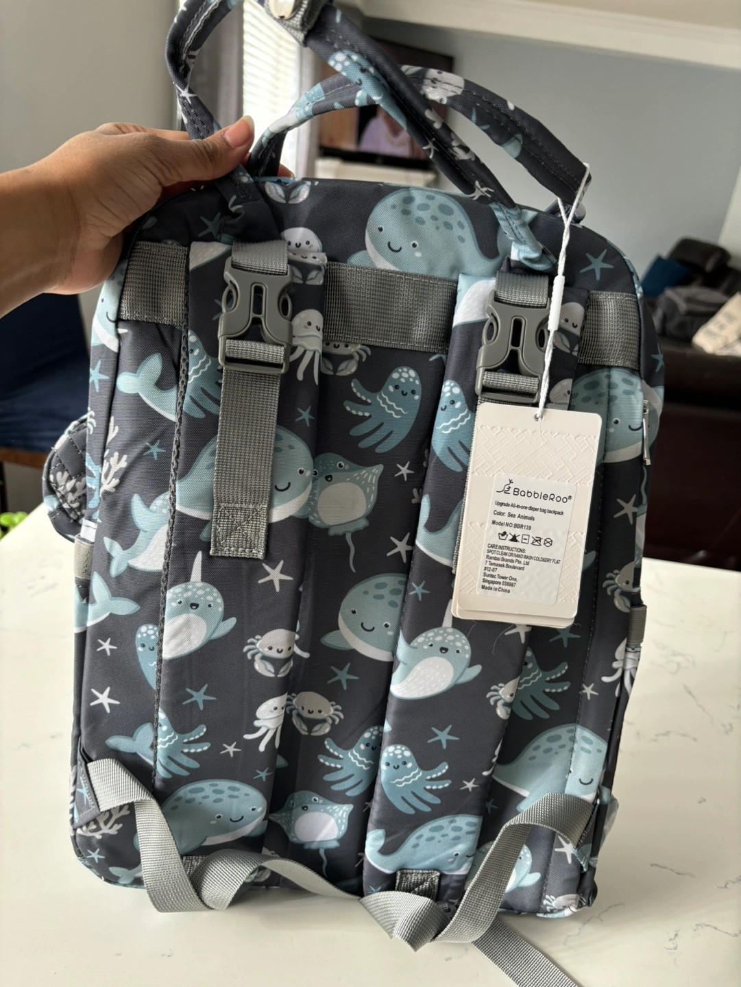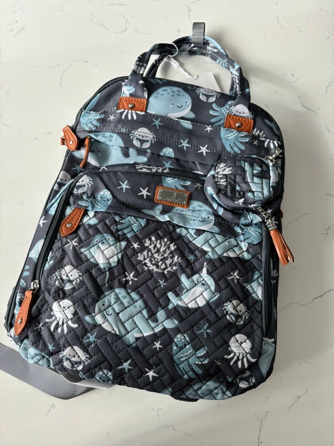 Cute diaper bag, ocean-themed print. Features multiple pockets and compartments. Includes a coordinating changing pad and small zipper pouch. Great for parents on the go.