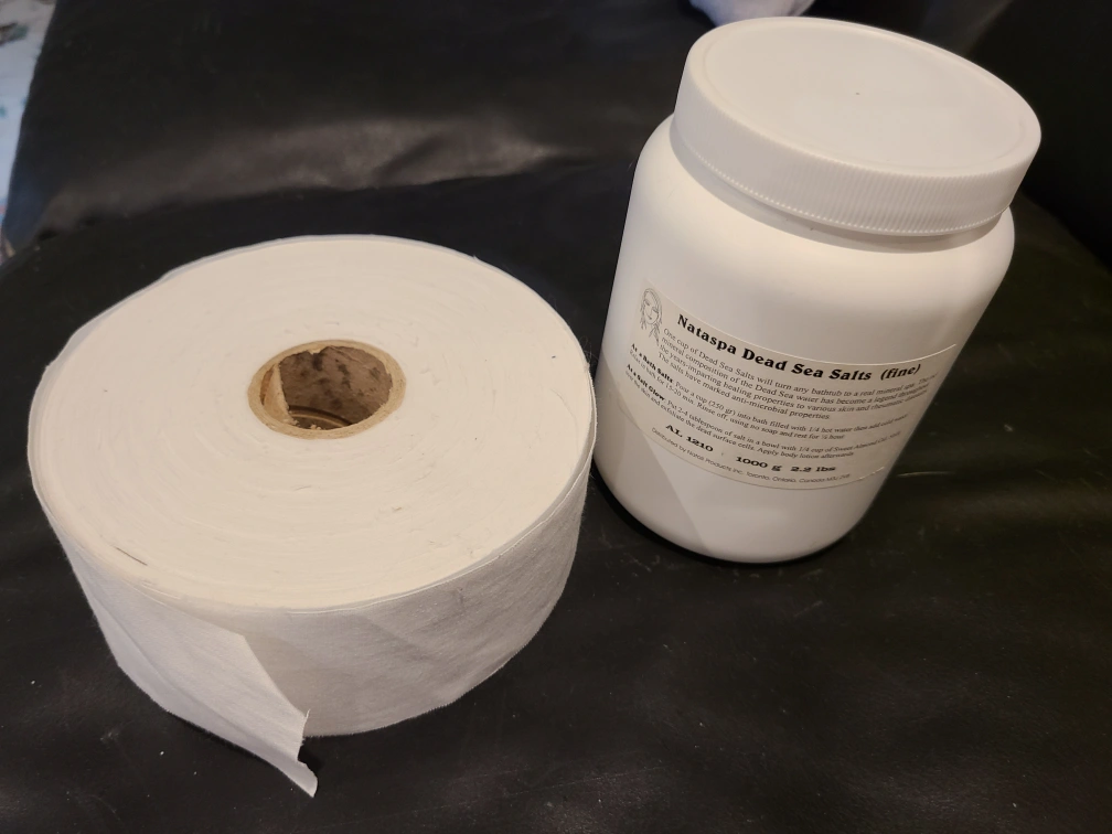 455Large container of Nataspa Dead Sea Salts for exfoliation or bath. $20 a roll of white cotton fabric strip for waxing hair removal. $20 firm price
