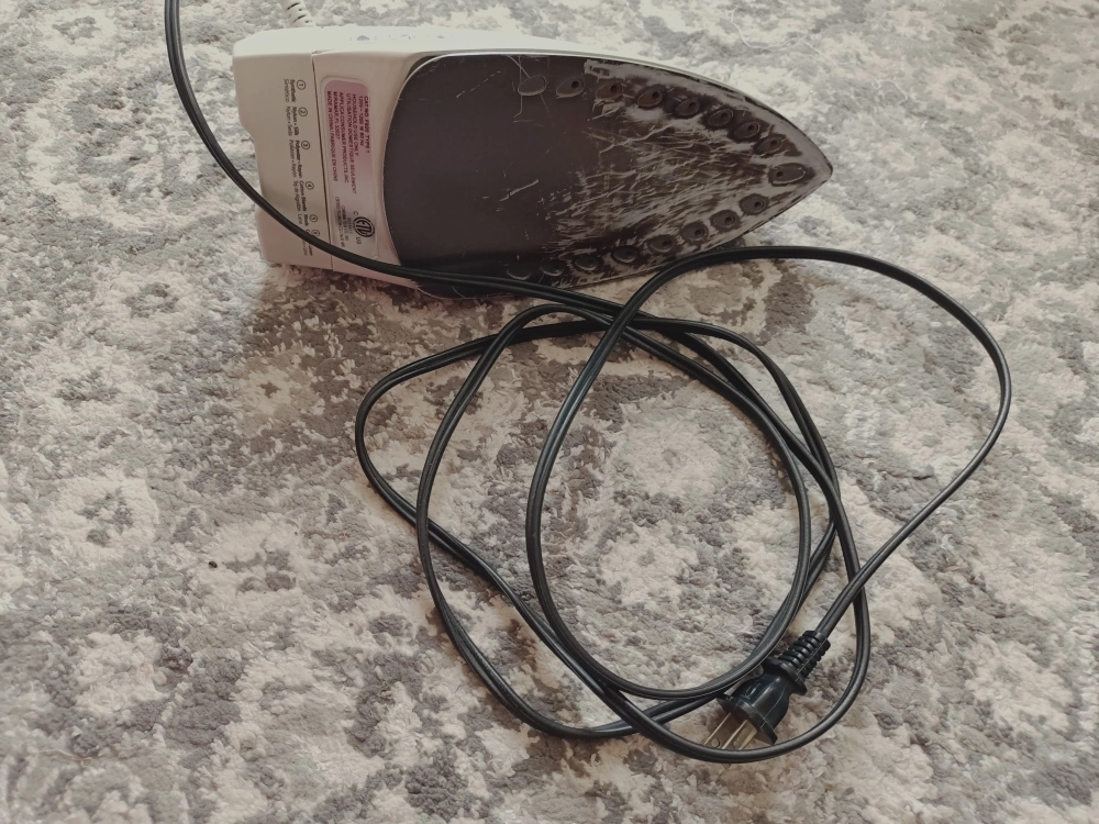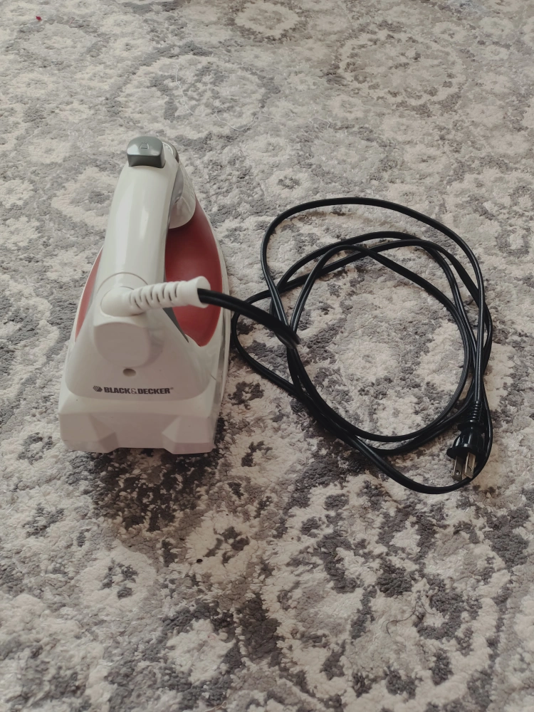 Used Black + Decker iron. Red and white color scheme. Long power cord. Minor cosmetic damage to soleplate.