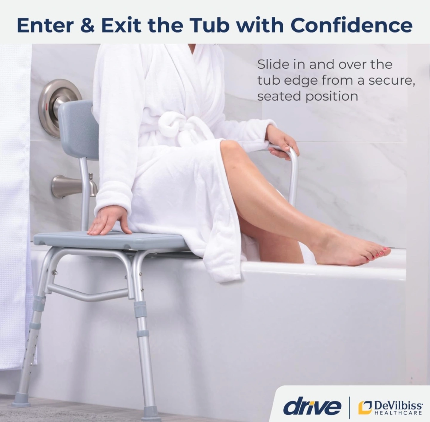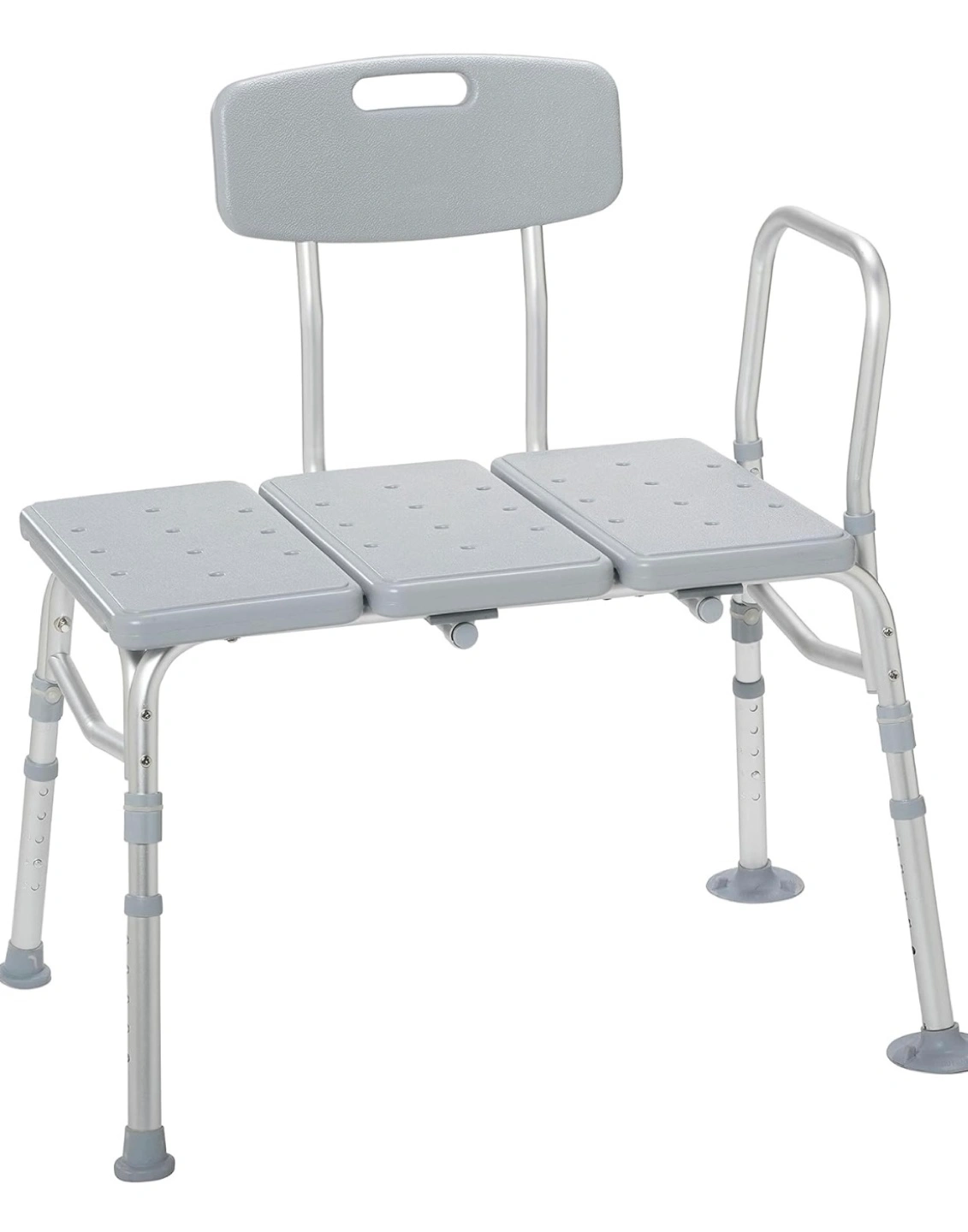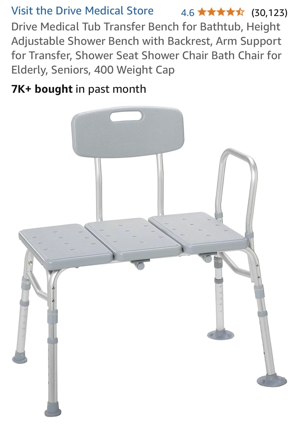 Three-piece shower bench. Aluminum frame. Gray plastic seat and backrest. Adjustable height. Includes armrest. Good for seniors and elderly. Purchased in November 2024 used a handful of times. $59.99 on Amazon.