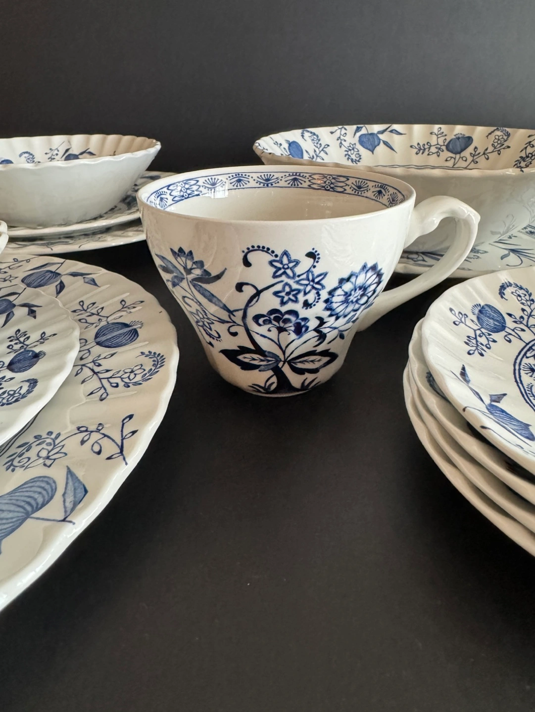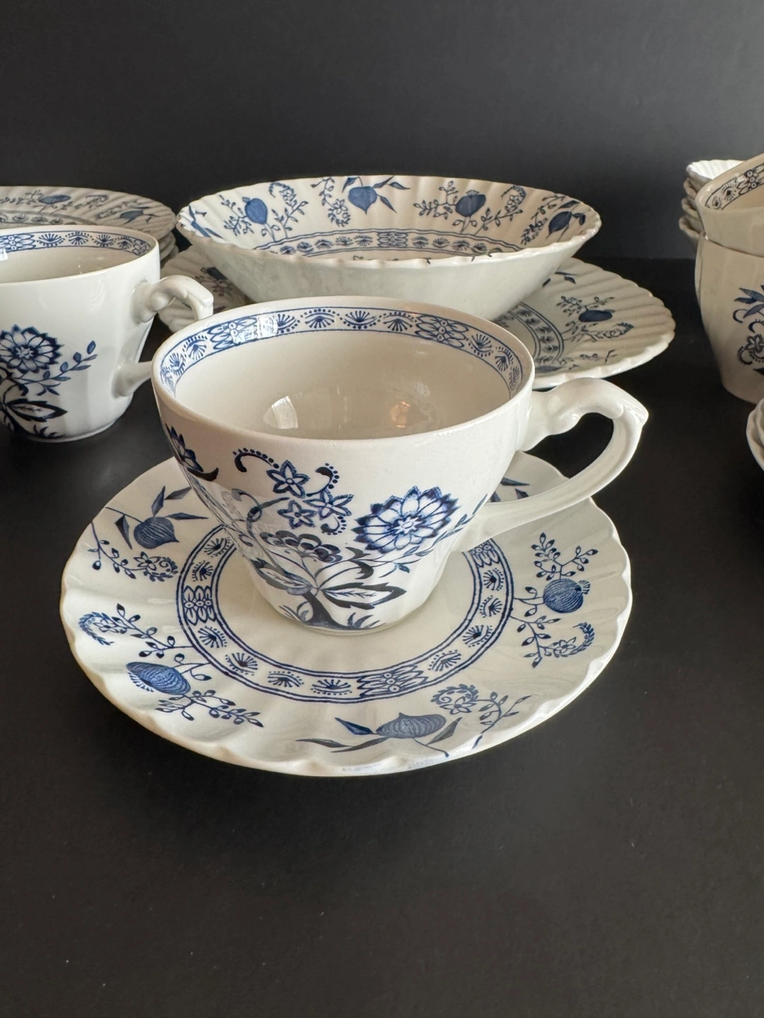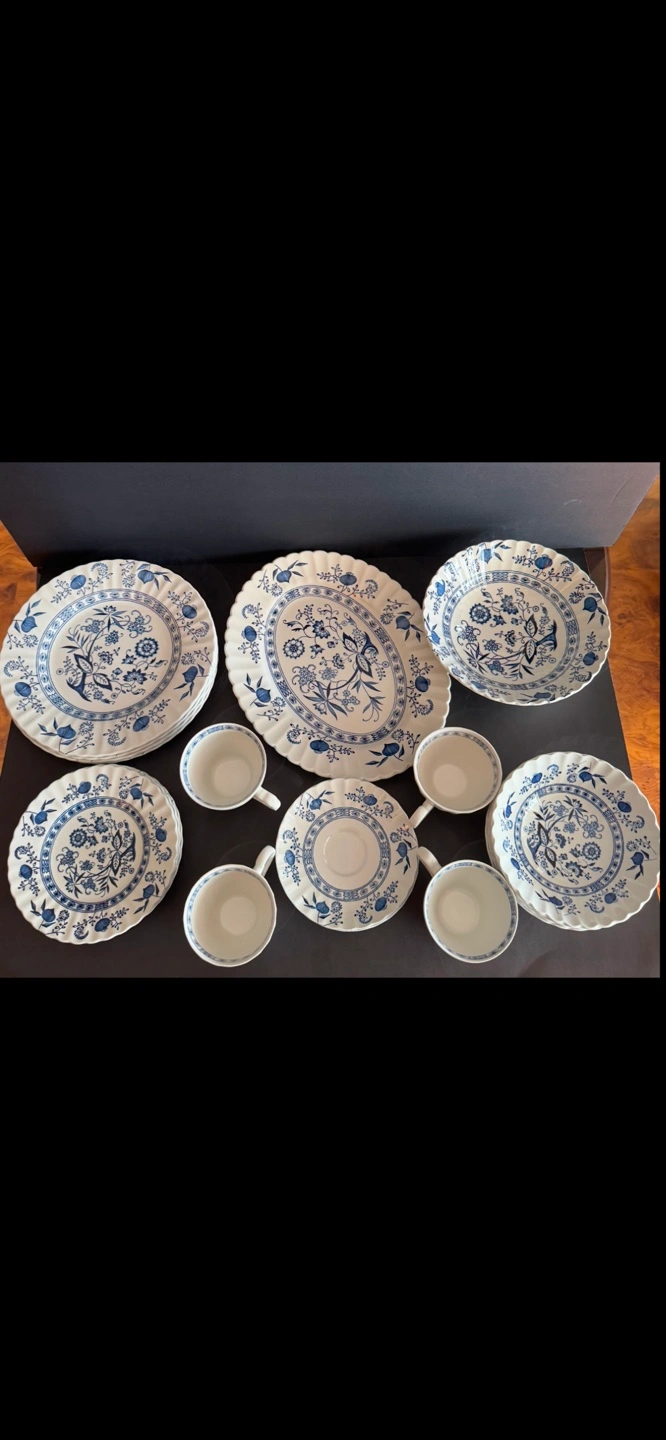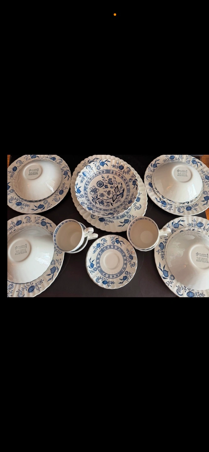 60Beautiful vintage dinnerware set. Features a blue and white floral pattern. Includes plates, bowls, cups, and saucers. Made in England. Hand engraving, dishwasher proof, English ironstone. 22 pieces