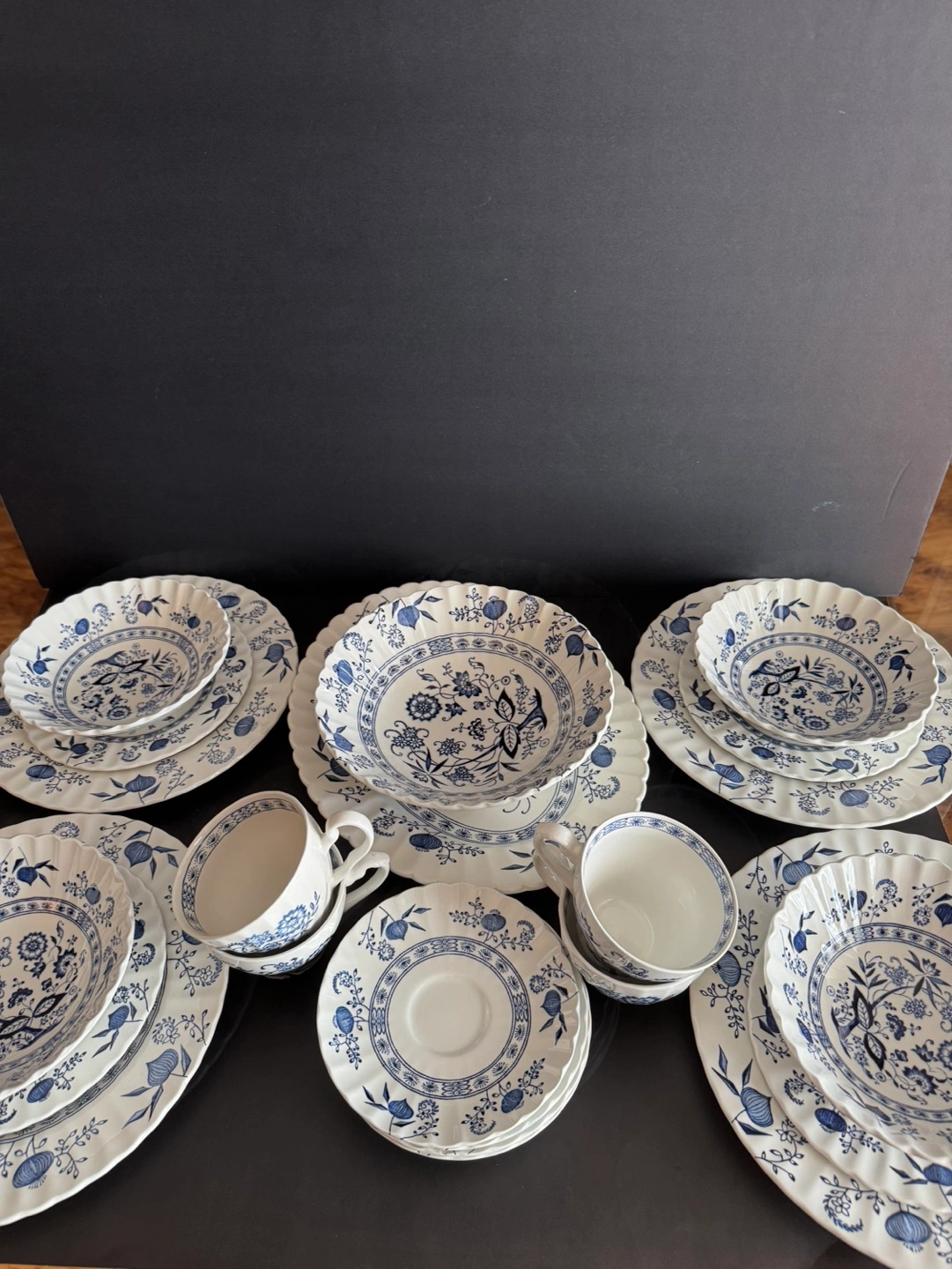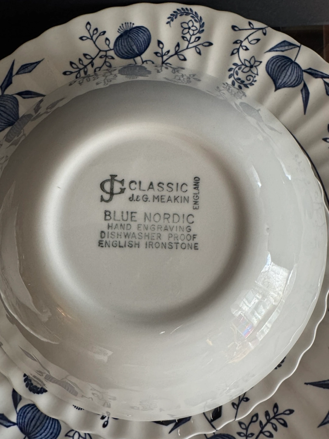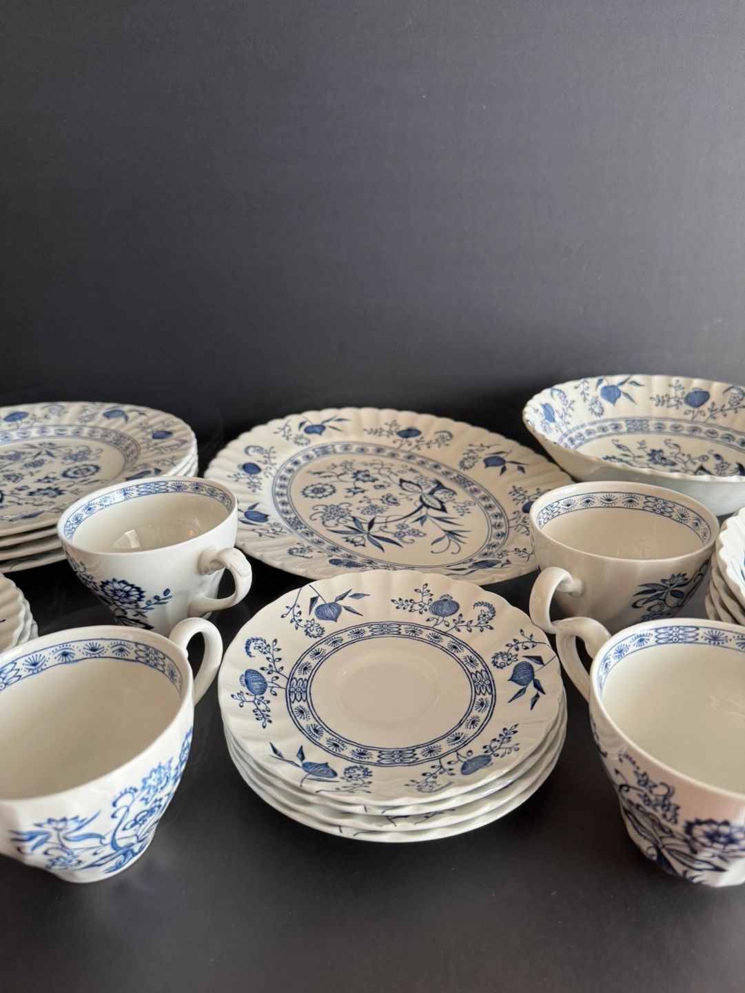60Beautiful vintage dinnerware set. Features a blue and white floral pattern. Includes plates, bowls, cups, and saucers. Made in England. Hand engraving, dishwasher proof, English ironstone. 22 pieces