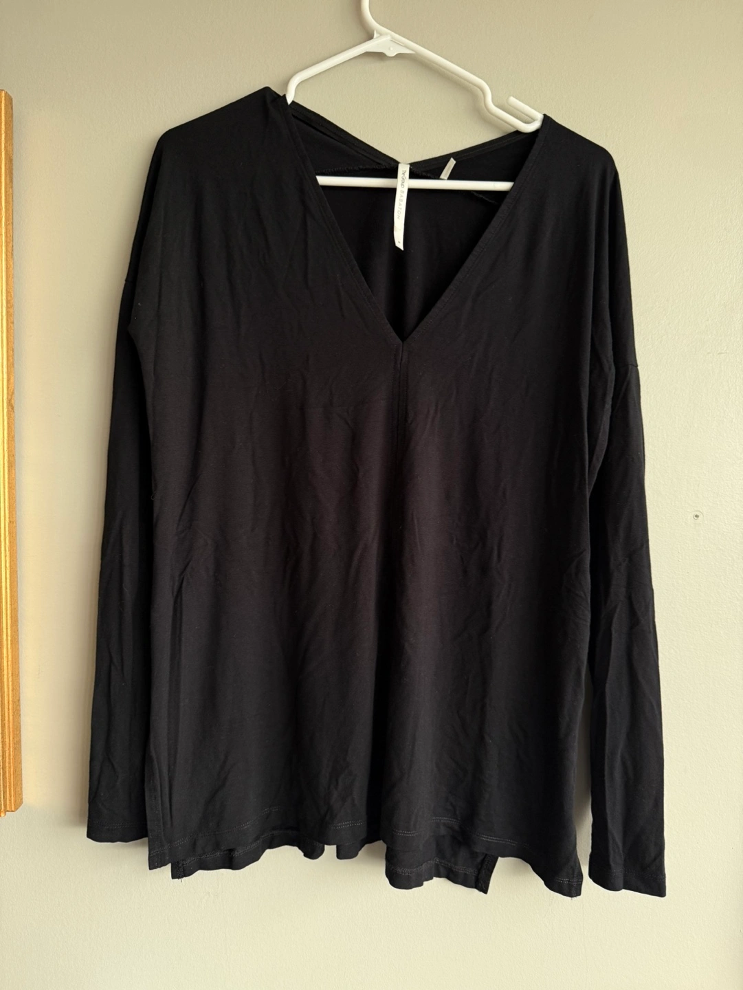 Black long-sleeve V-neck top. Size small. Side slits. Soft material. Excellent condition.
