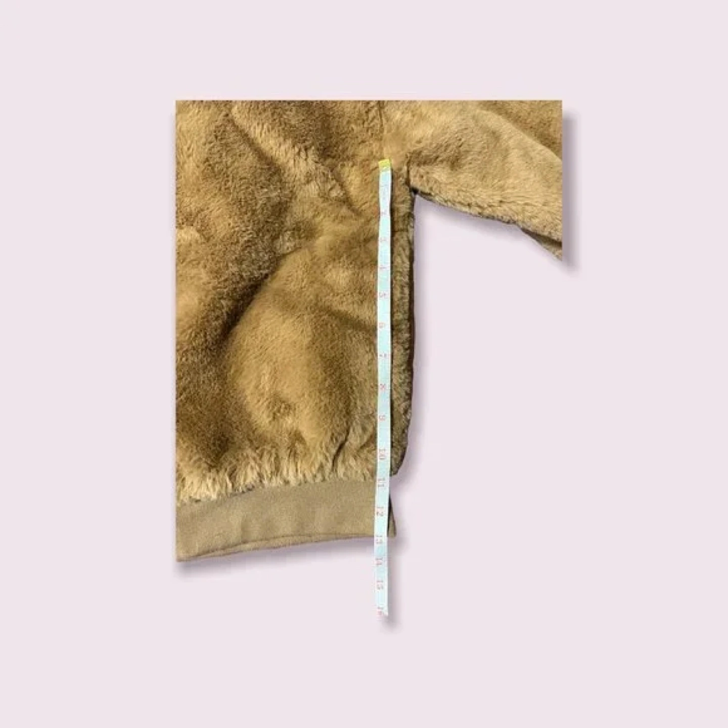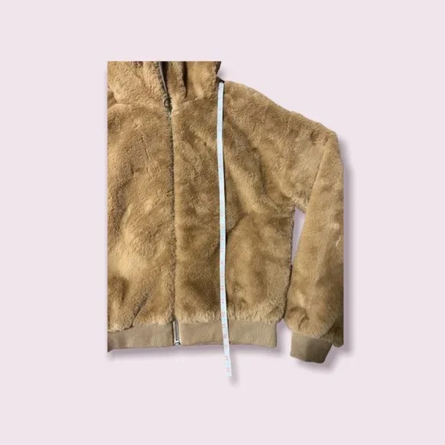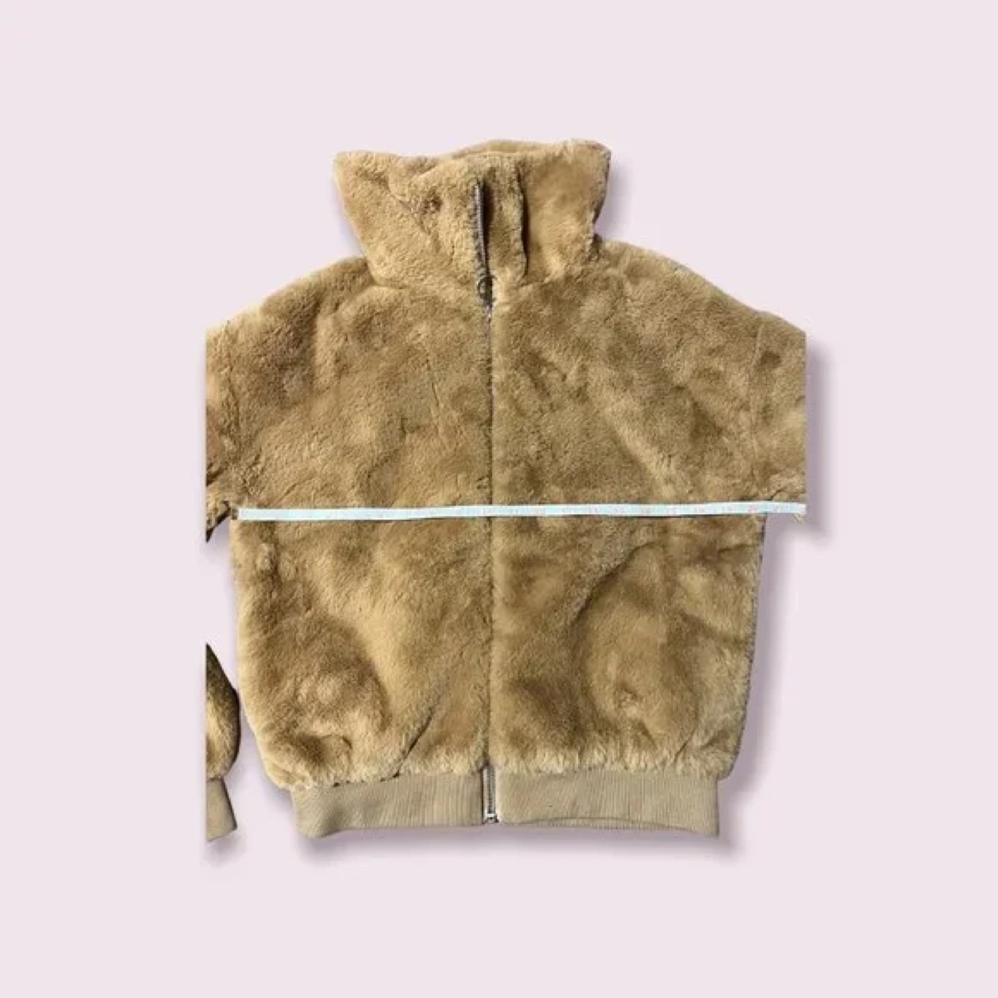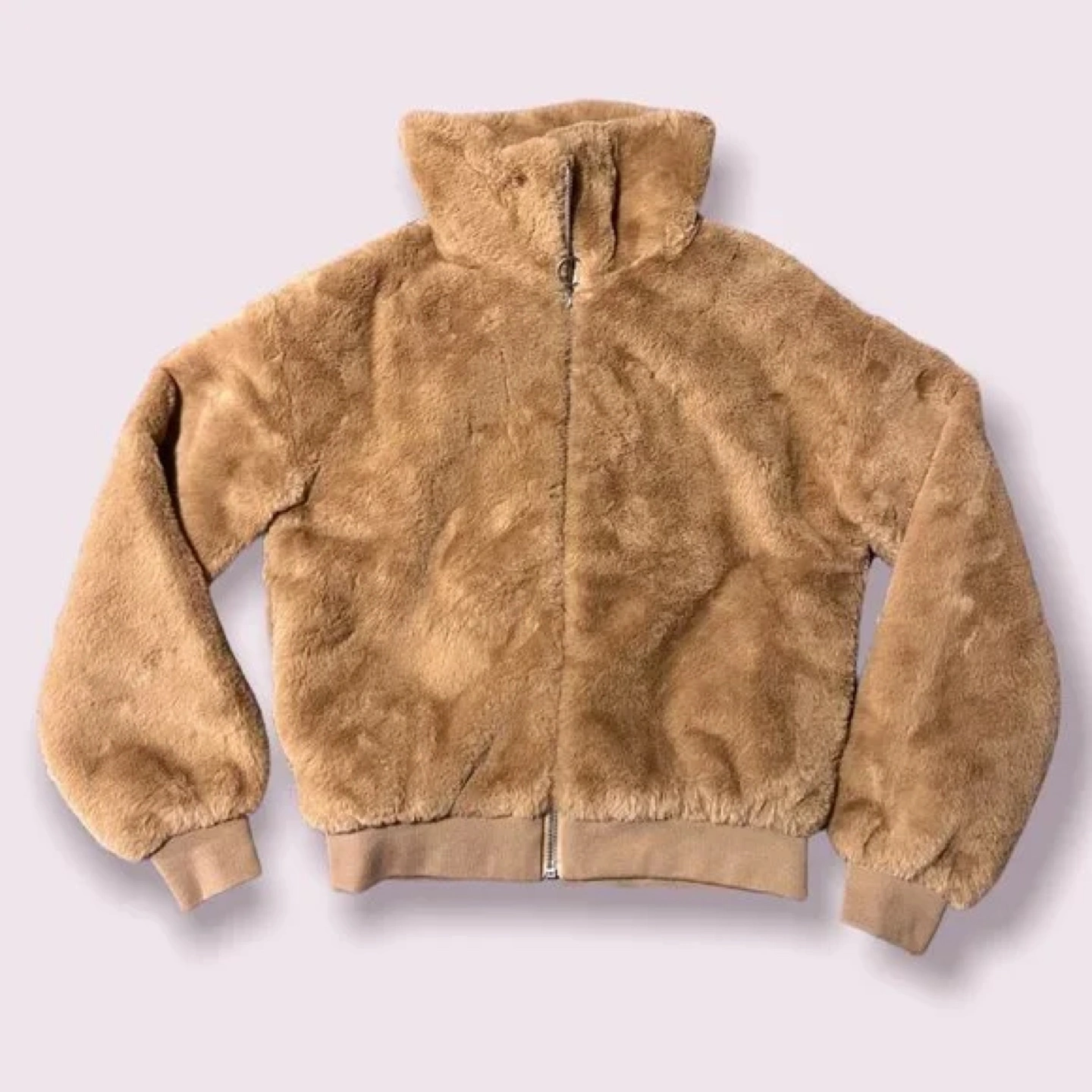 Women's brown zip-up jacket. Soft, fuzzy material. High collar. Ribbed cuffs and hem. Great for fall or winter.