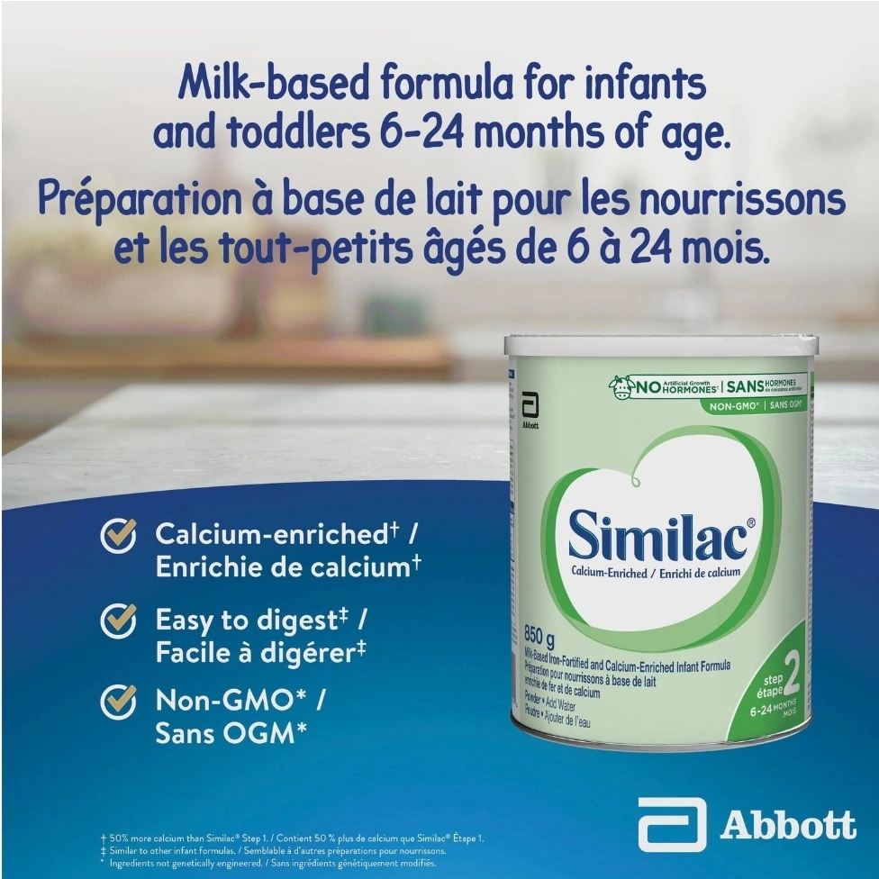 599Milk-based formula for infants and toddlers 6-24 months. Calcium-enriched, easy to digest, and non-GMO. 850g container.