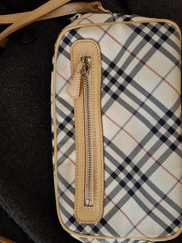 Pre-owned Burberry London crossbody bag. Features a beige and black Nova check pattern. Tan leather trim and shoulder strap. Zip closure. Small interior. Some minor wear.