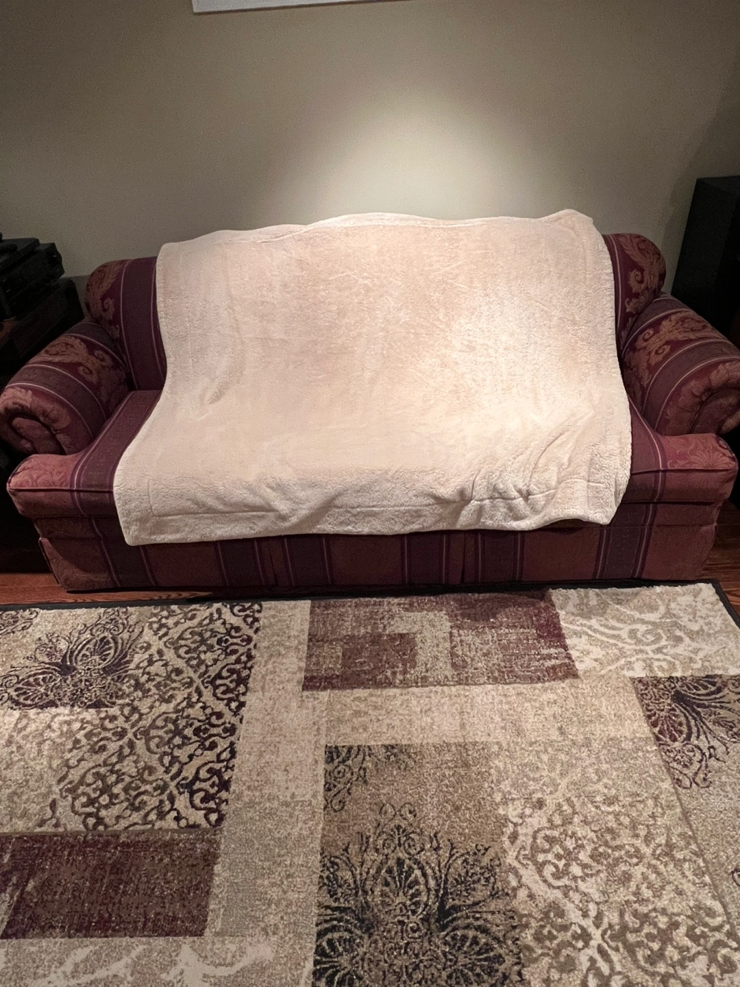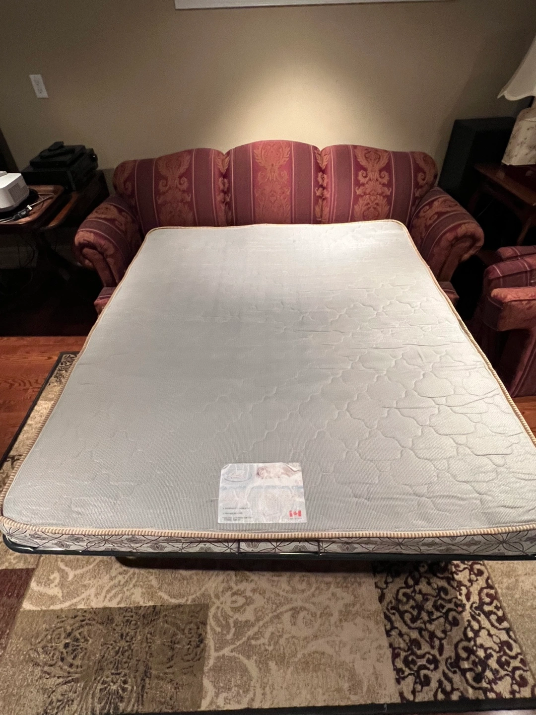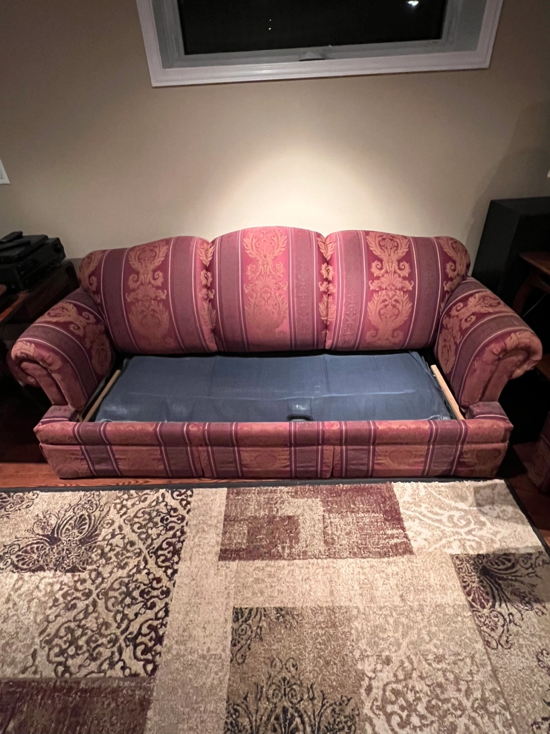 Pull-out sofa bed. Burgundy patterned fabric. Includes mattress. Great for guests.