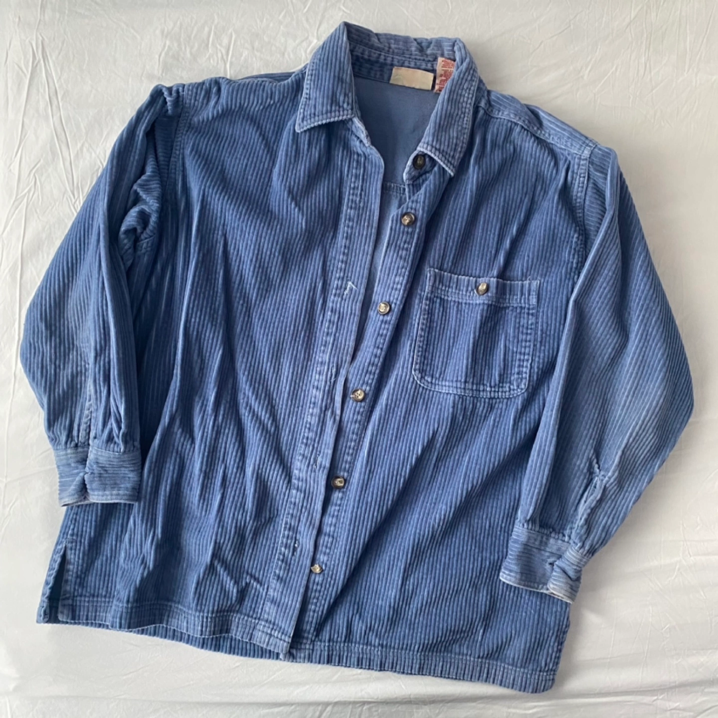 Vintage blue corduroy button-up shirt. Long sleeves, has one chest pocket. Size large, 100% cotton. In great condition, has a small mark in the back as shown