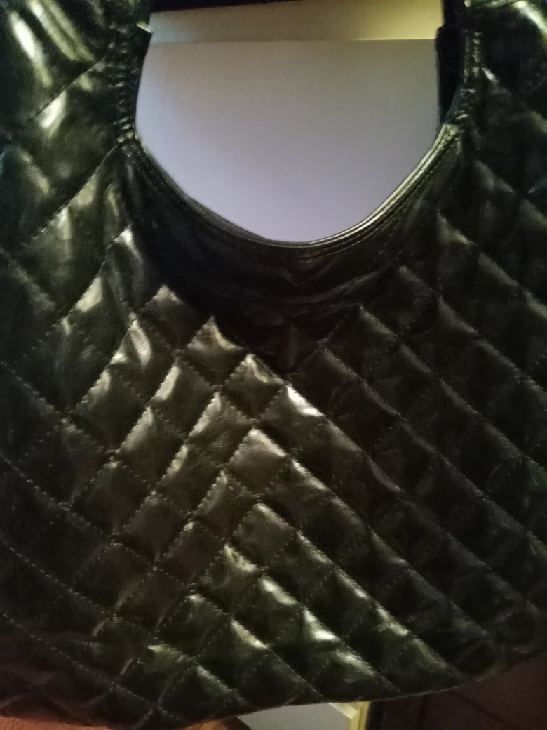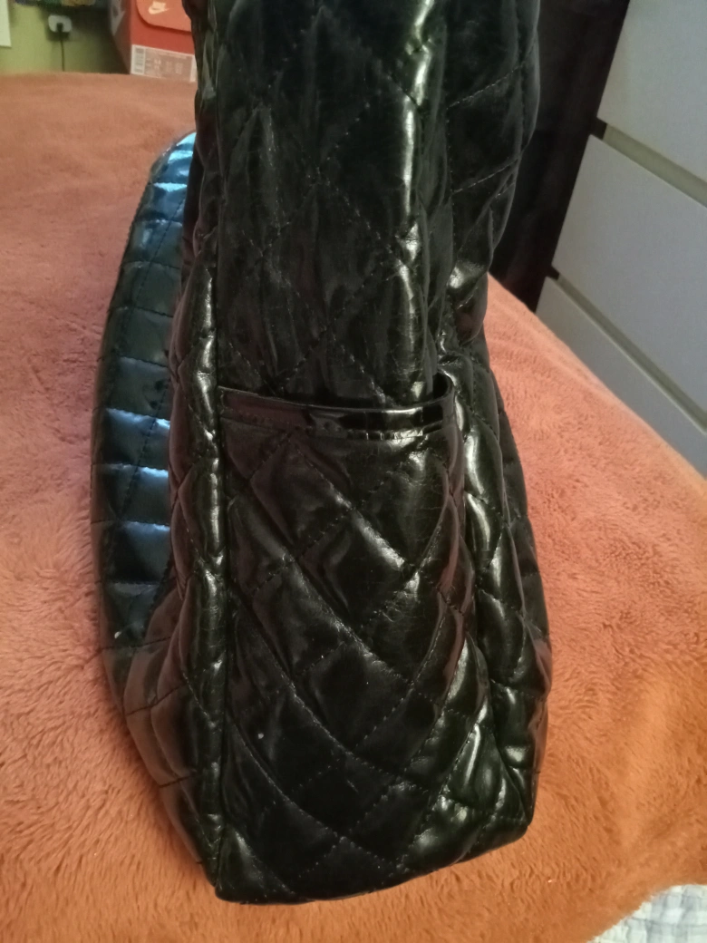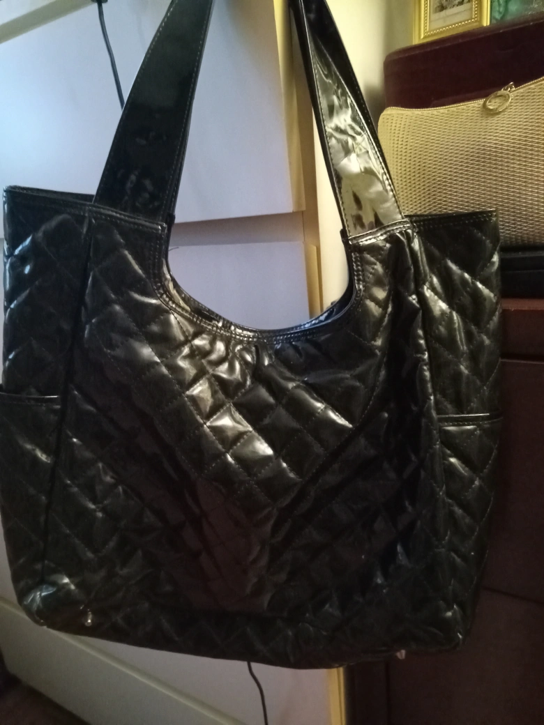 Large black quilted shoulder bag. Features two side pockets. Shiny, possibly patent leather-like material. Good for everyday use.