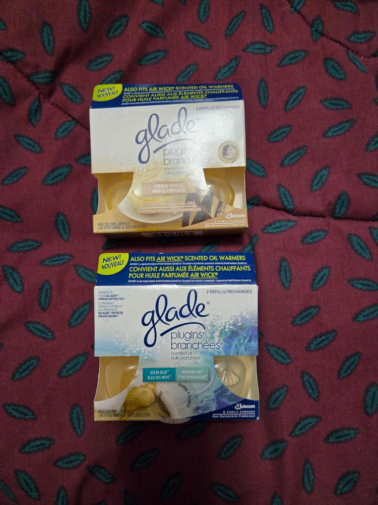 Two Glade Plugins scented oil warmer refills. French Vanilla and Ocean Blue scents. Fits Air Wick scented oil warmers.
