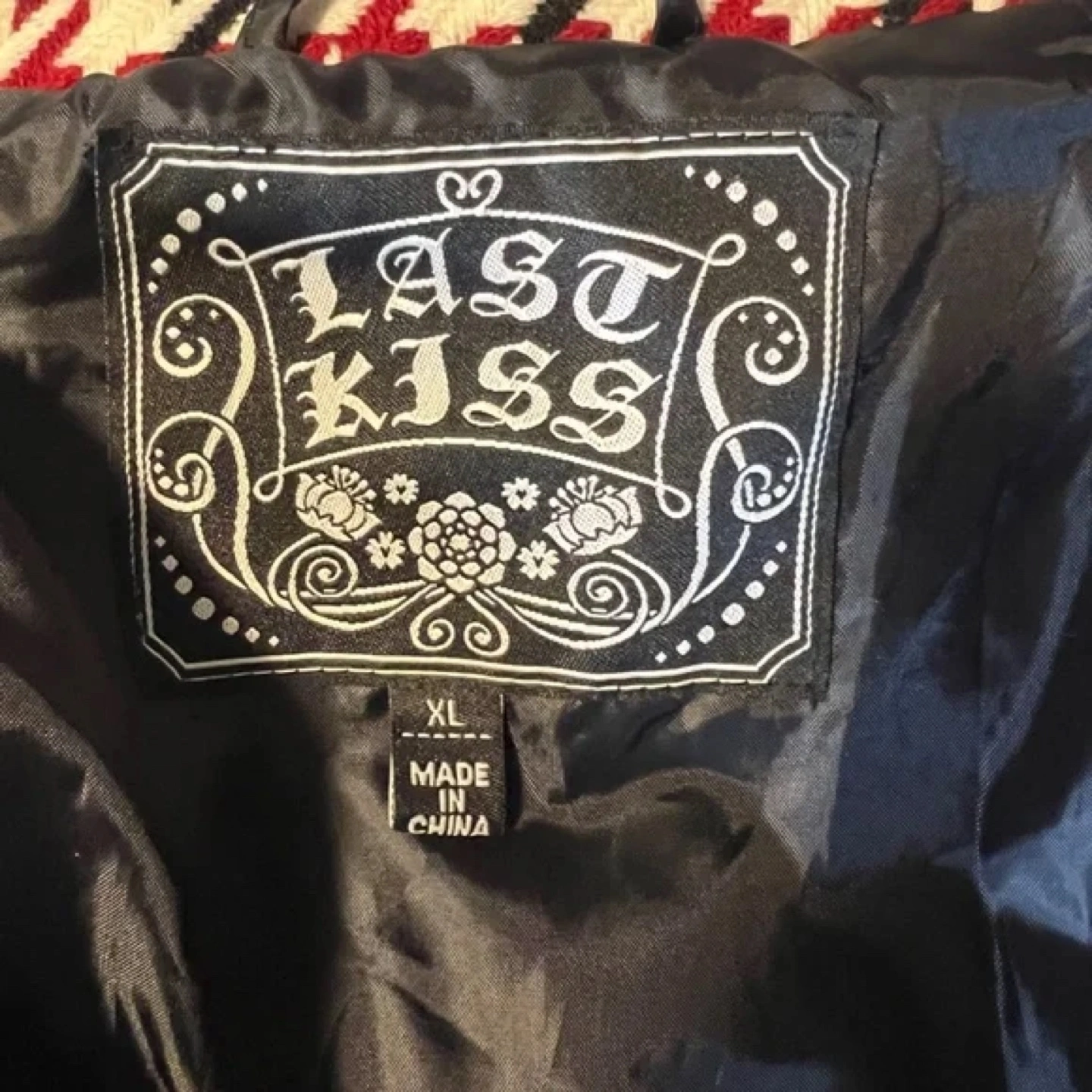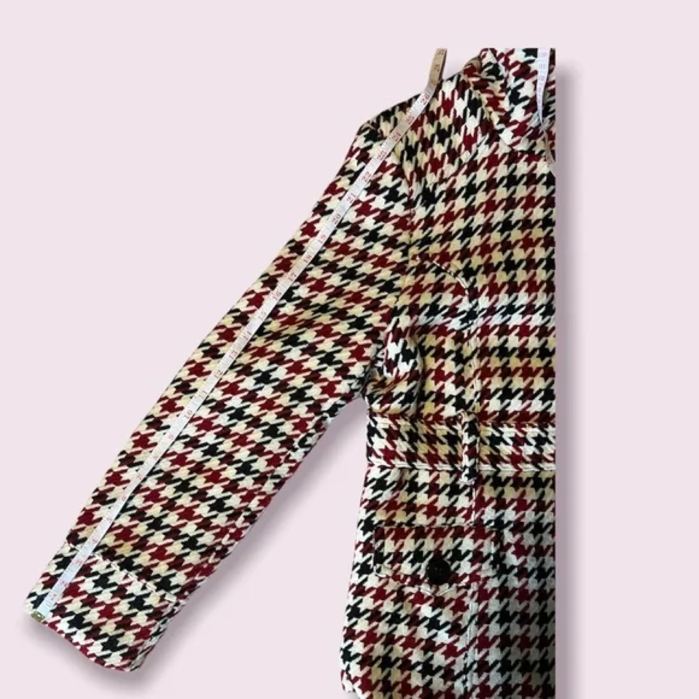 Women's belted jacket. Houndstooth pattern in red, black and beige. Features a mock neck and three-quarter sleeves.