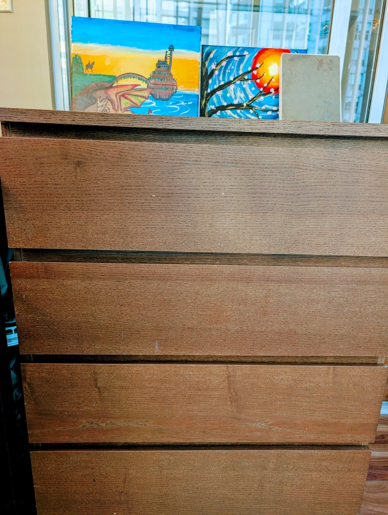 MOVEOUT SALE: Walnut Brown, wooden chest of 4 Drawers - all in good condition. Its timeless design, sturdy construction and ample storage space make it a perfect addition for any living/bedroom. Each drawer glides smoothly for easy access to your belongings.